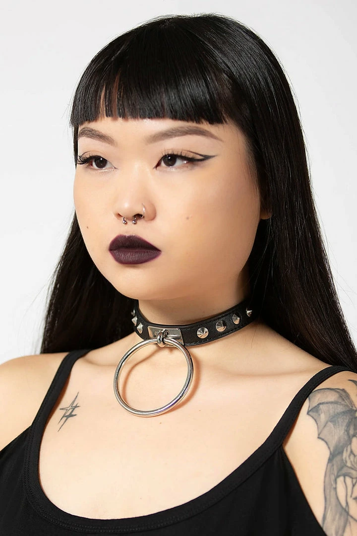 Edgy black choker by Killstar that is made from vegan leather with silver studs and large O-ring detail. Complete your look with this provocative choker with fully adjustable back and faux leather body!