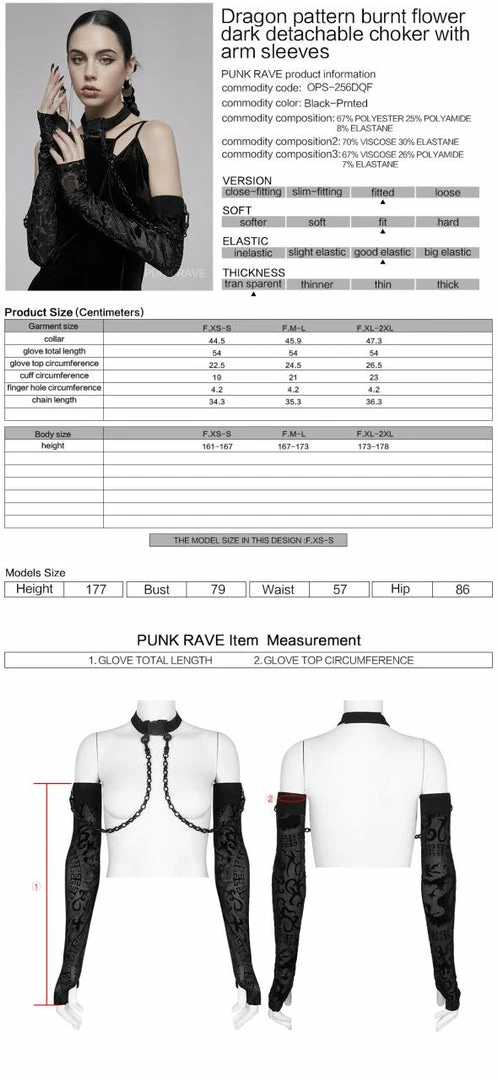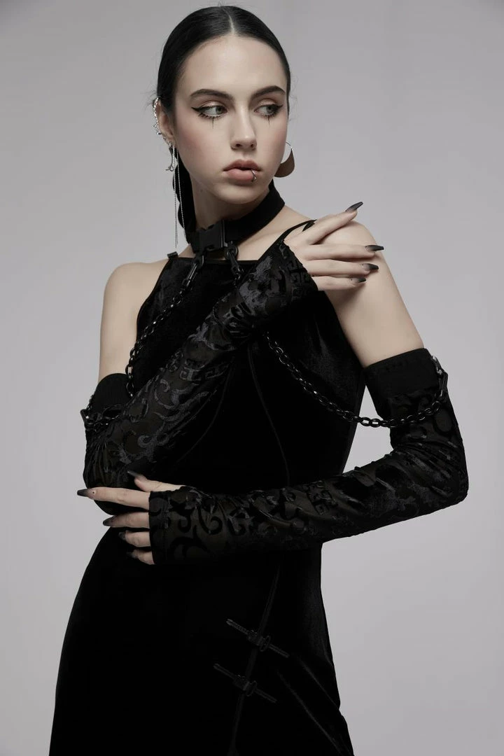 Beautiful mesh sleeves with velvet flocking from Punk Rave featuring thumb holes and detachable chains that links to a buckled adjustable choker. For the perfect fit and fabric composition, please see Punk Rave’s size guide in the images.