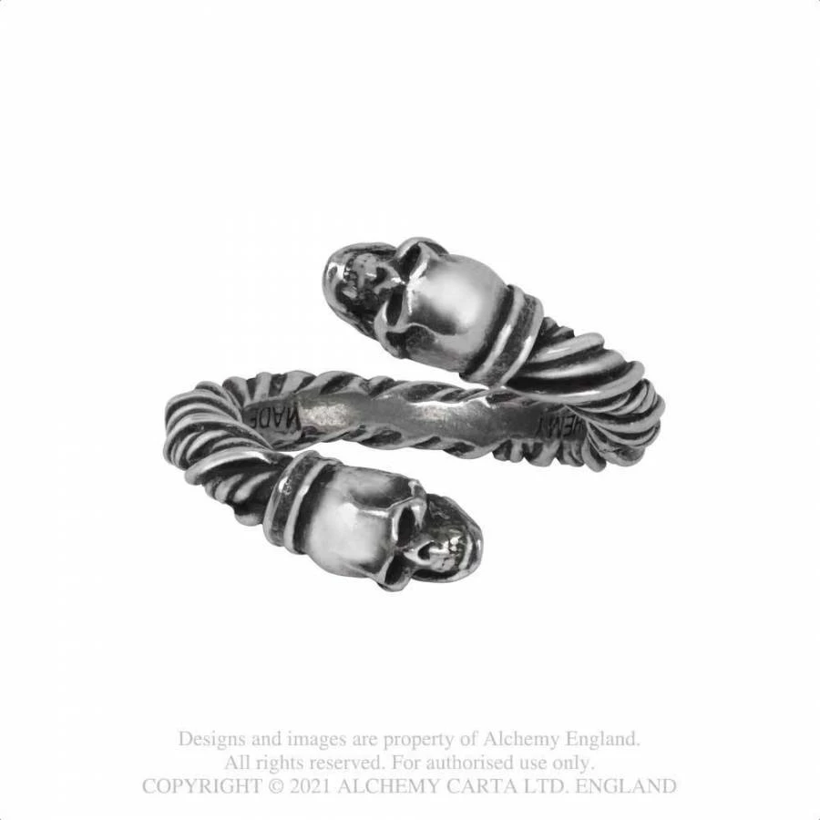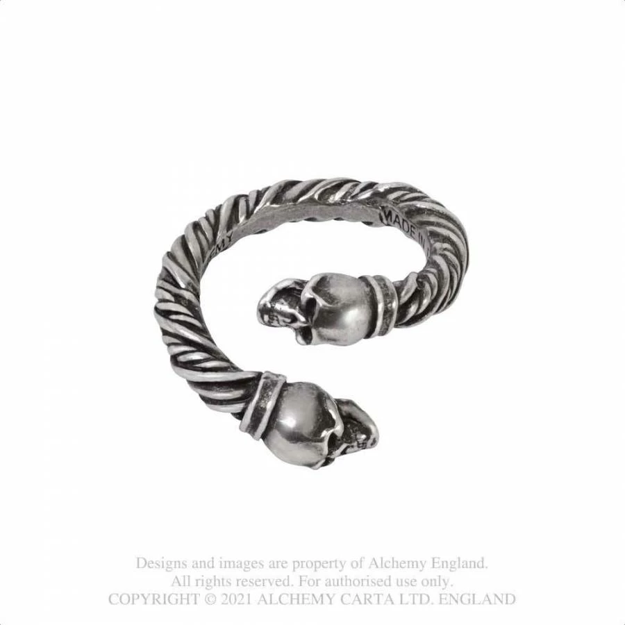Exhibit your strength and power whilst wearing this Viking style ring. A polished pewter Viking torque firmly grasps your finger, with miniature skulls on each end.