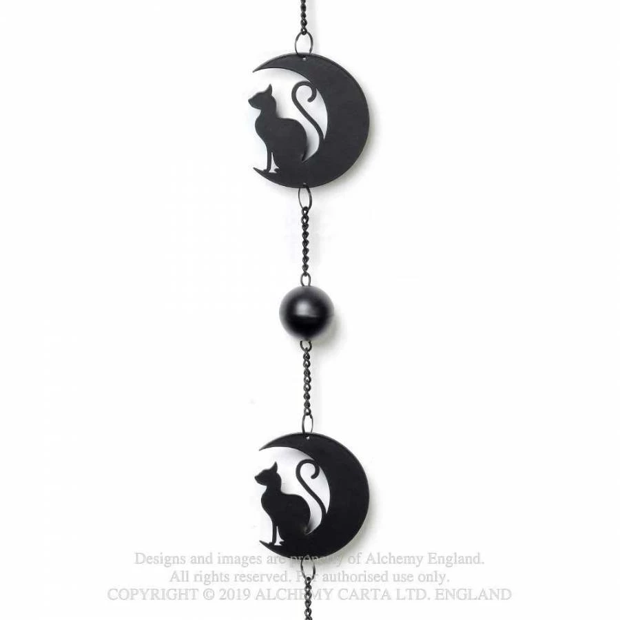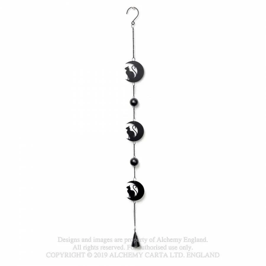This simple but stunning hanging decoration from Alchemy will look incredible in your home, boudoir, garden or crypt. Featuring three, cats on a crescent moon, ball and chain connections, and cone and leaf chime. Black powder coated metal. Suitable for both indoor and outdoor use.