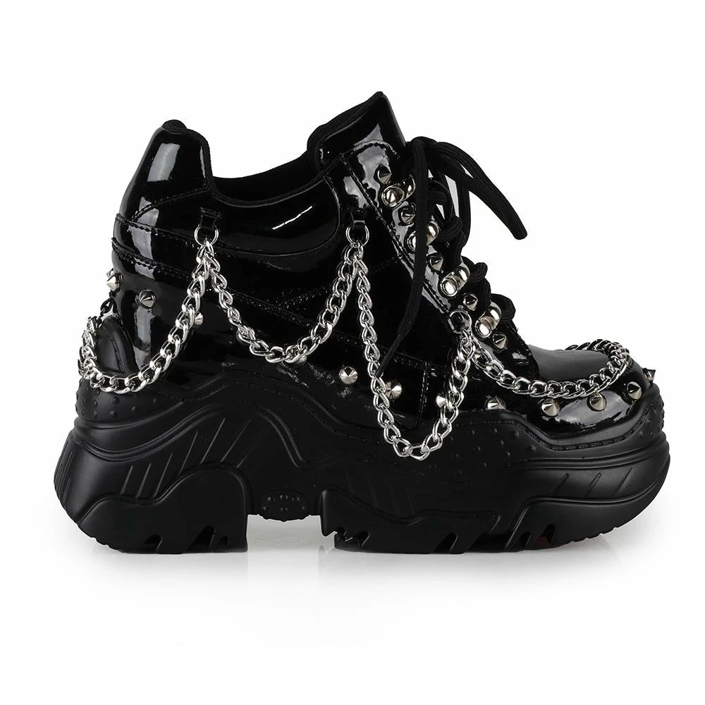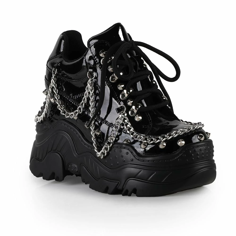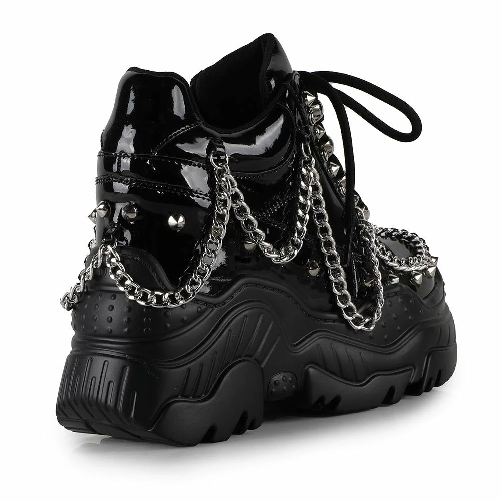 We cannot get enough of these awesome sneakers from Anthony Wang, with their fab hidden wedge heel! Shiny black lace up sneakers with 2 inch (5.5cm) platform and 5 inch (13cm) hidden wedge heel, because we’re sneaky like that! Features shiny silver stud detailing all around, silver dangling chains and black lace up closures.