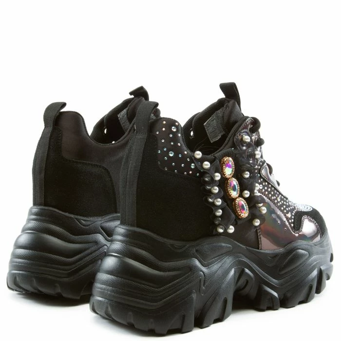 Stand out with the Watermelon-02 blingin’ platform sneakers from Anthony Wang! Black and pewter lace up sneakers with rhinestones all along the upper and a cute bedazzled bow on the outside. Signature Anthony Wang hidden wedge heel; 2 inch (5cm) platform and 4.5 inch (11.5cm) wedge heel. With a mixture of textures and gems, these sneakers have so much personality!