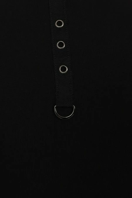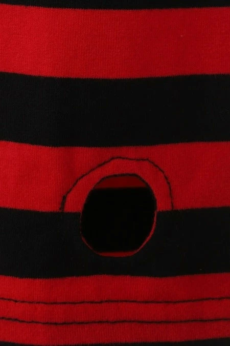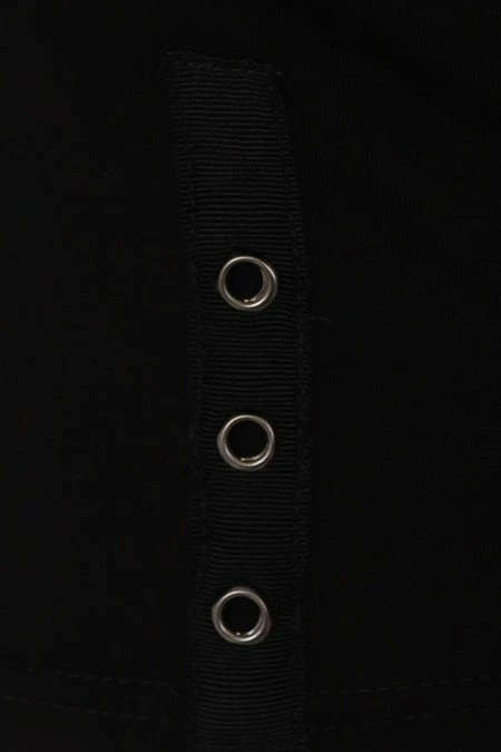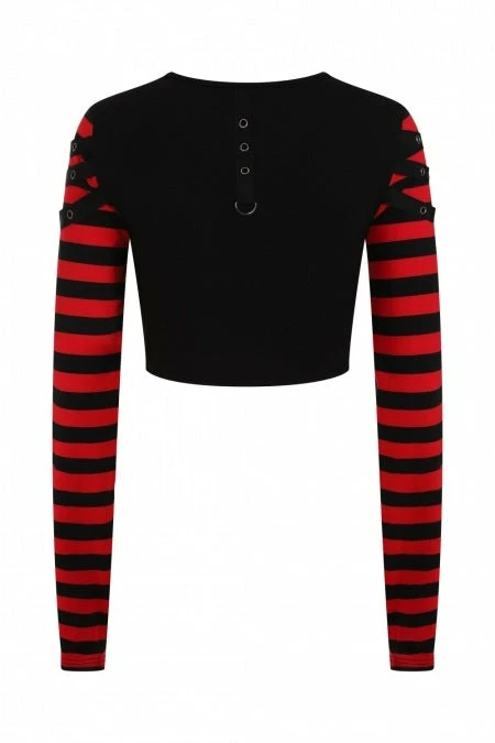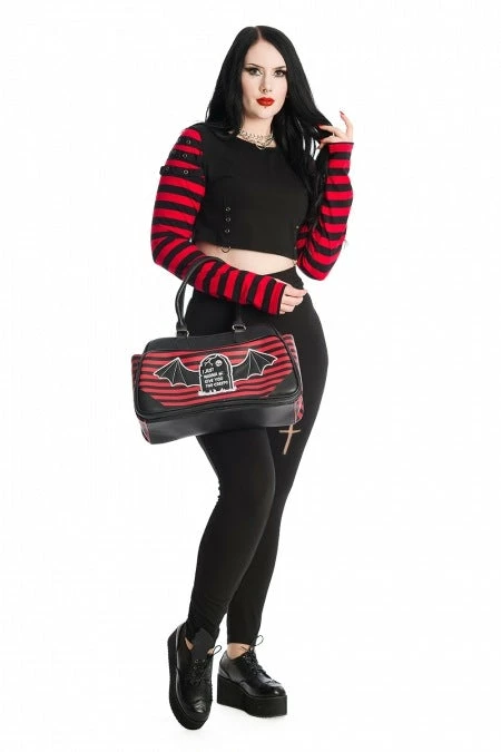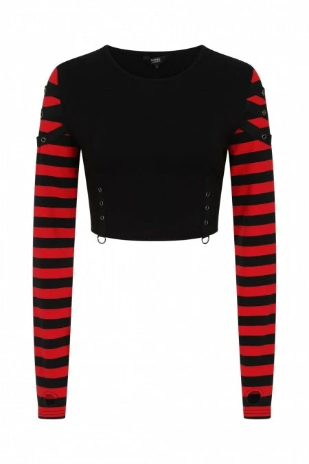 We are rocking the 90’s cropped top look with this charming Banned Lycoris Top. Round neck, long striped sleeves with thumb holes and lots of decorative hardware on front, back and shoulders. This top is soft with lots of stretch and is available in Black & Red and Black & Purple.