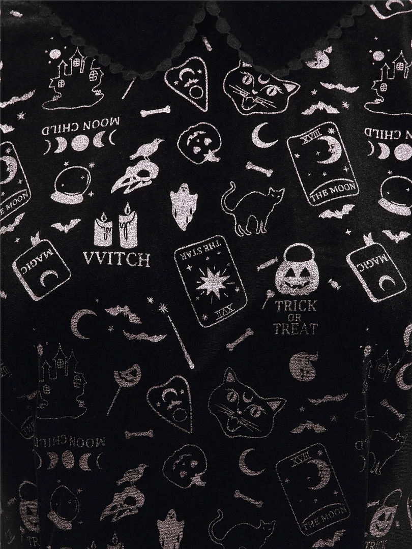This fabulous black top from Collectif features a quirky spooky foil print featuring pumpkins, cats and moons etc. Fastening with back button with keyhole to the back and with Peter pan collar and short puff sleeves, it’s perfect for those warmer months. Full length in a UK 10 is approximately 53.5cm/21″.