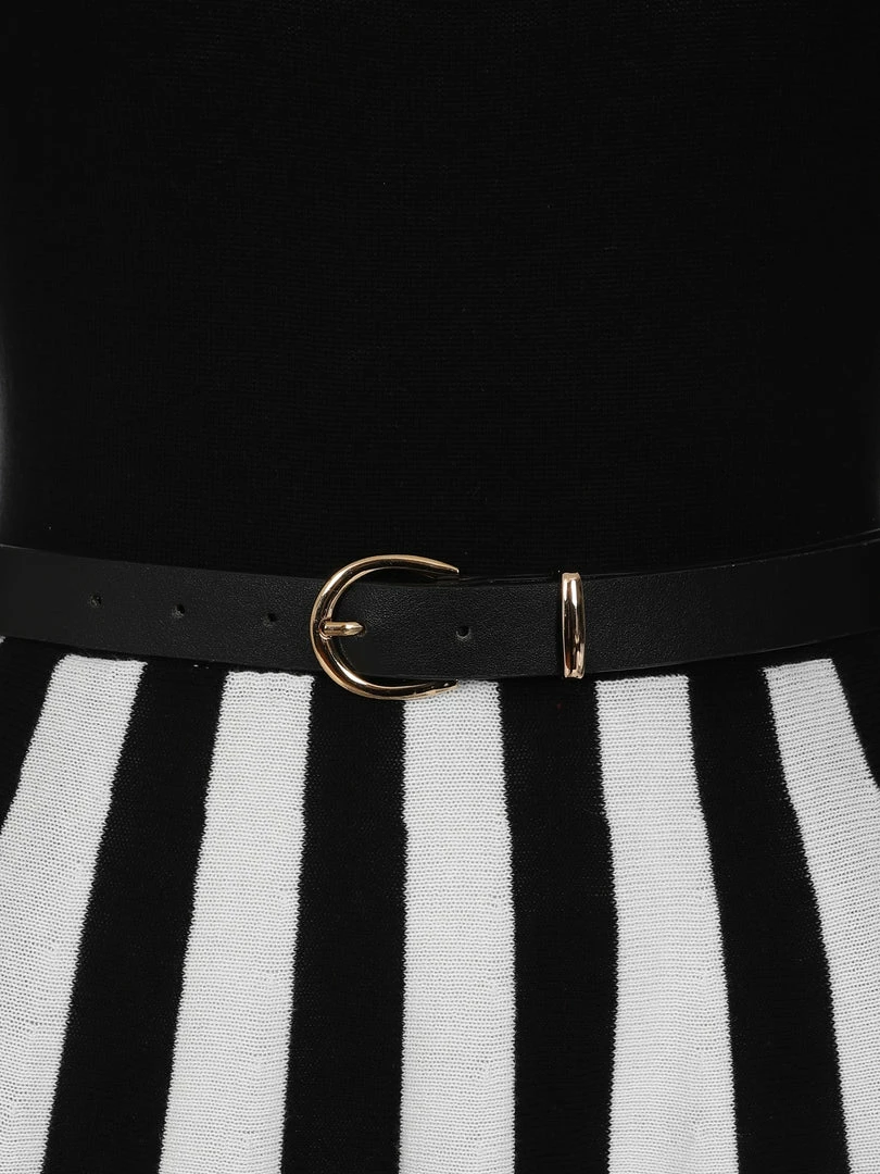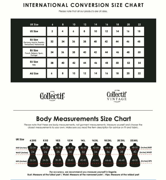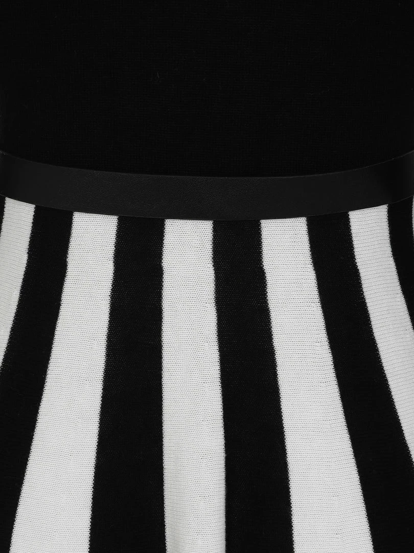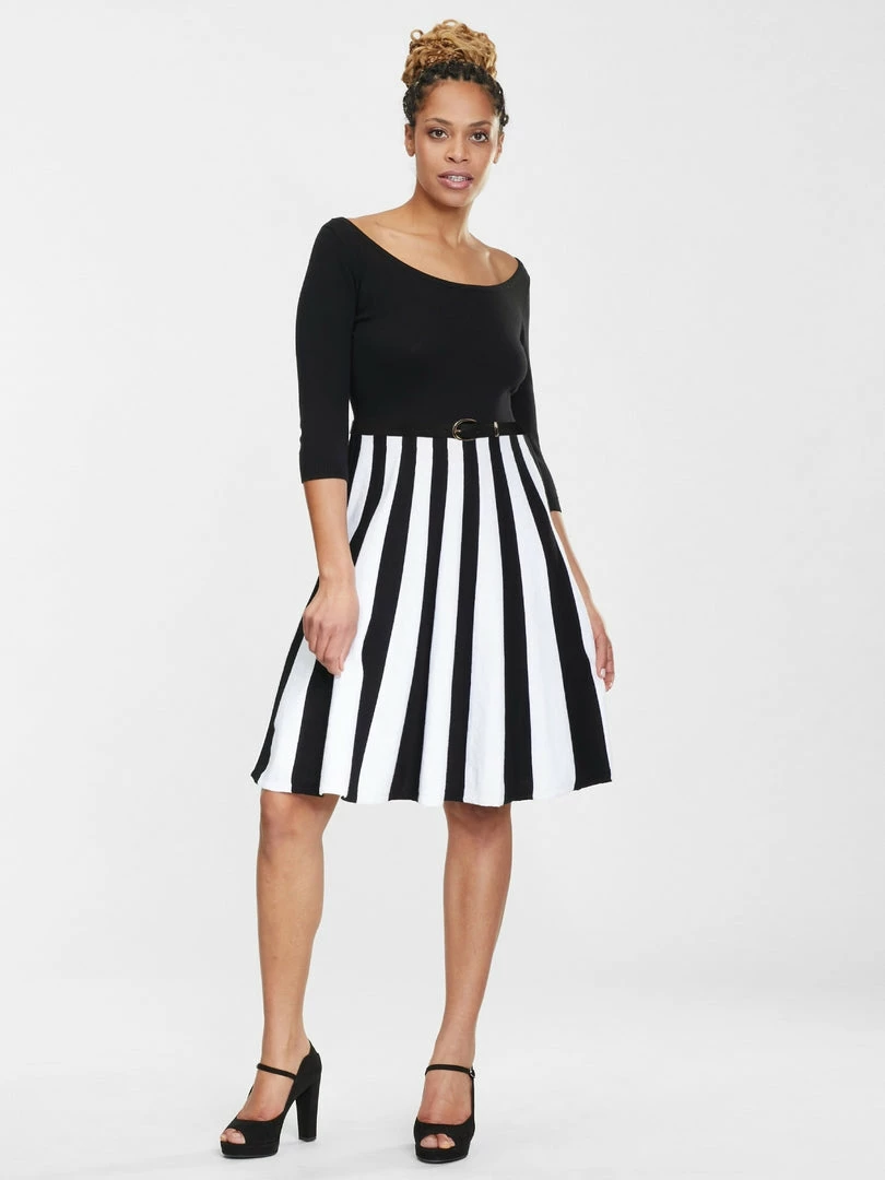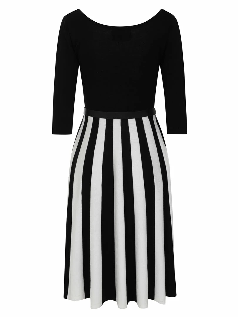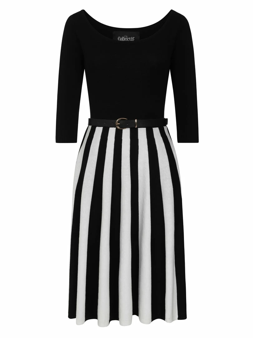 Stunning knitted cotton dress from Collectif! With 3/4 length sleeves, a flattering wide round neckline and black PU belt with brass coloured buckle. The vertical black and white striped skirt falls just below the knee and has side seam pockets, please see Collectif’s size guide in the images. Full length in a UK 10 is approximately 94cm, skirt length 58.4cm.