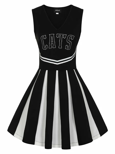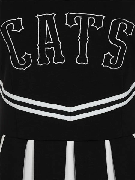 Amazing alternative style black and white cheerleader dress from Collectif. This head turning dress has a vintage 50s cheerleader vibe and “Cats” written across it. This stunning dress is made from a stretchy fabric and is sleeveless, with a v neck and pleated black and white skirt!