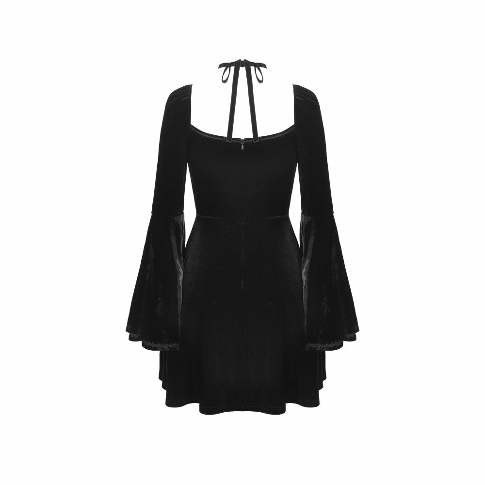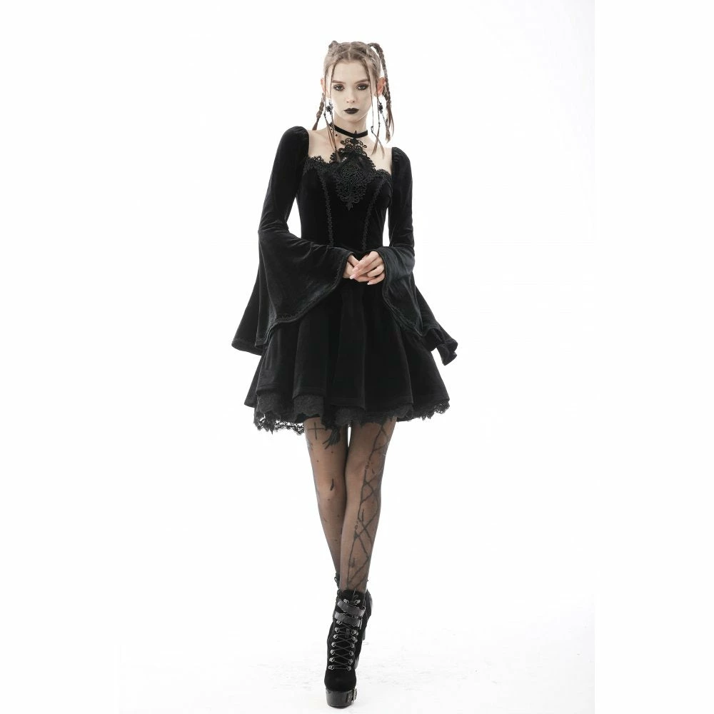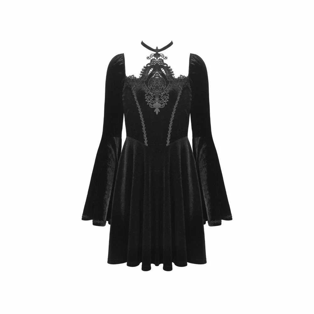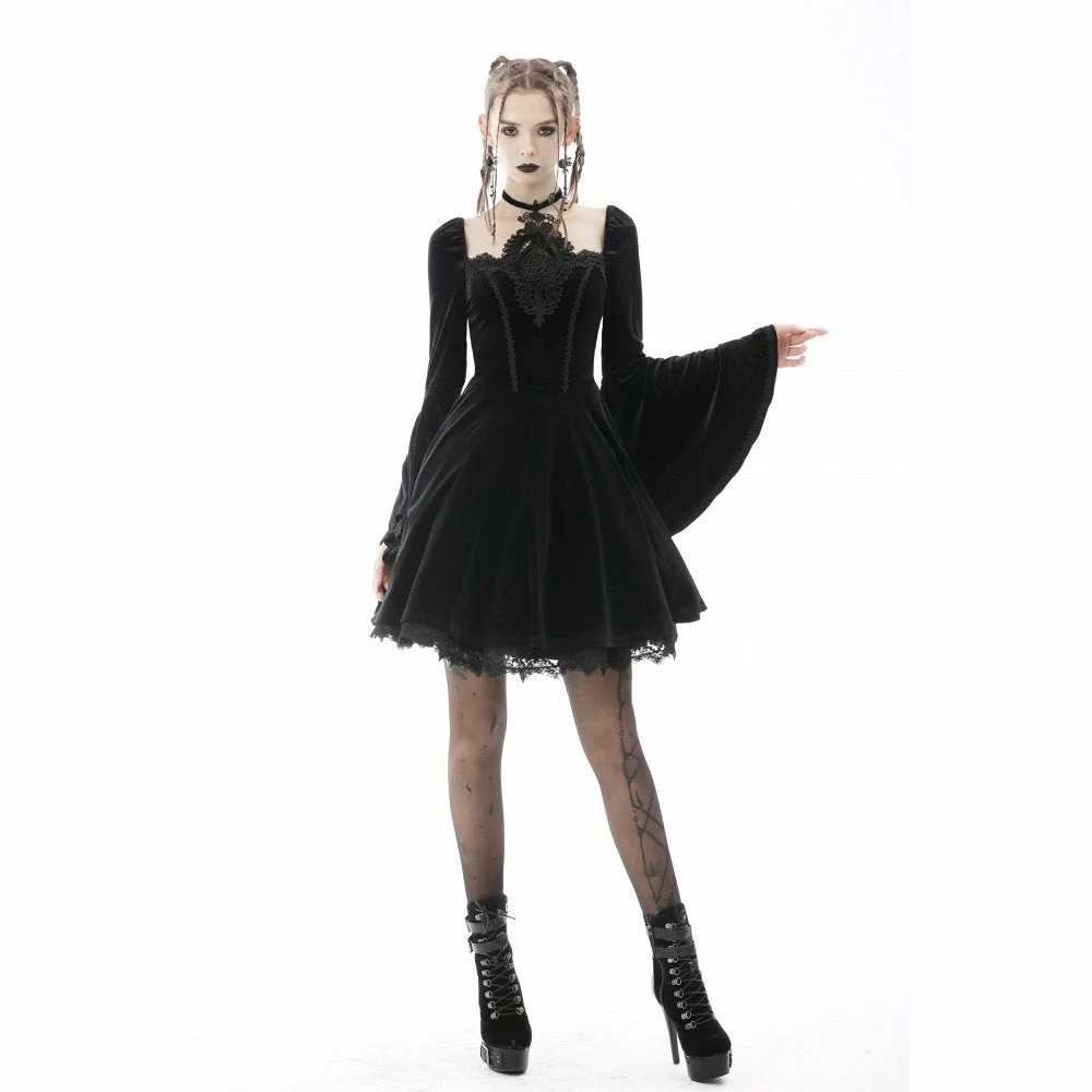 Elegant and dramatic black velvet mini dress by Dark in Love in a luxurious stretch velvet fabric with delicate embroidered detailing. This beautiful dress evokes a feeling of victorian gothic style with a modern short length. Featuring exaggerated bell sleeves, a nipped in waist and flowing skirt, this dress also has stunning embroidery detailing on the neckline and a ribbon tie choker.