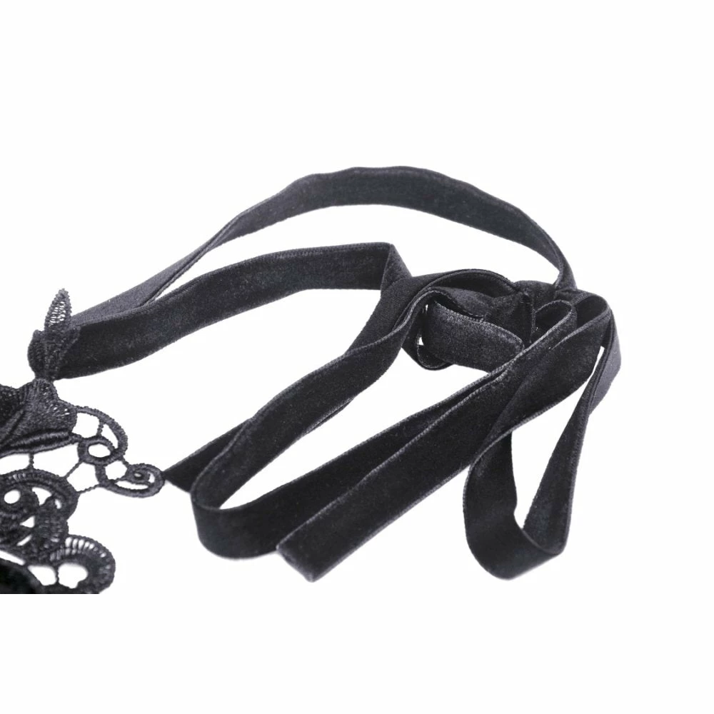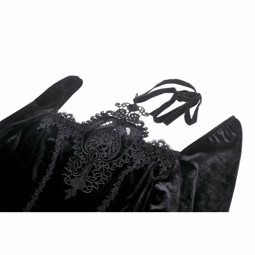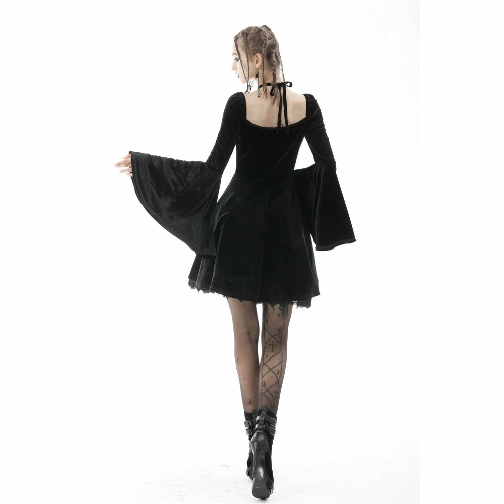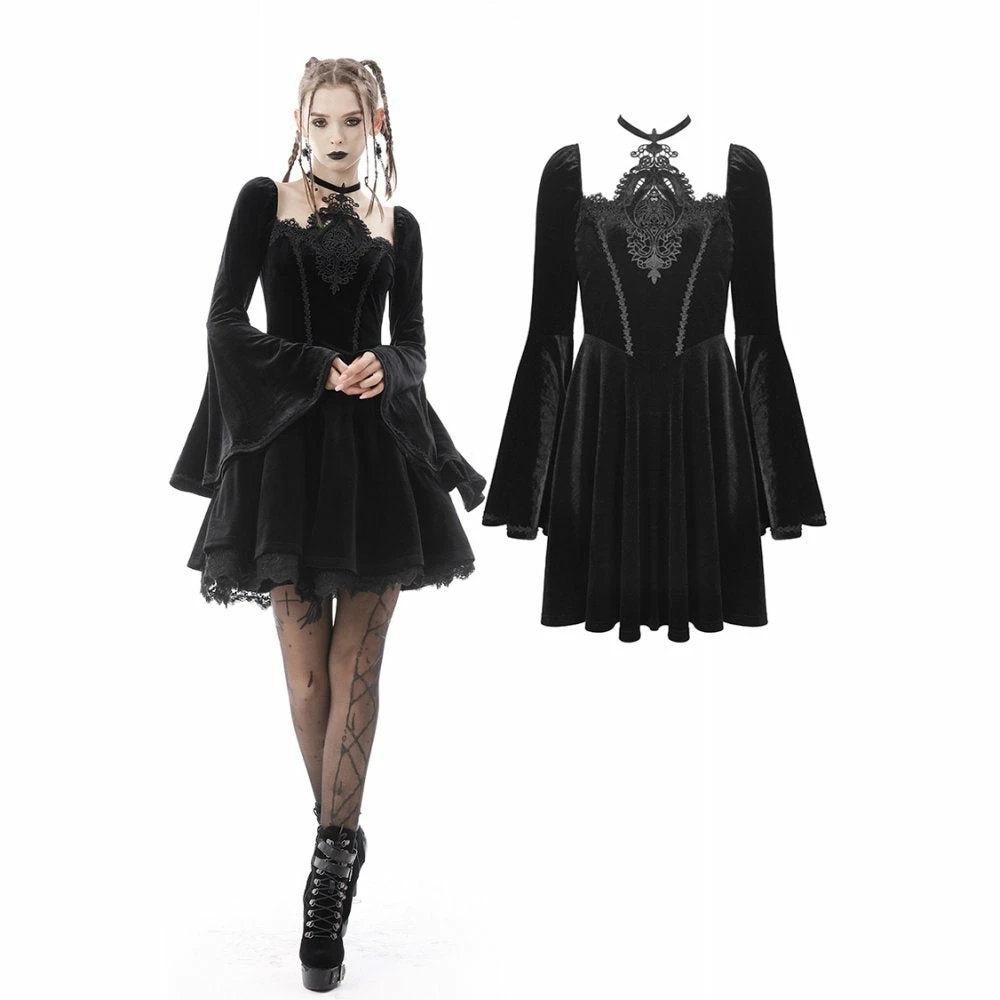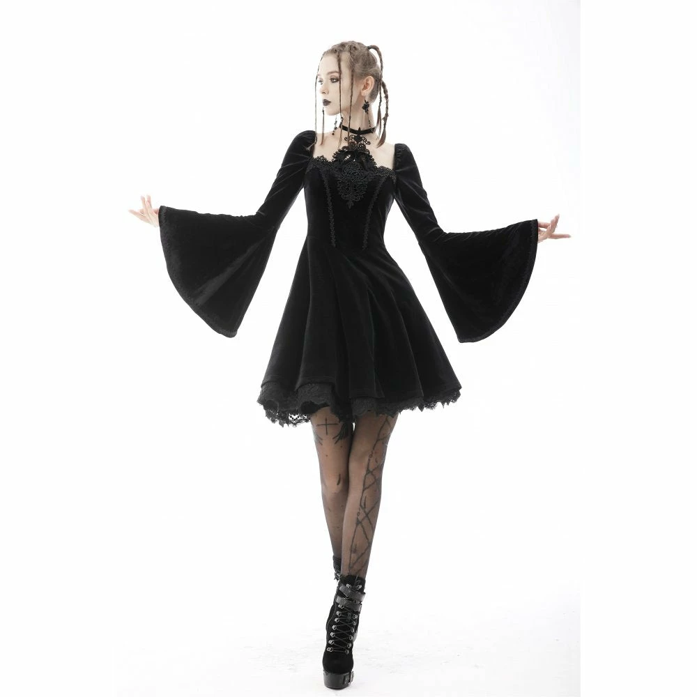 Elegant and dramatic black velvet mini dress by Dark in Love in a luxurious stretch velvet fabric with delicate embroidered detailing. This beautiful dress evokes a feeling of victorian gothic style with a modern short length. Featuring exaggerated bell sleeves, a nipped in waist and flowing skirt, this dress also has stunning embroidery detailing on the neckline and a ribbon tie choker.
