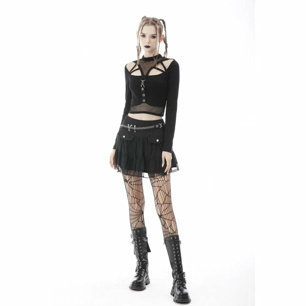 Gorgeous black long sleeve top from Dark in Love made from a soft stretchy cotton fabric in a body hugging fit! This sexy and edgy top features a high neck with button fasting plus cut outs with fishnet panels and statement strap styling. Looks amazing worn with a skirt or skintight trousers!