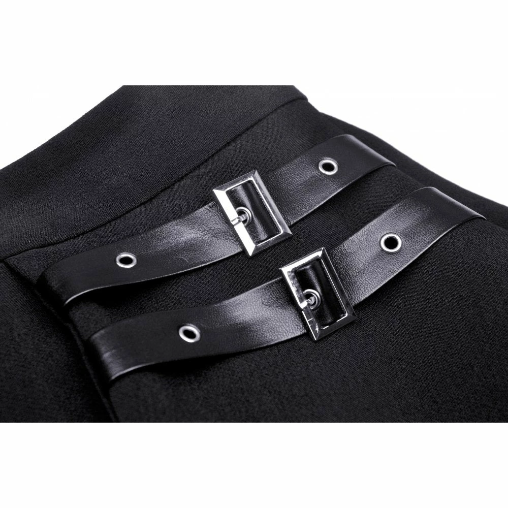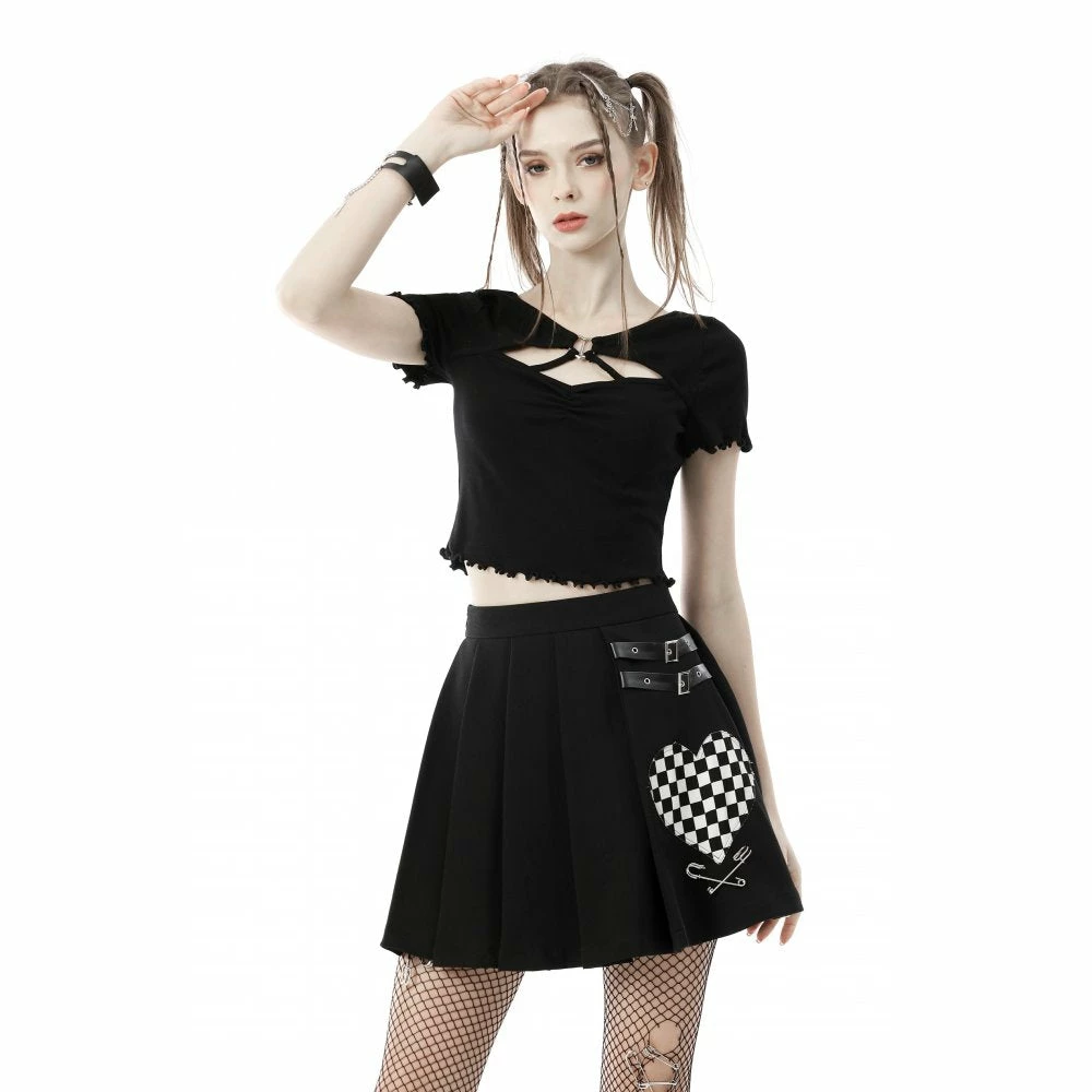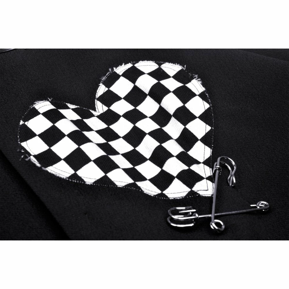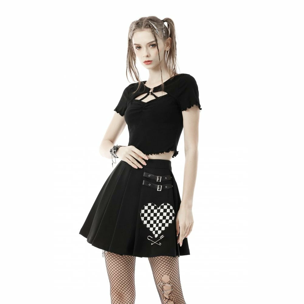 This lovely pleated skirt from Dark in Love features faux leather strap accents and a monochrome check heart with safety pin adornment. Fastening with a concealed zip to the side, for the perfect fit and fabric composition, please see Dark in Loves size guide in the images.