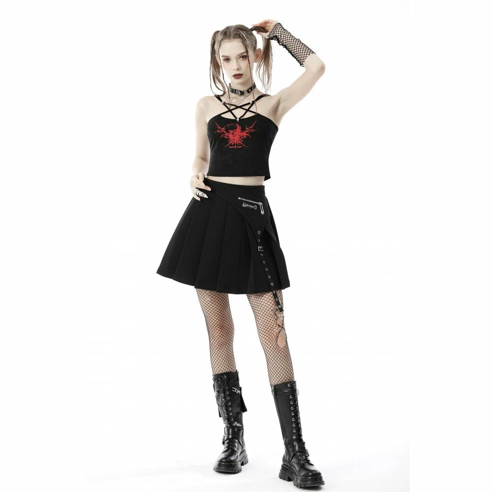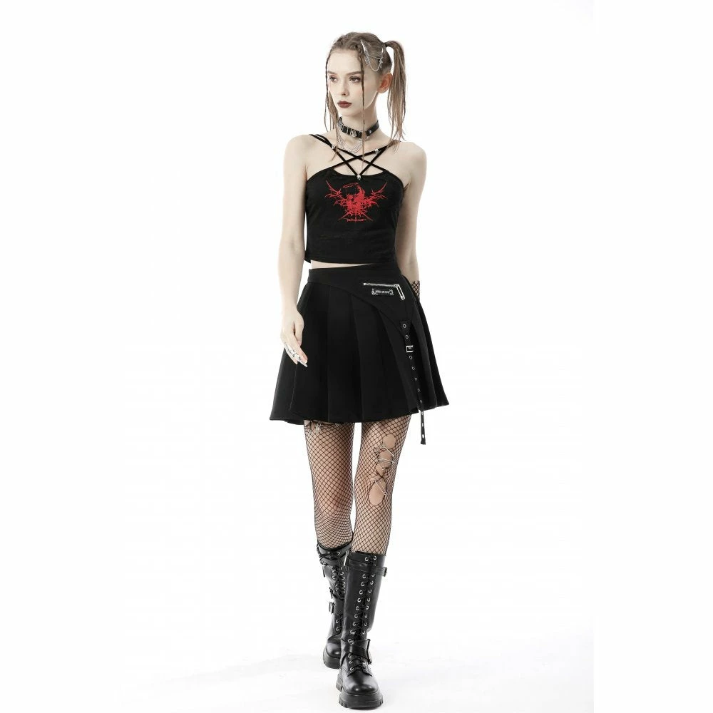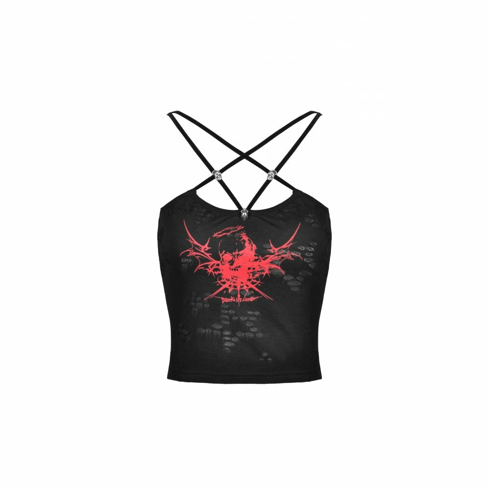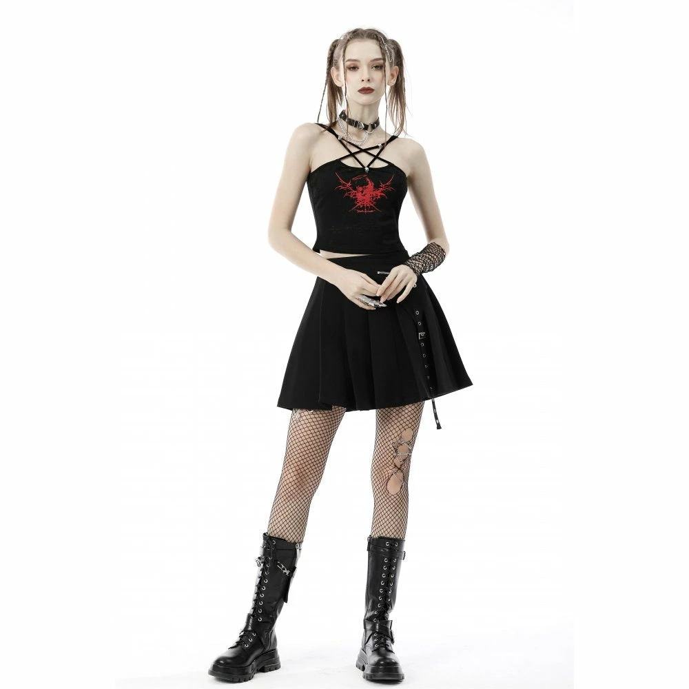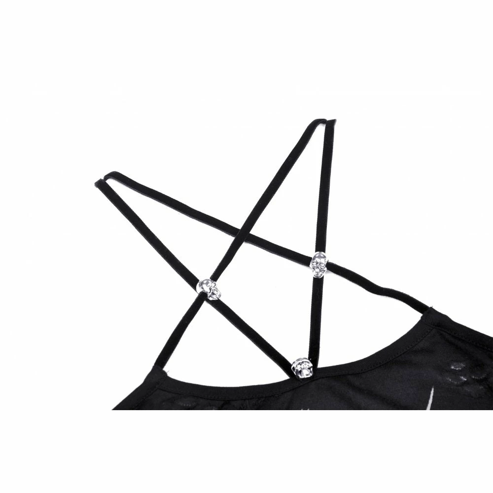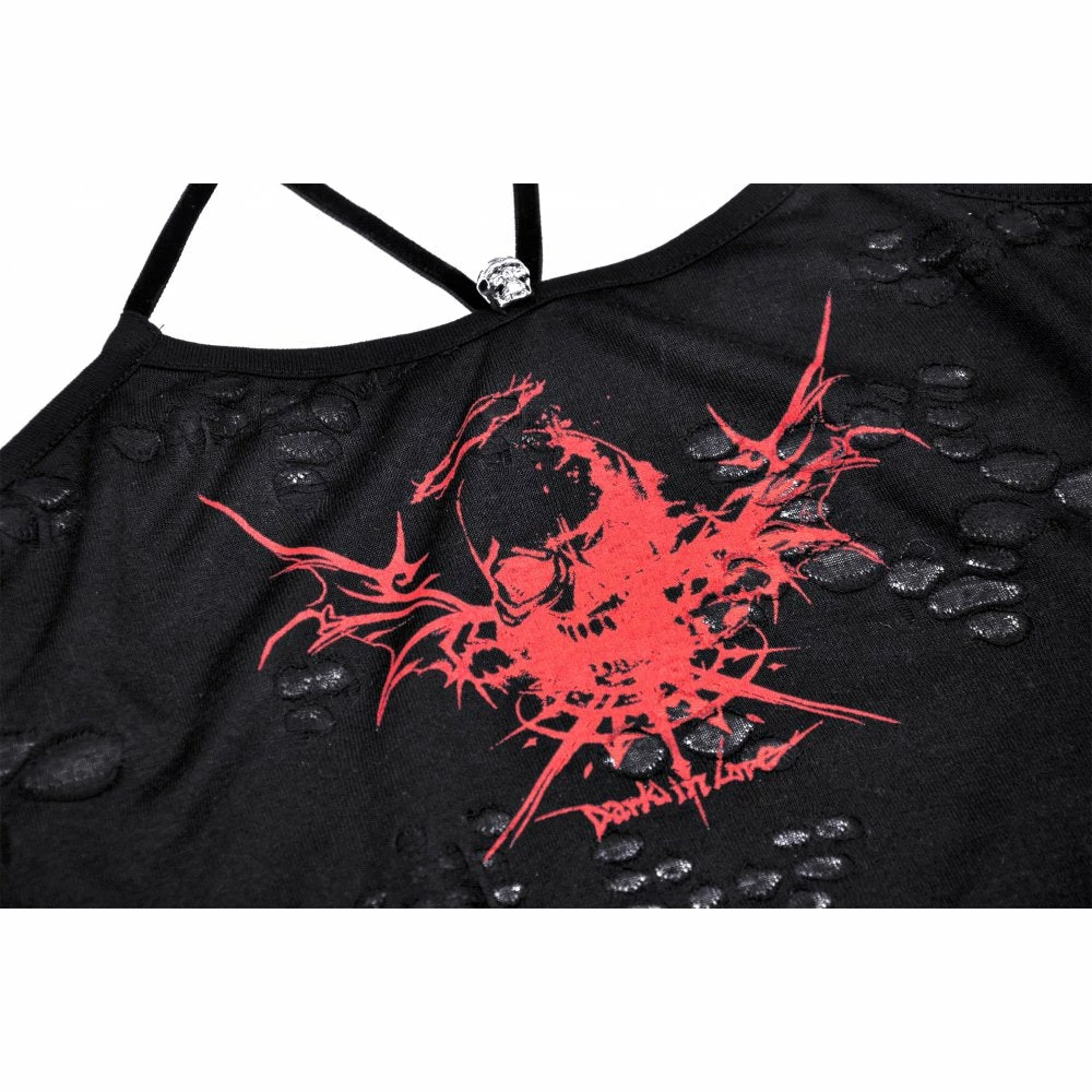 This awesome little cami top from Dark in Love features an amazing winged skull print in red and skull adornments to the pentagram inspired spaghetti straps. With distress detailing, this lovely top looks great on. For the perfect fit and fabric composition, please see Dark in Loves size guide in the images.