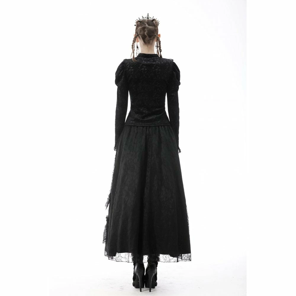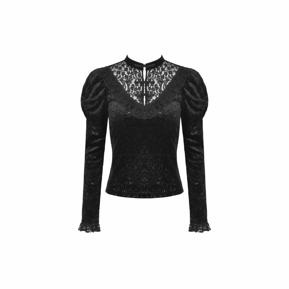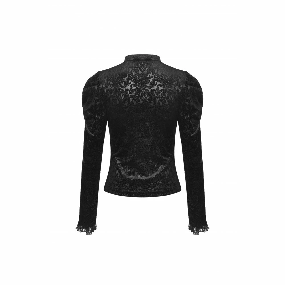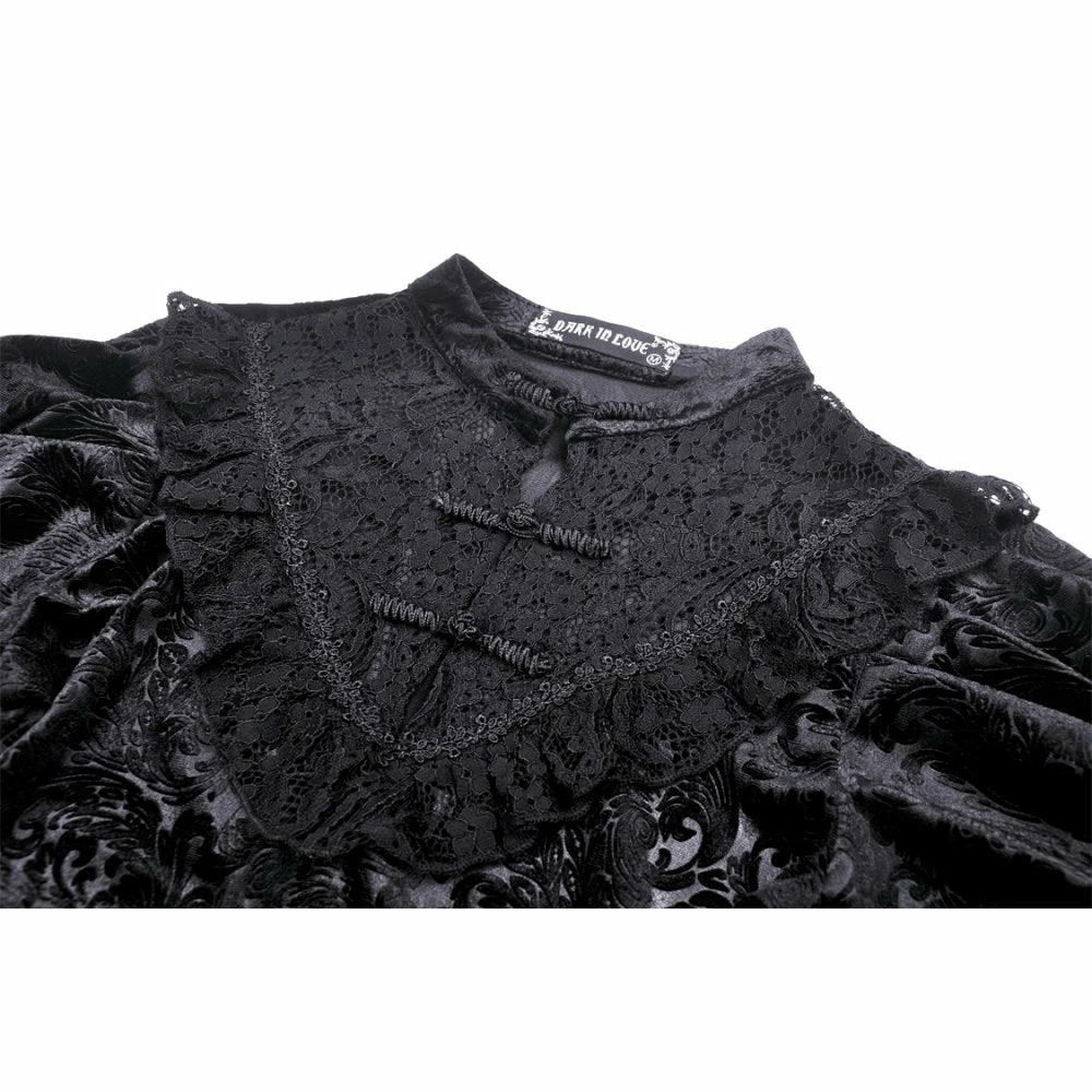 Elegant and beautiful black top by Dark in Love in a luxurious stretch embossed velvet fabric with puff shoulders. This top evokes a feeling of victorian gothic style. Featuring long sleeves and lace paneling on the front, this lovely top is bound to turn heads.
