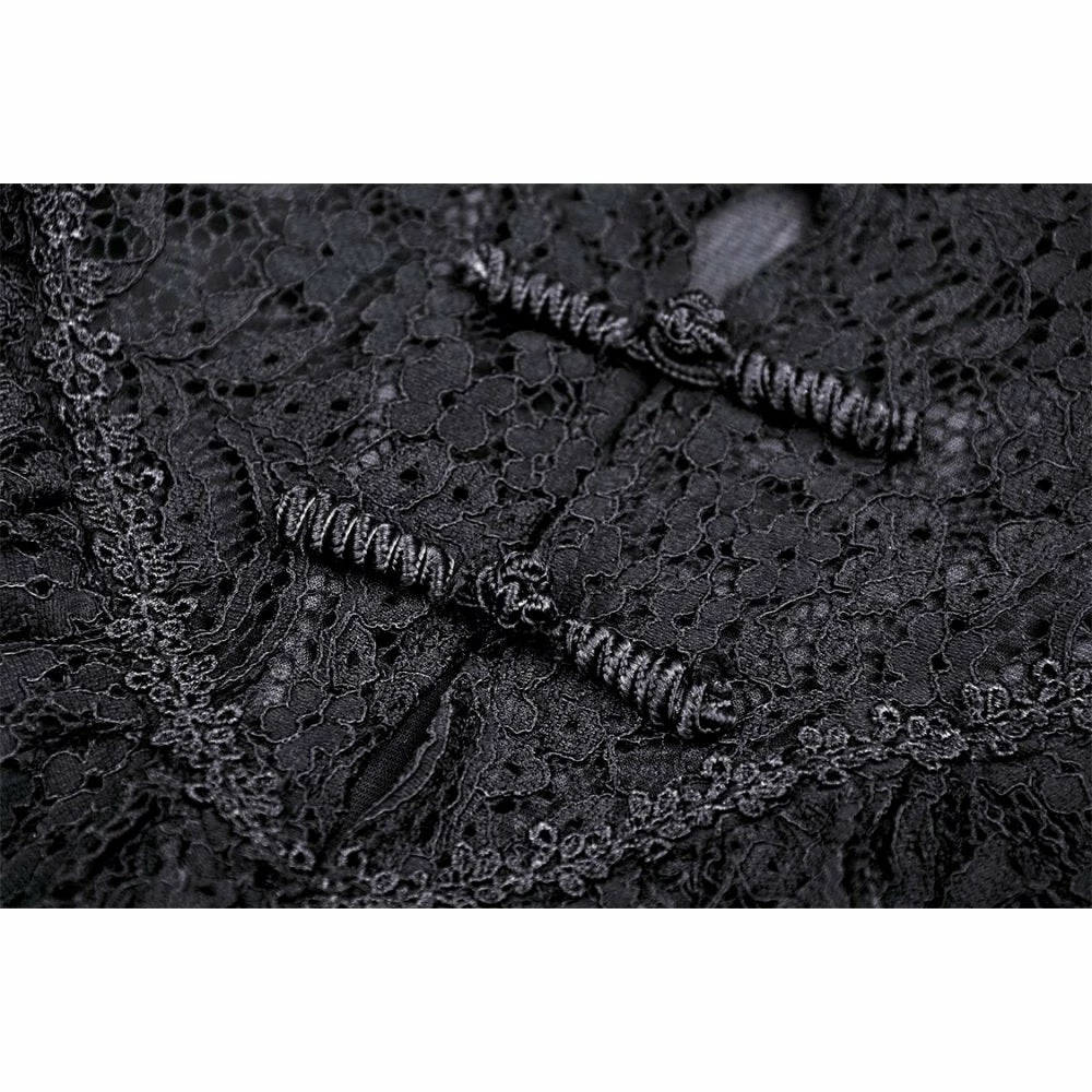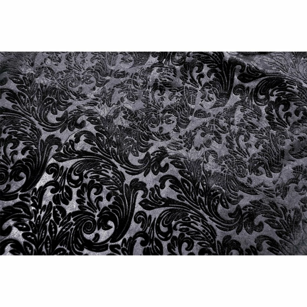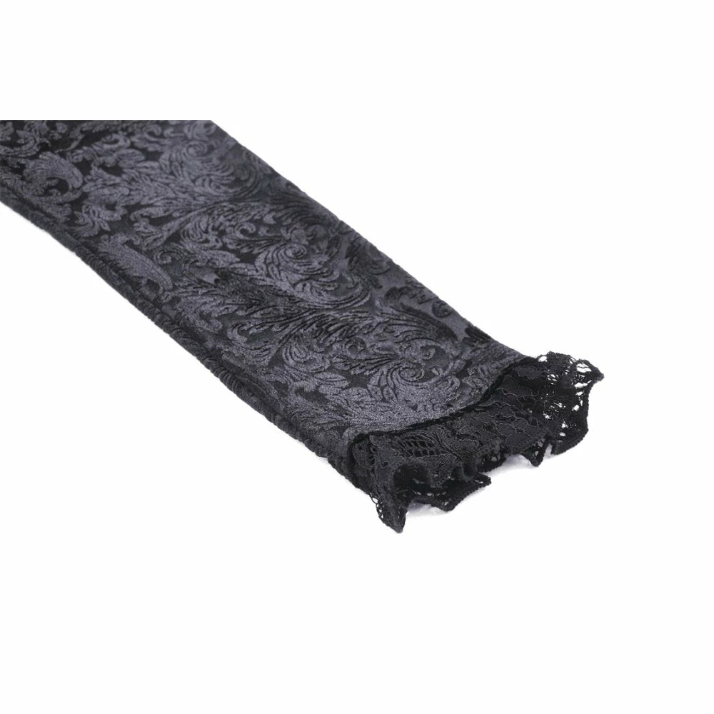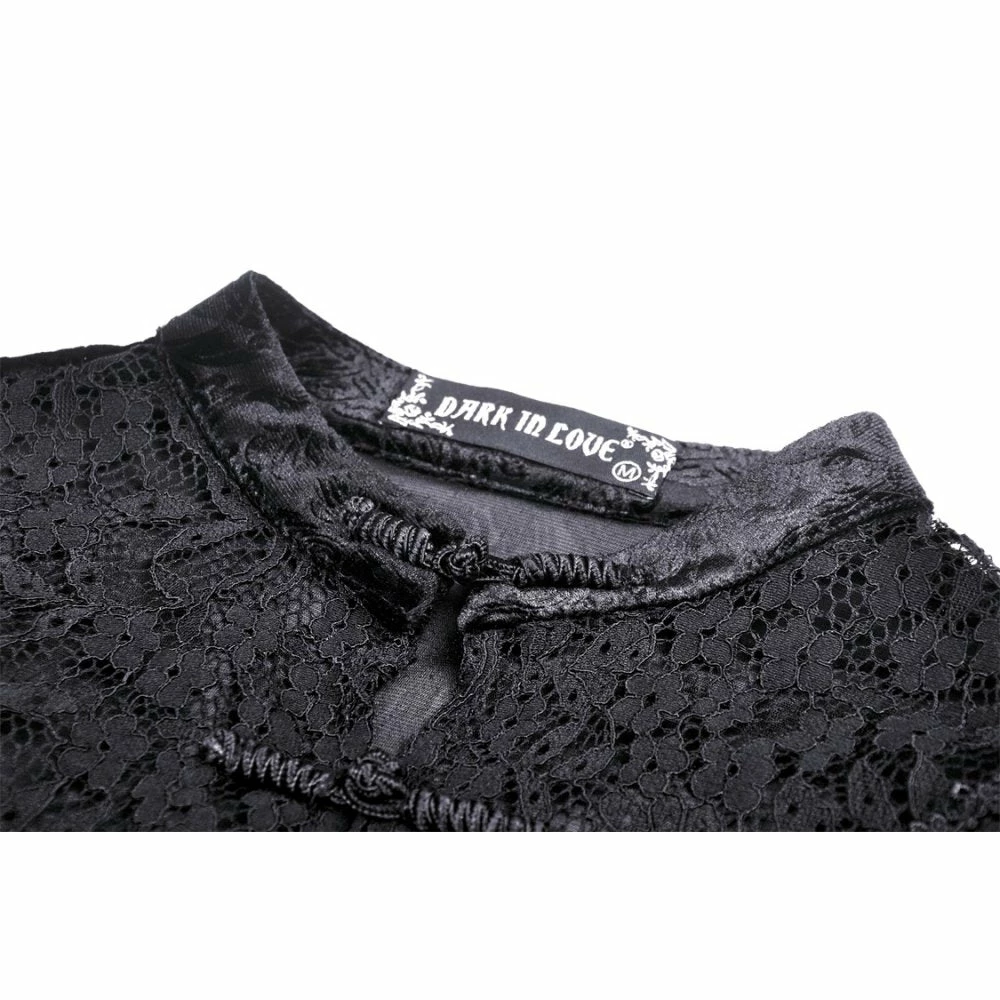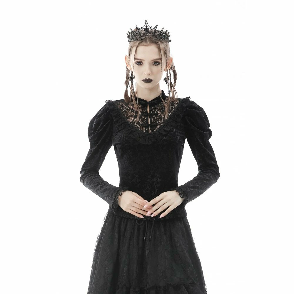 Elegant and beautiful black top by Dark in Love in a luxurious stretch embossed velvet fabric with puff shoulders. This top evokes a feeling of victorian gothic style. Featuring long sleeves and lace paneling on the front, this lovely top is bound to turn heads.