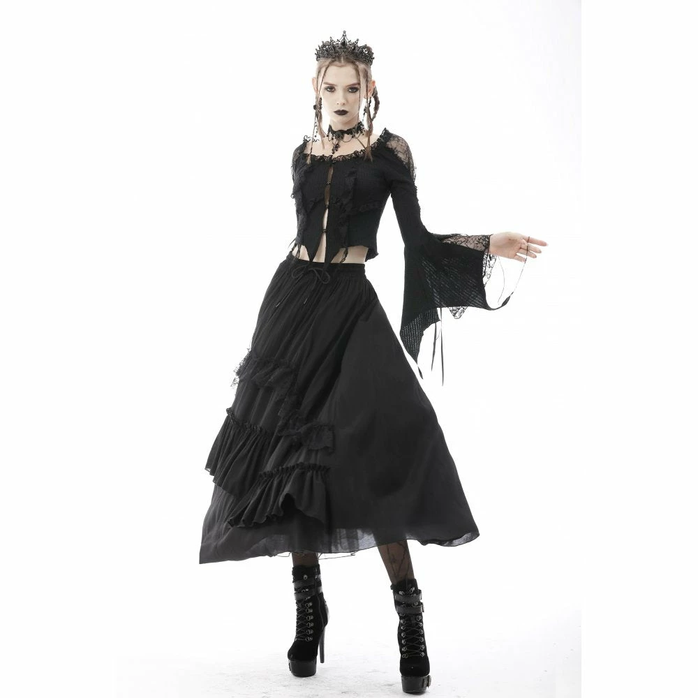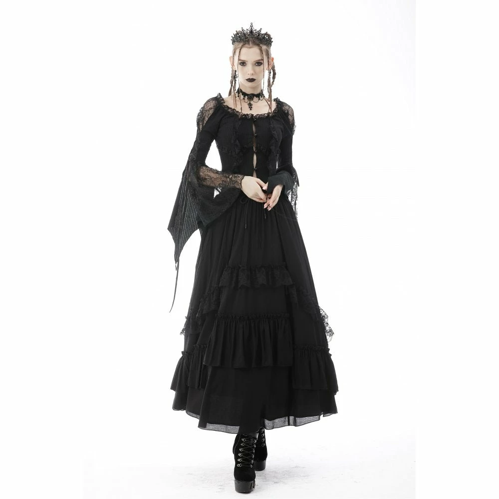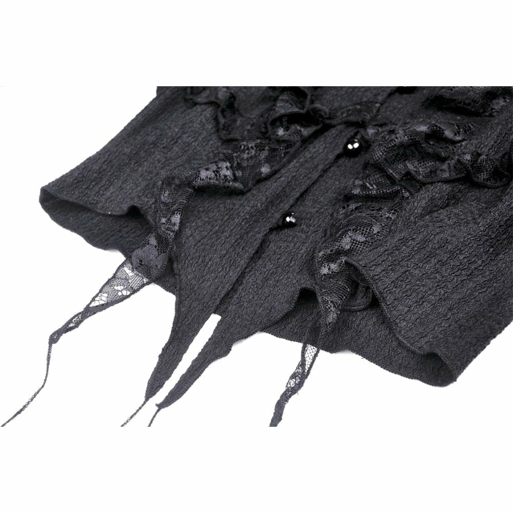 Ethereal and beautiful black long sleeved top by Dark in Love in a luxurious lightweight fabric with frills and tassels. This top evokes a feeling of elegant yet seductive gothic style. Featuring long sleeves and lace paneling as well as button up front, this lovely top is bound to turn heads.