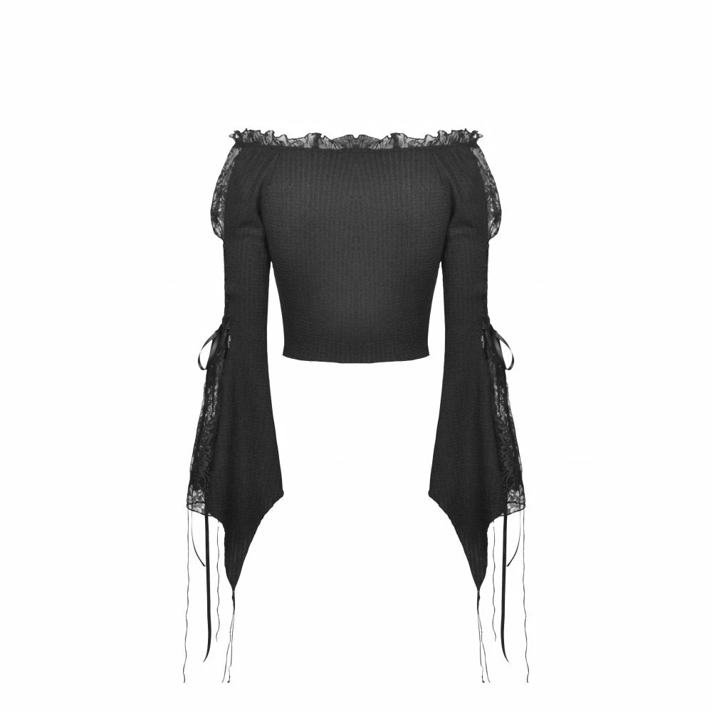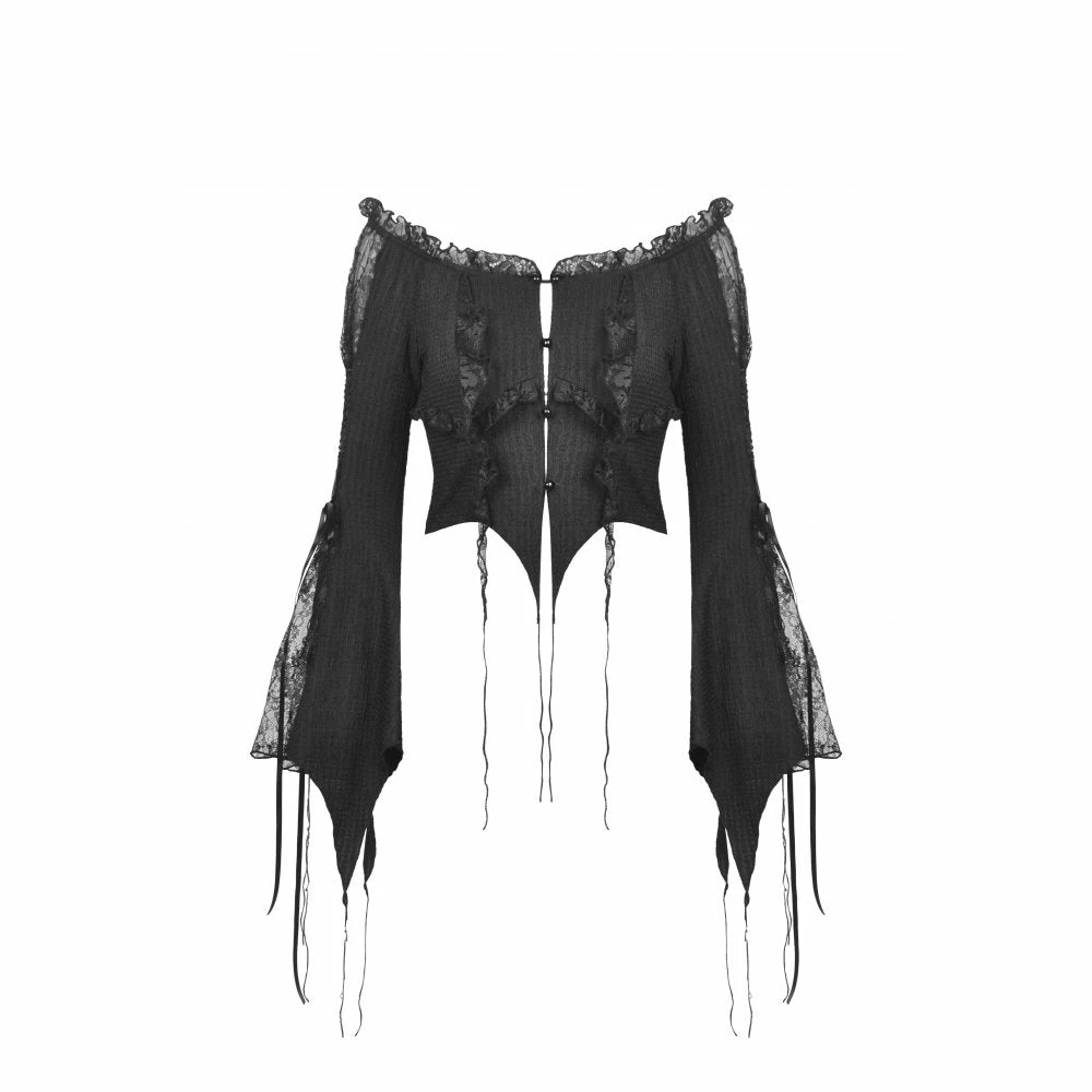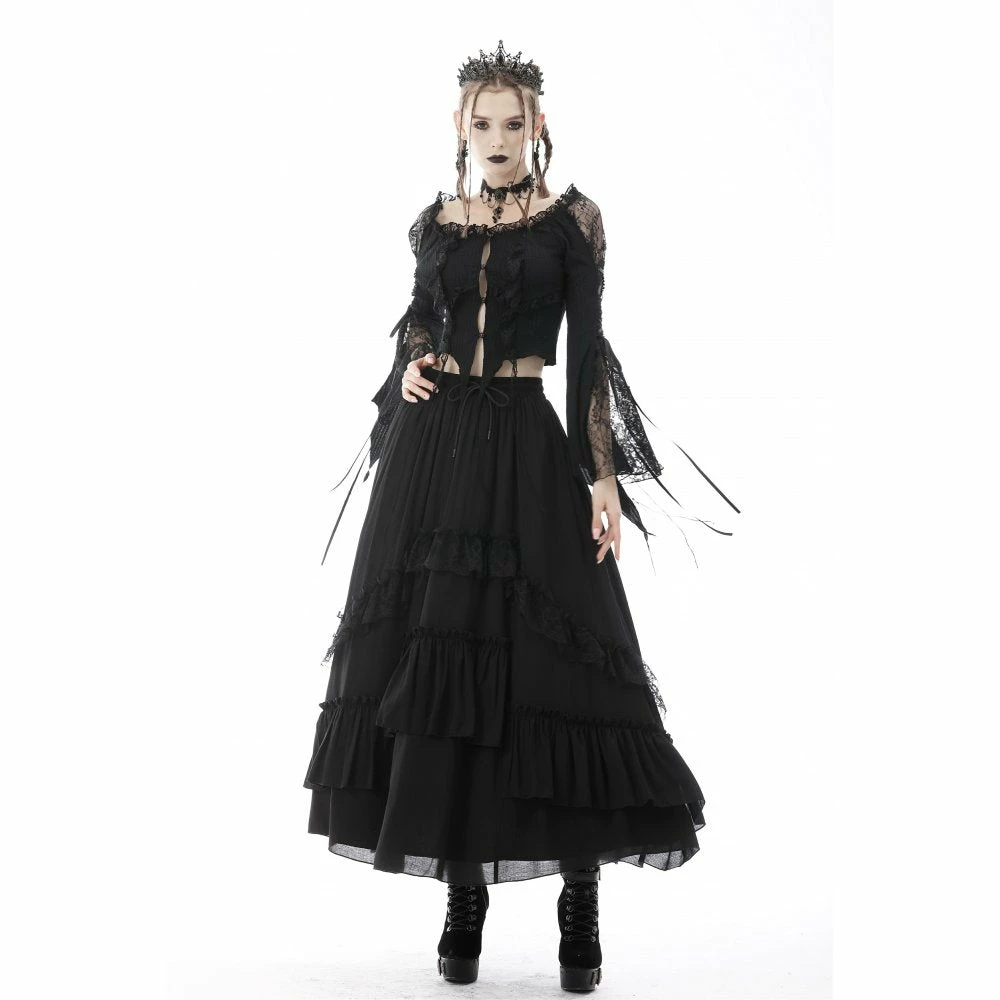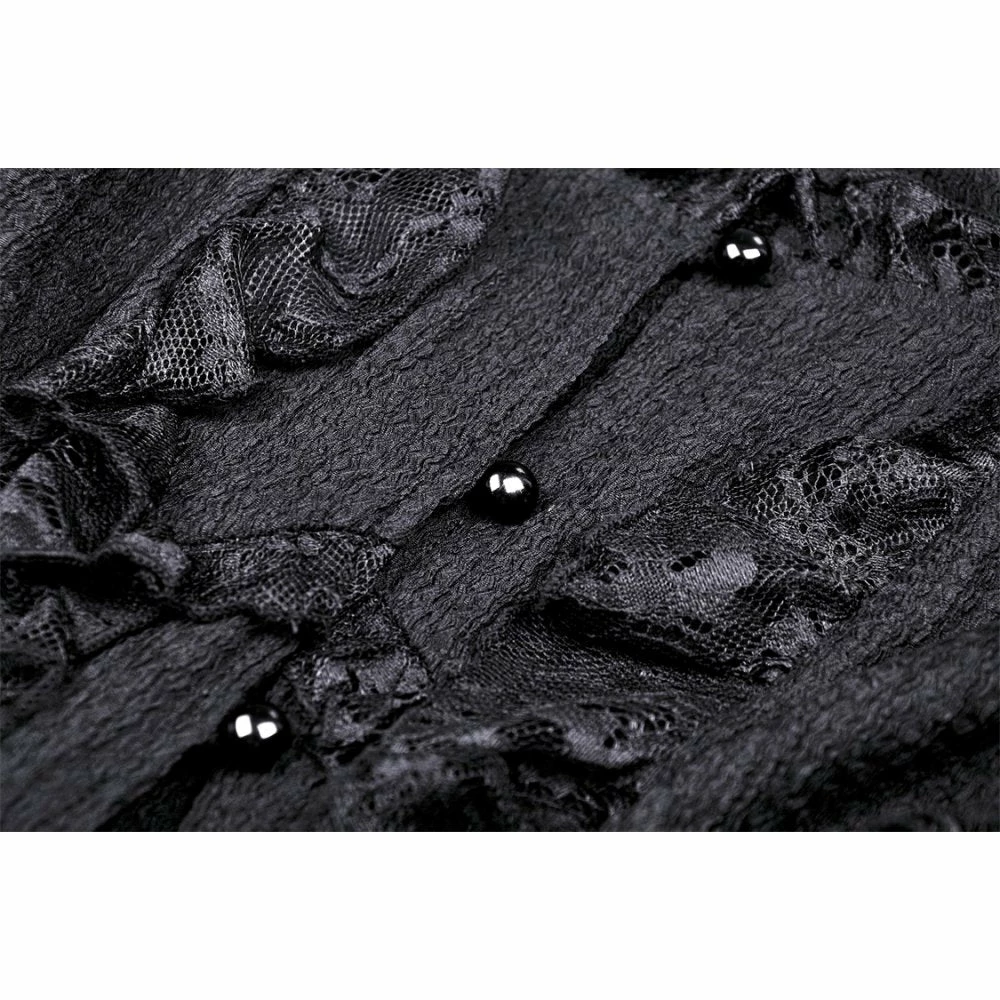 Ethereal and beautiful black long sleeved top by Dark in Love in a luxurious lightweight fabric with frills and tassels. This top evokes a feeling of elegant yet seductive gothic style. Featuring long sleeves and lace paneling as well as button up front, this lovely top is bound to turn heads.