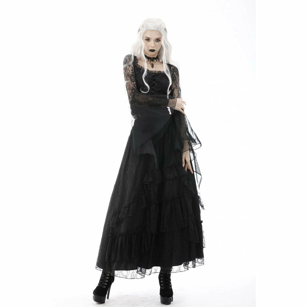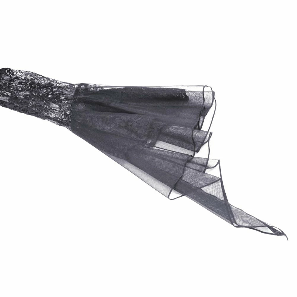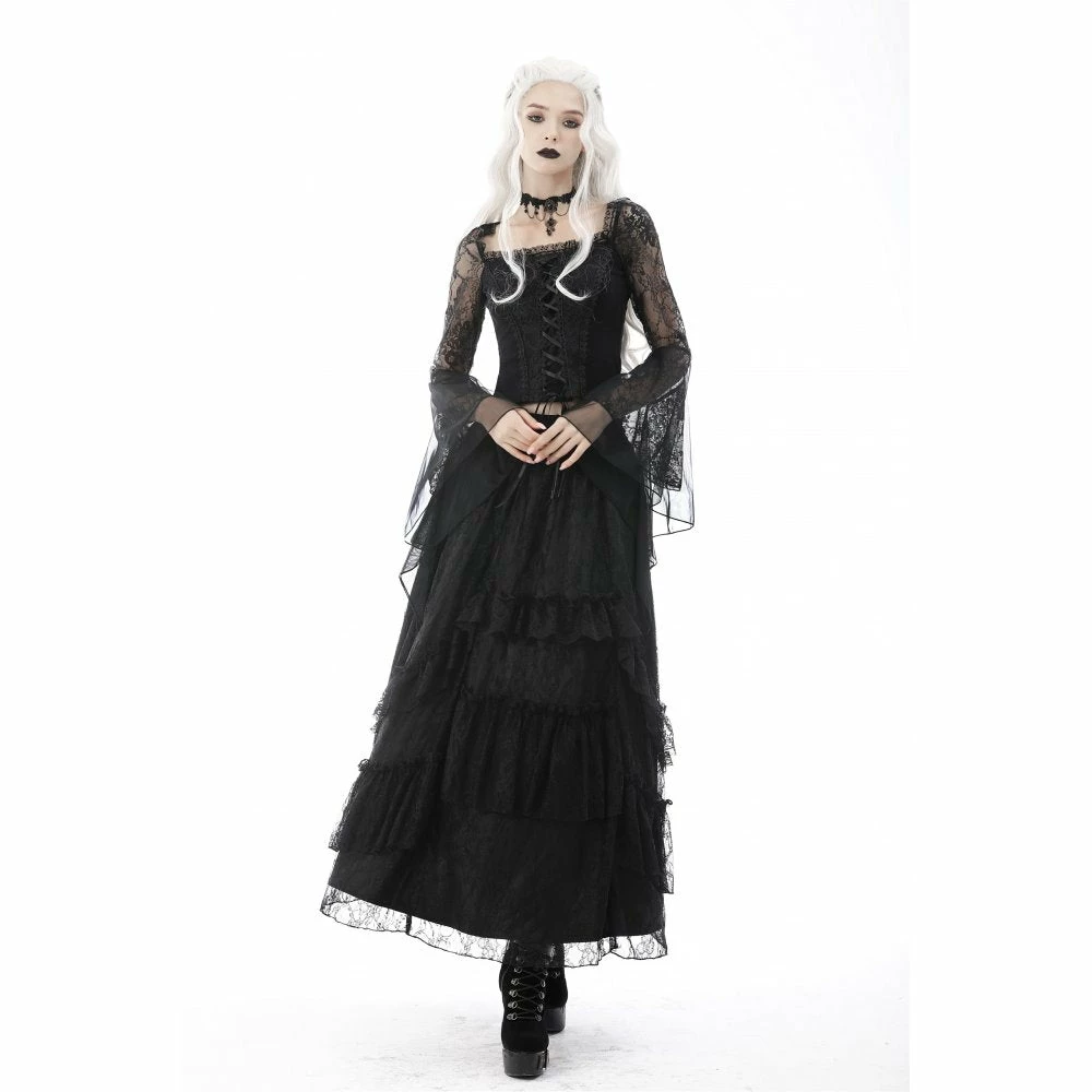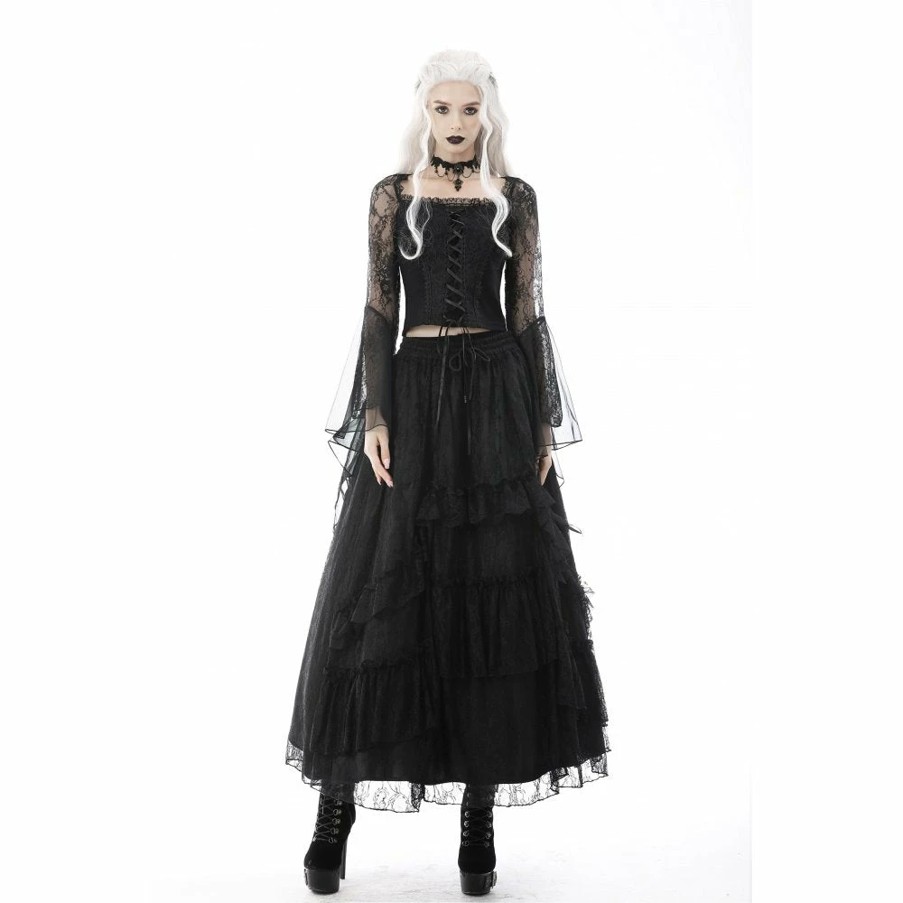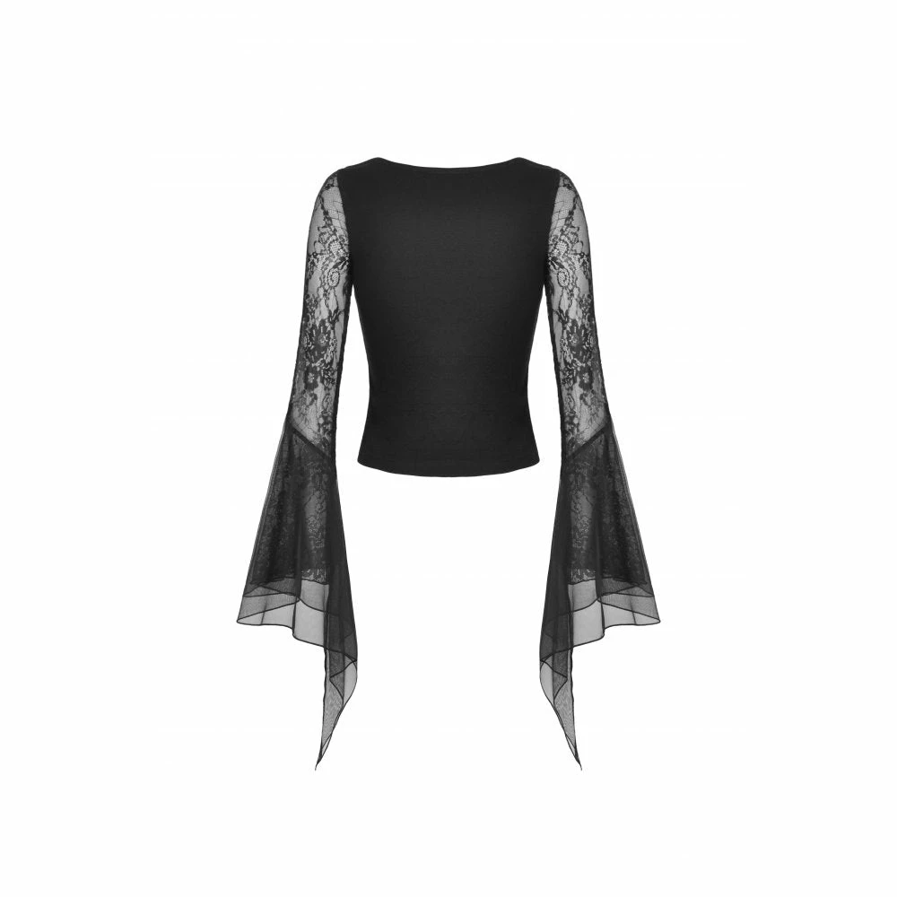 Dramatic and elegant gothic black top from Dark in Love made from a soft stretchy cotton fabric in a sexy body hugging fit! This beautiful top features exaggerated lace and mesh bell sleeves and a romantic corset style ribbon lace up front.