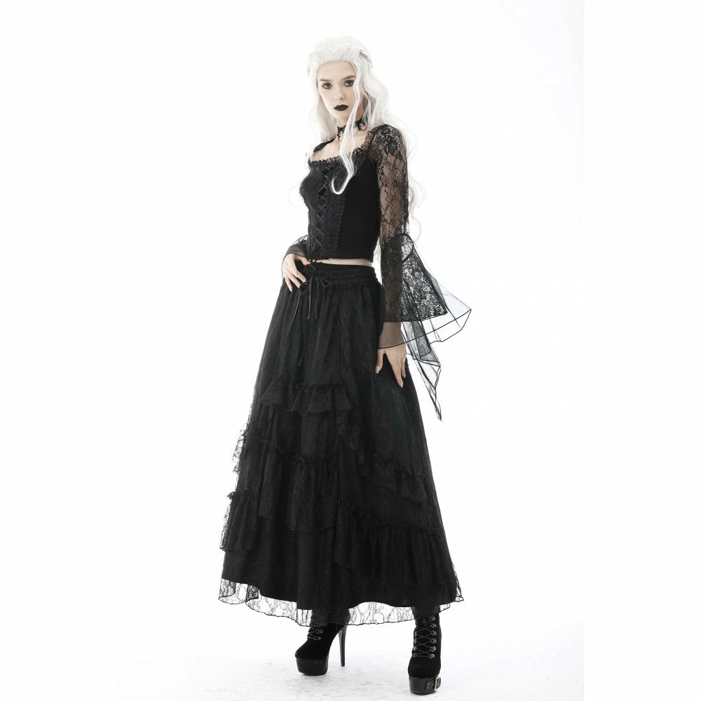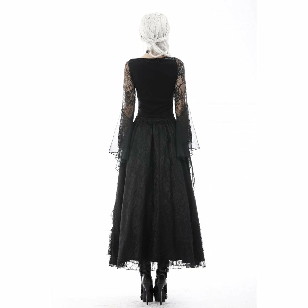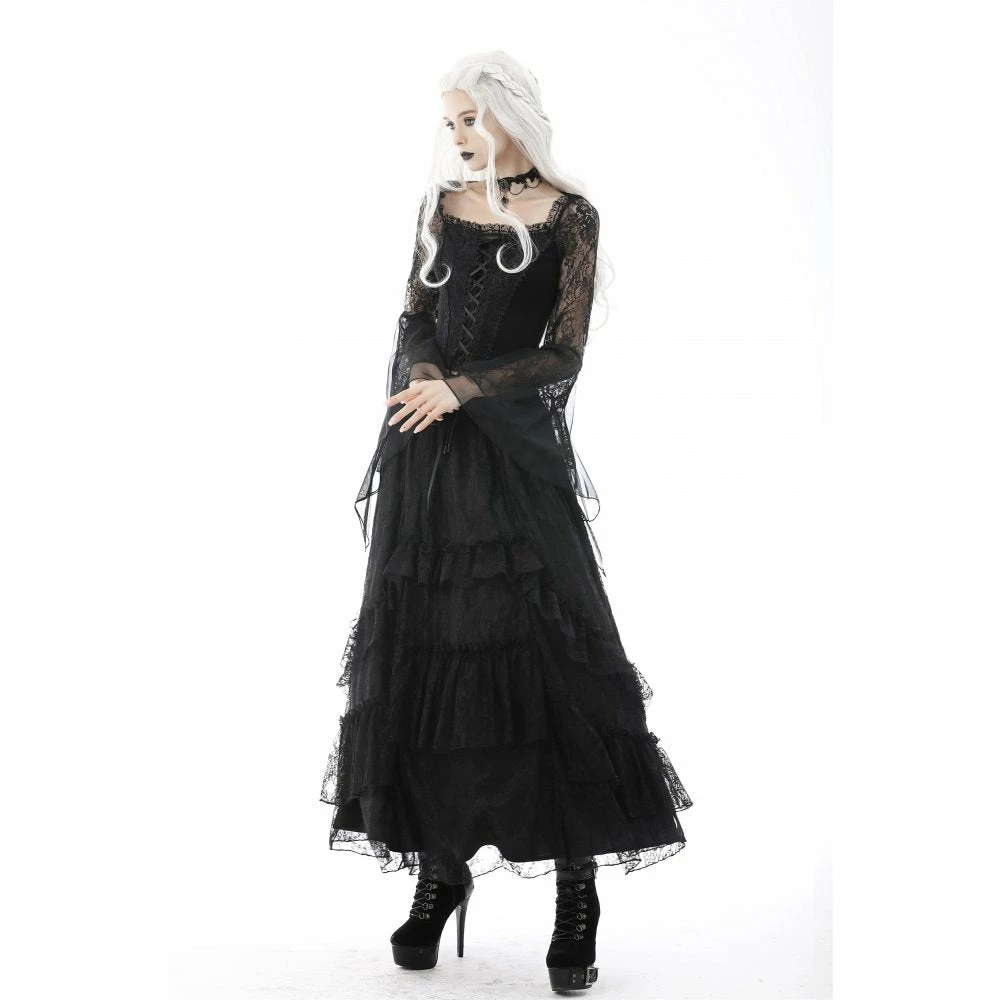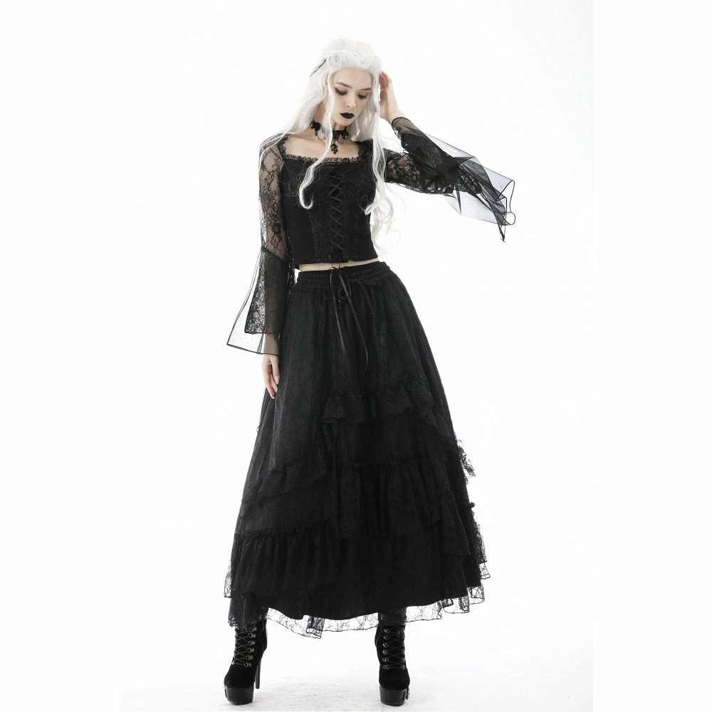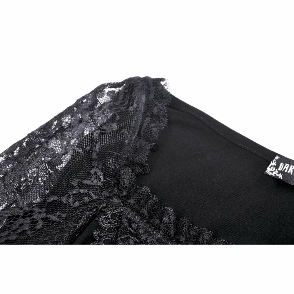 Dramatic and elegant gothic black top from Dark in Love made from a soft stretchy cotton fabric in a sexy body hugging fit! This beautiful top features exaggerated lace and mesh bell sleeves and a romantic corset style ribbon lace up front.