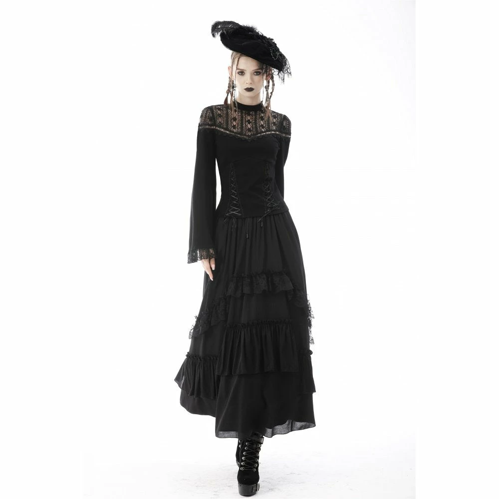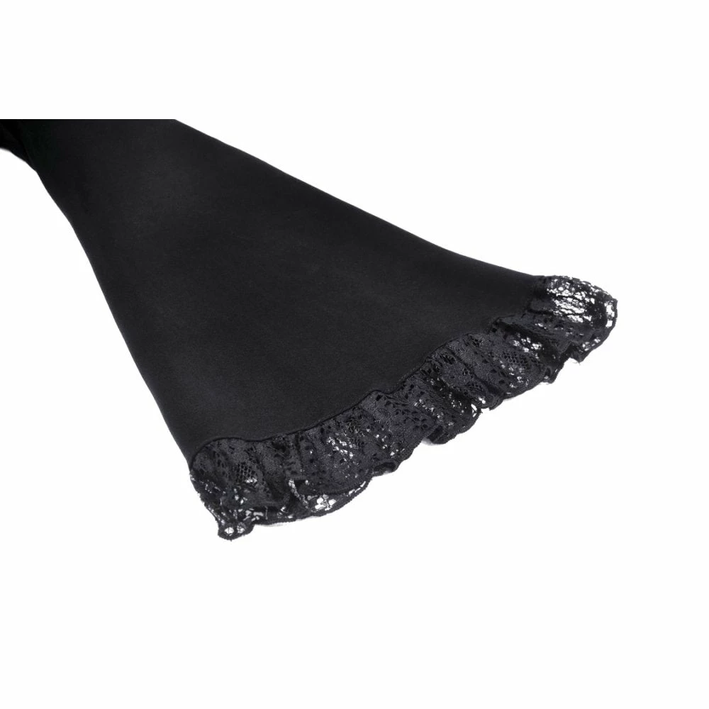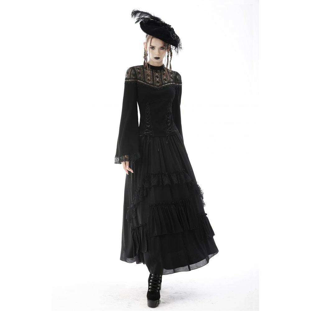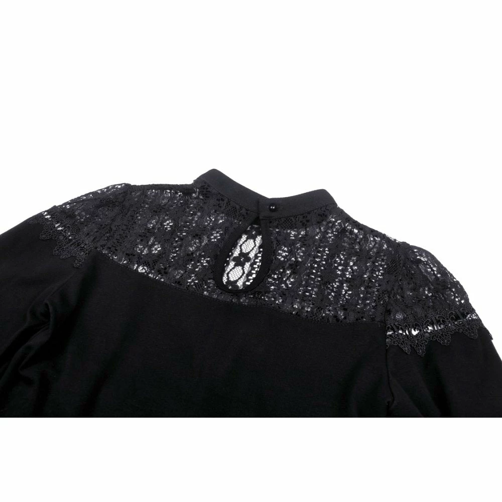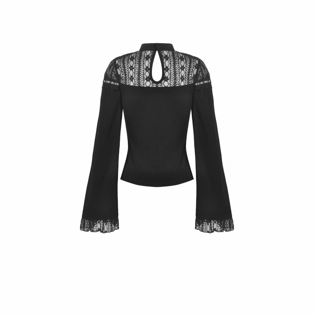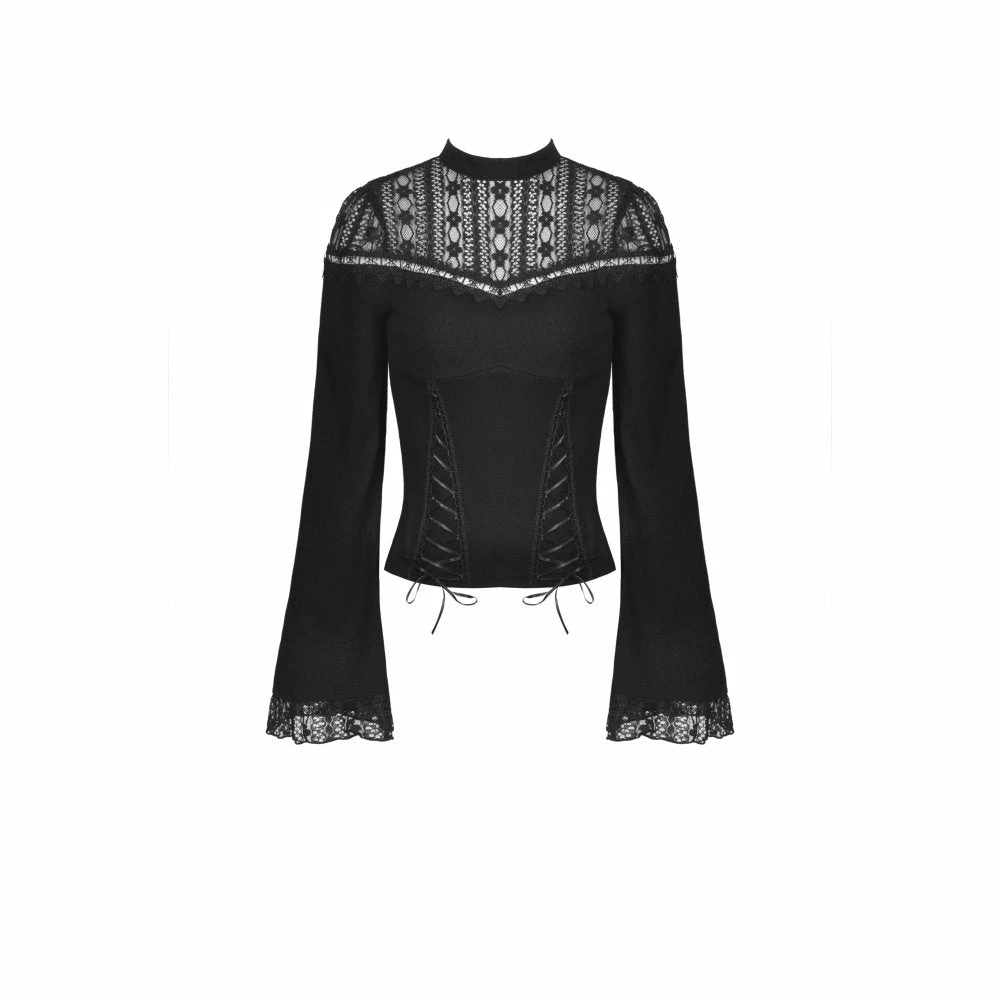 Beautifully detailed top by Dark in Love featuring long belled sleeves with lace trims and a patterned lace neckline. It also has two ribbon lace up features at the waist. Fastens with a button at the back of the neck.