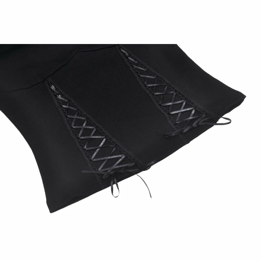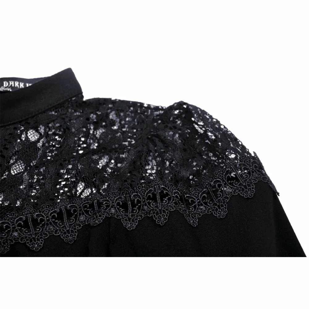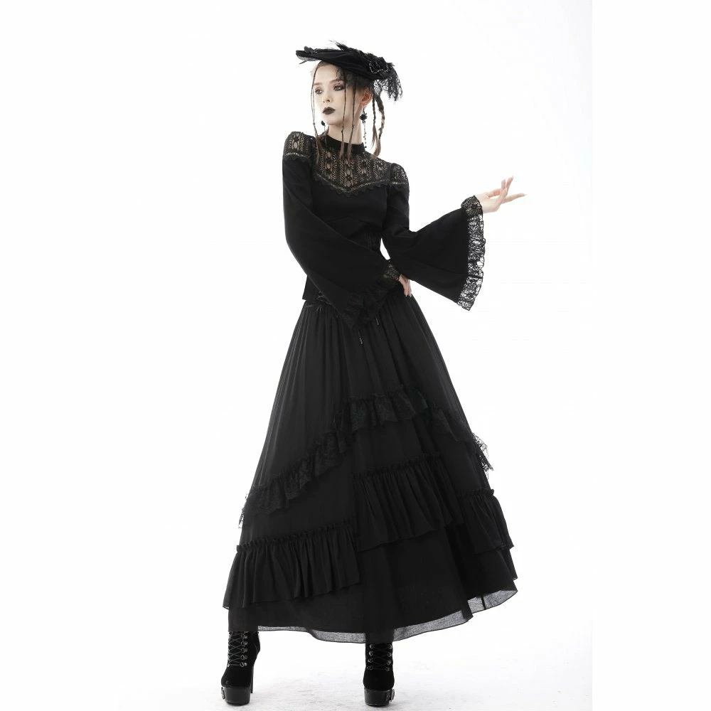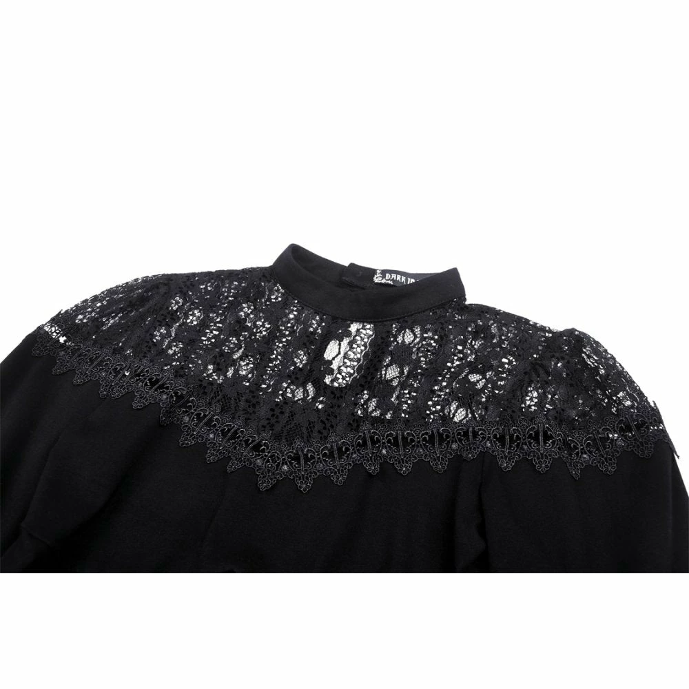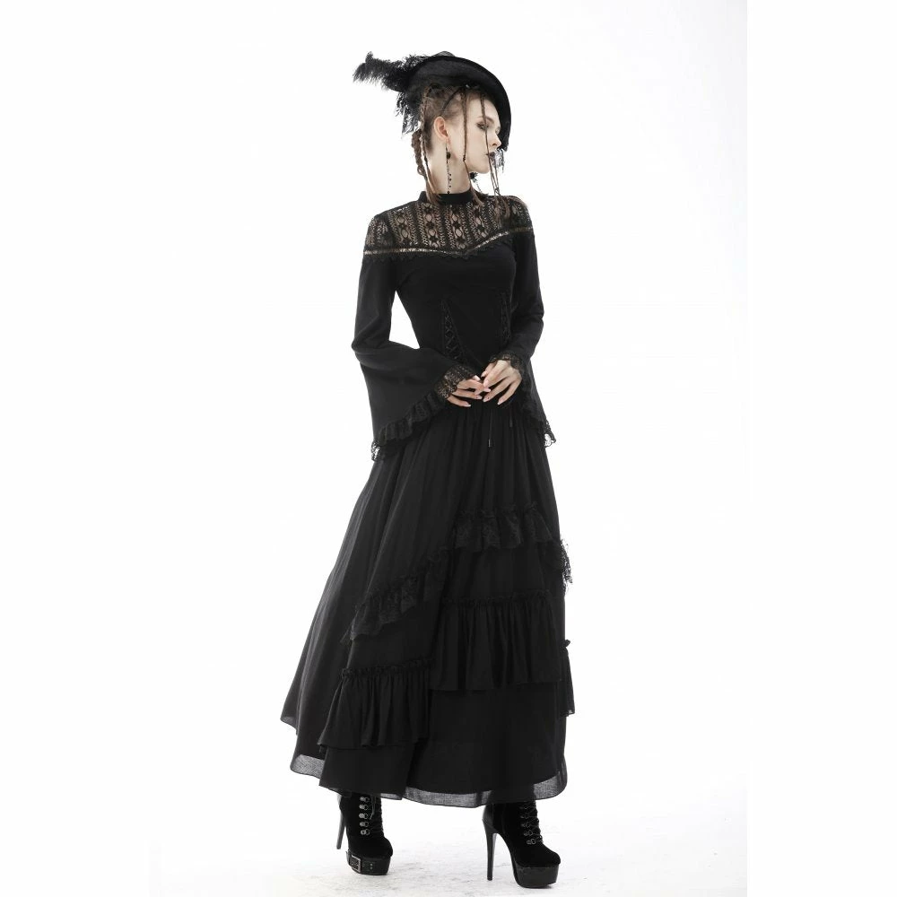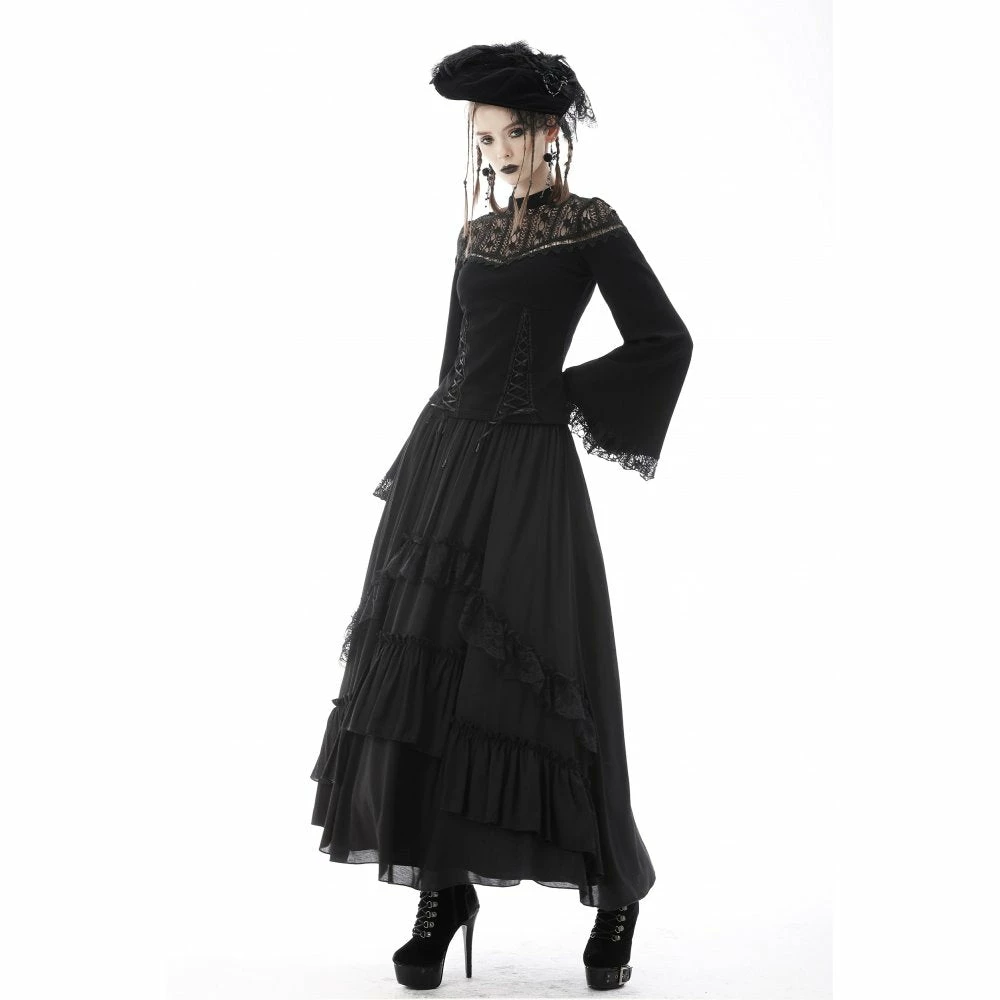 Beautifully detailed top by Dark in Love featuring long belled sleeves with lace trims and a patterned lace neckline. It also has two ribbon lace up features at the waist. Fastens with a button at the back of the neck.