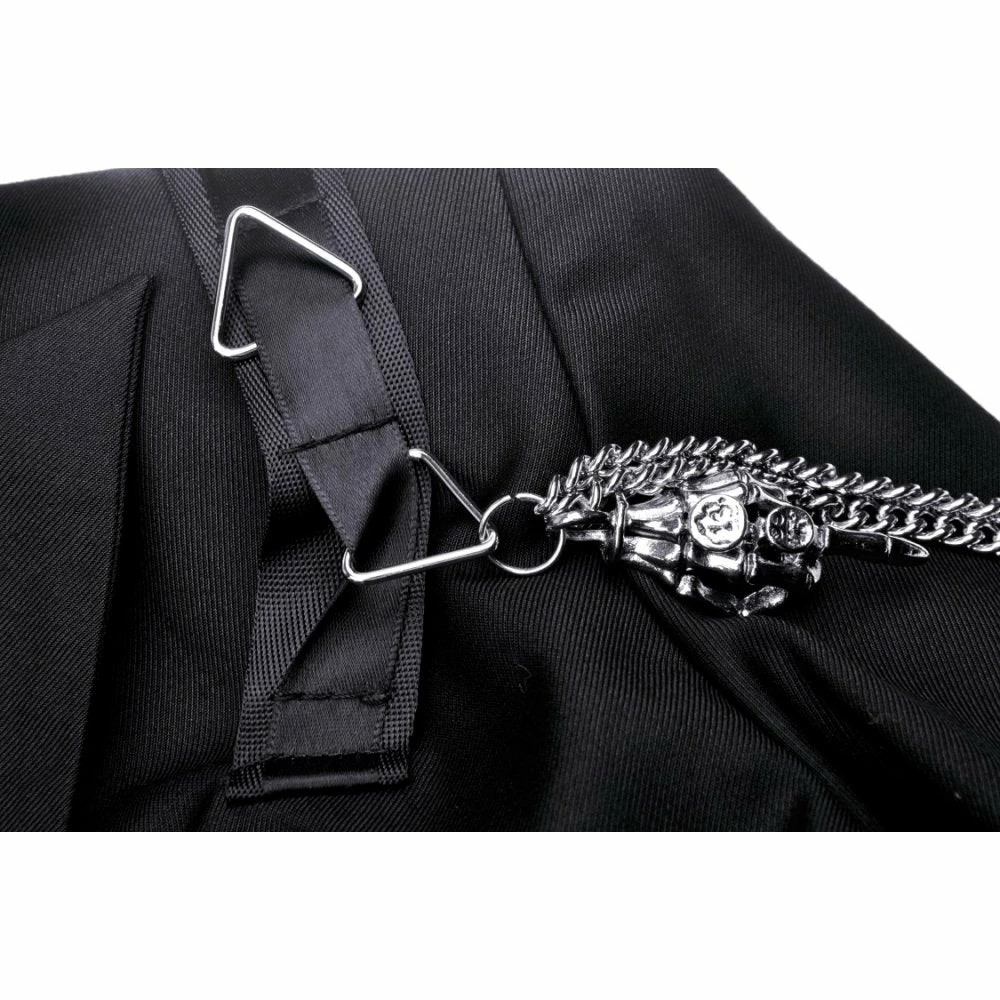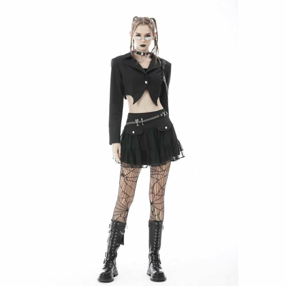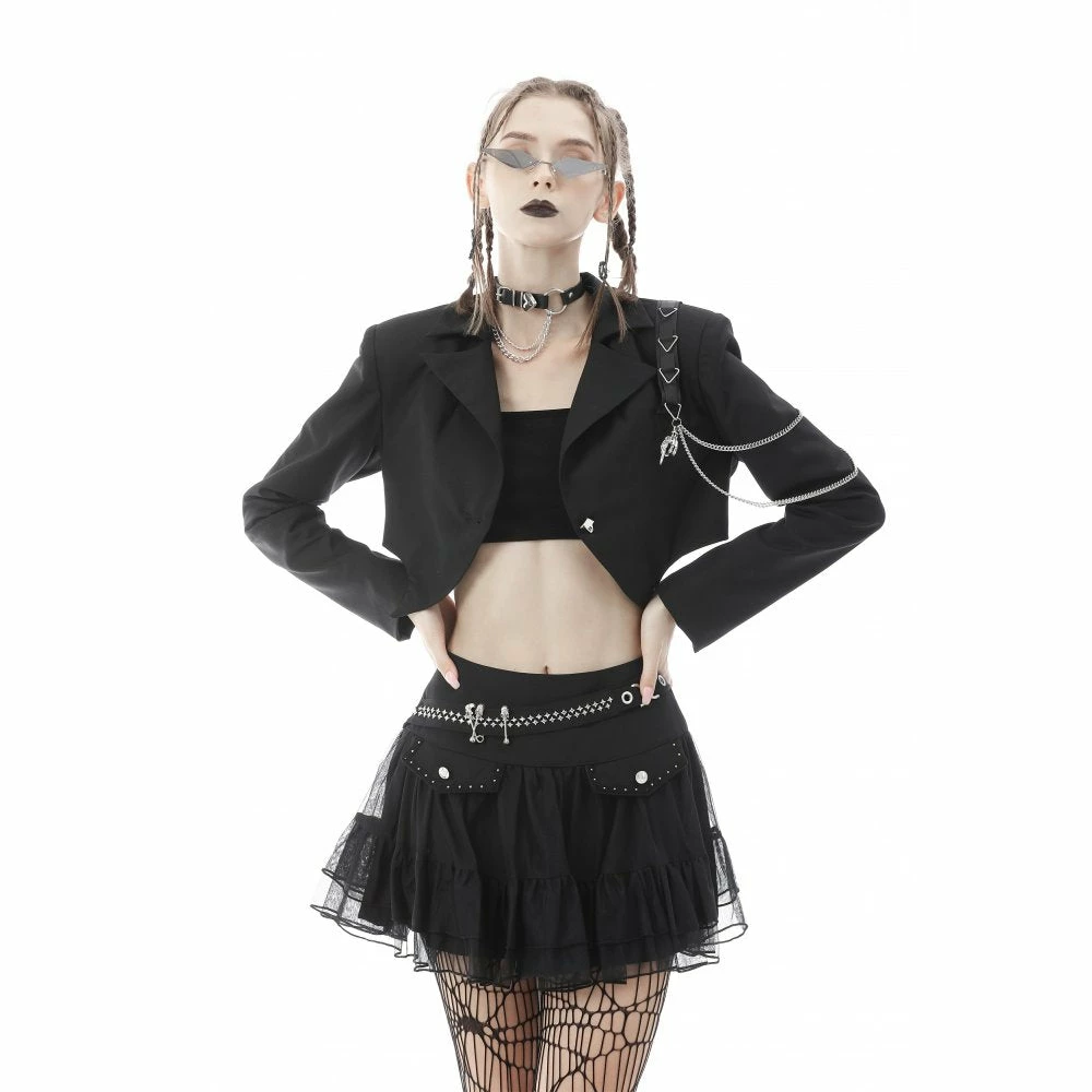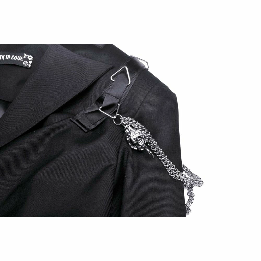 Breathtaking black cropped jacket from Dark In Love with long sleeves and a front button fastening! This jacket is full of attitude. It features a batwing inspired hem with metal chains plus skeletal hand with middle finger extended hanging from the shoulder .