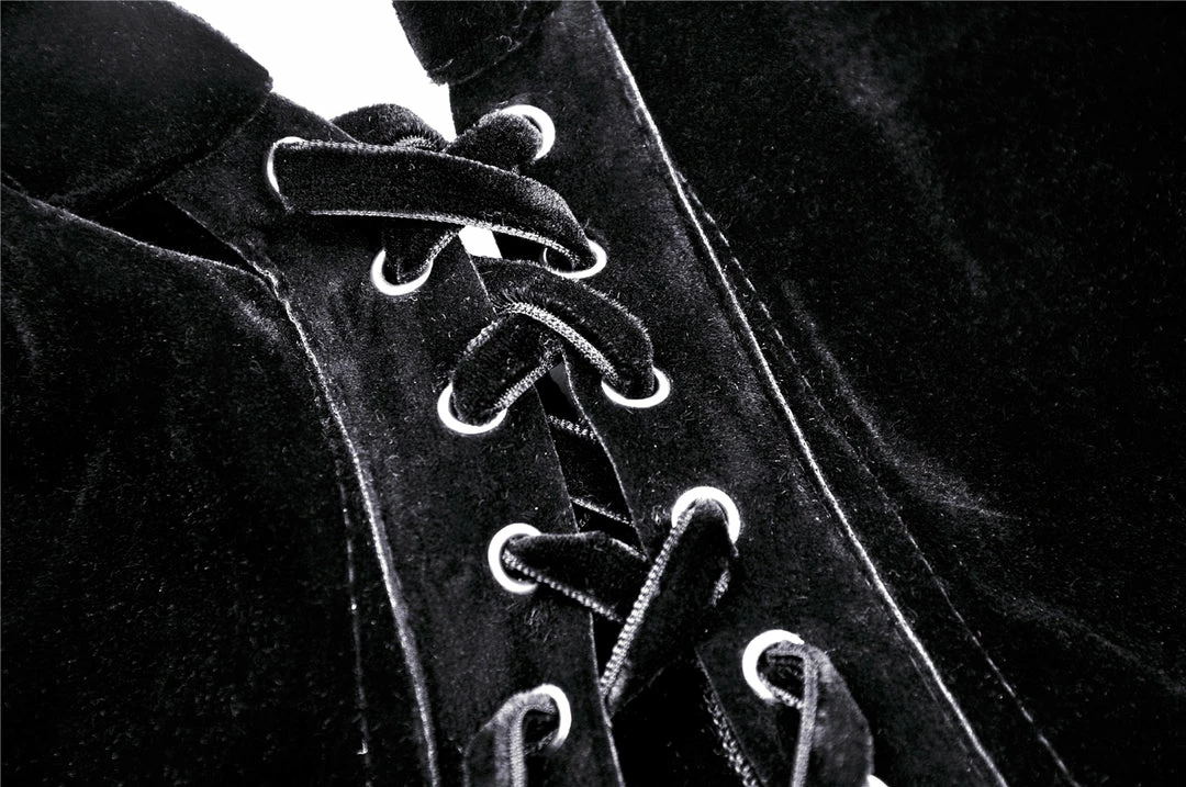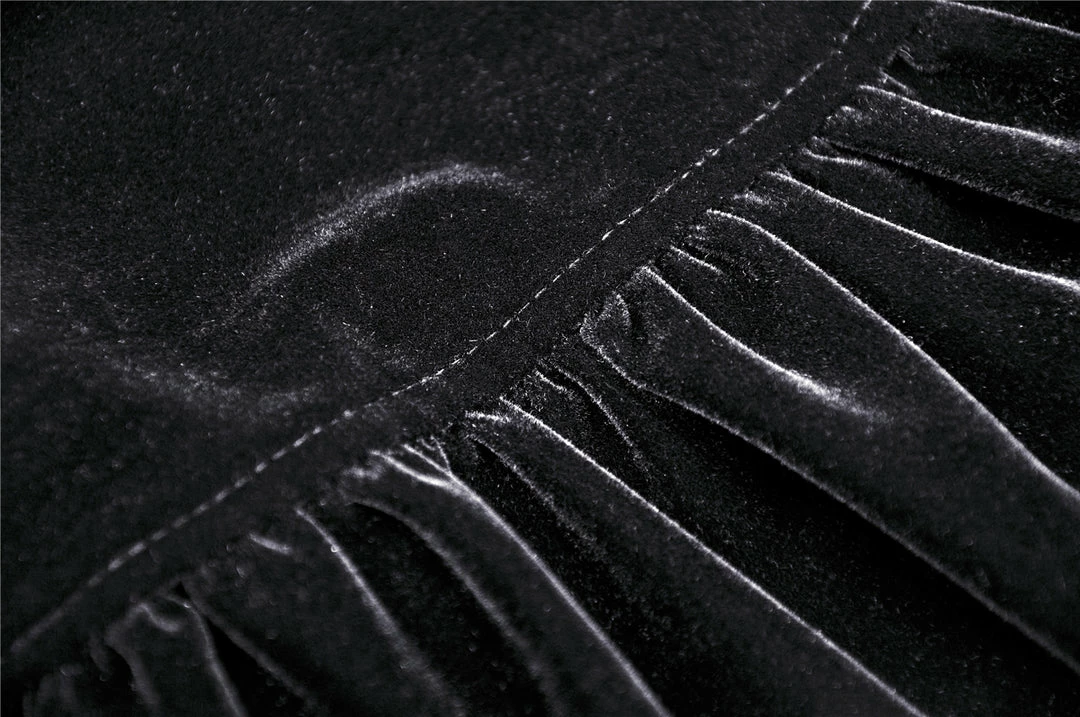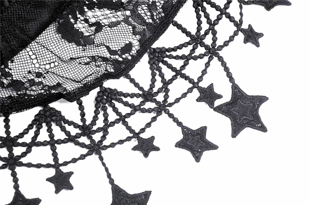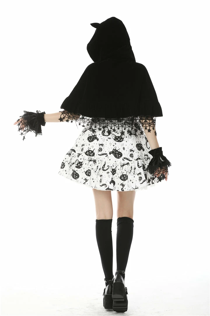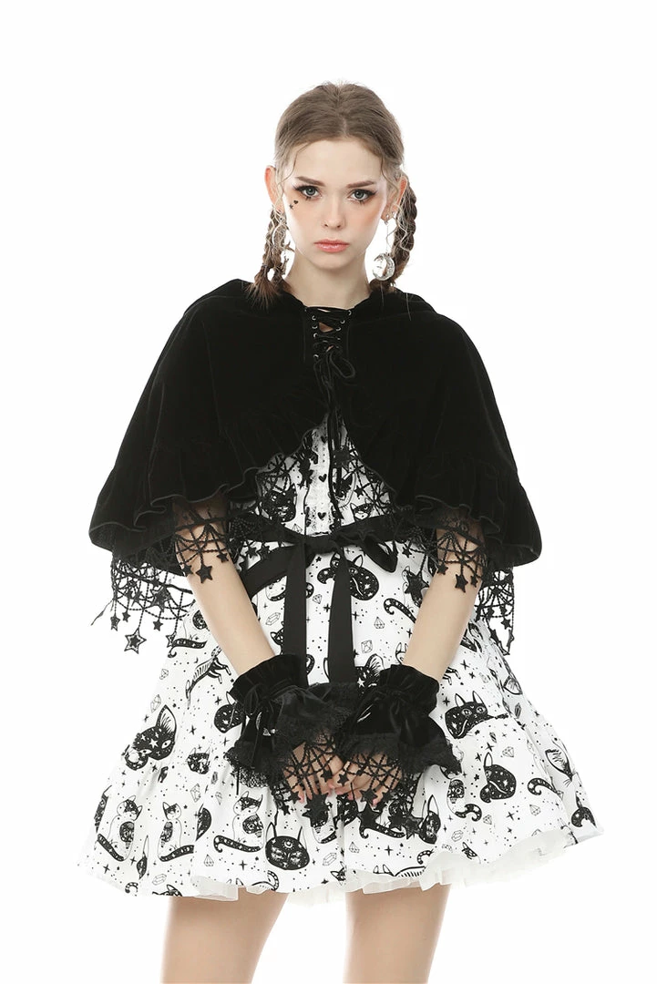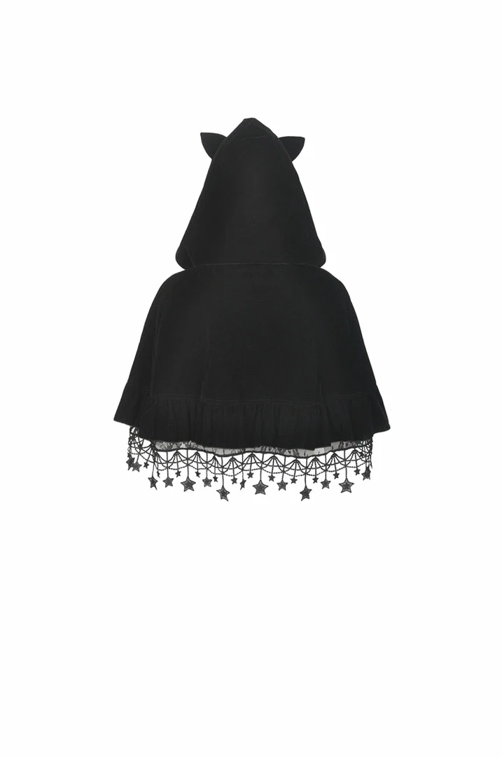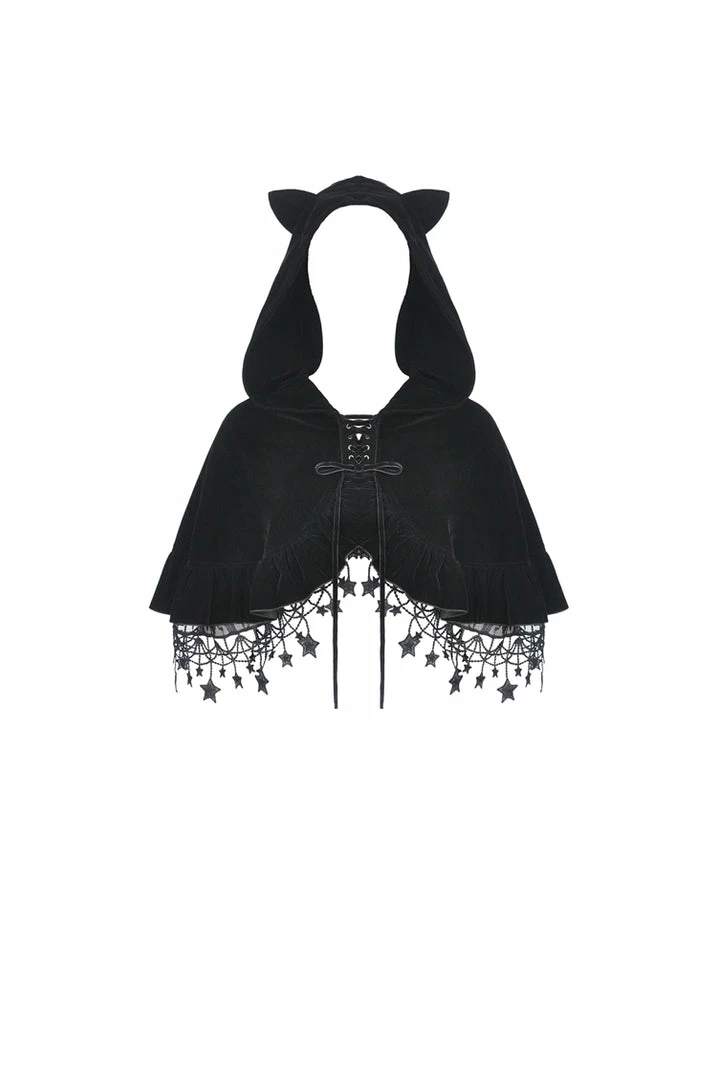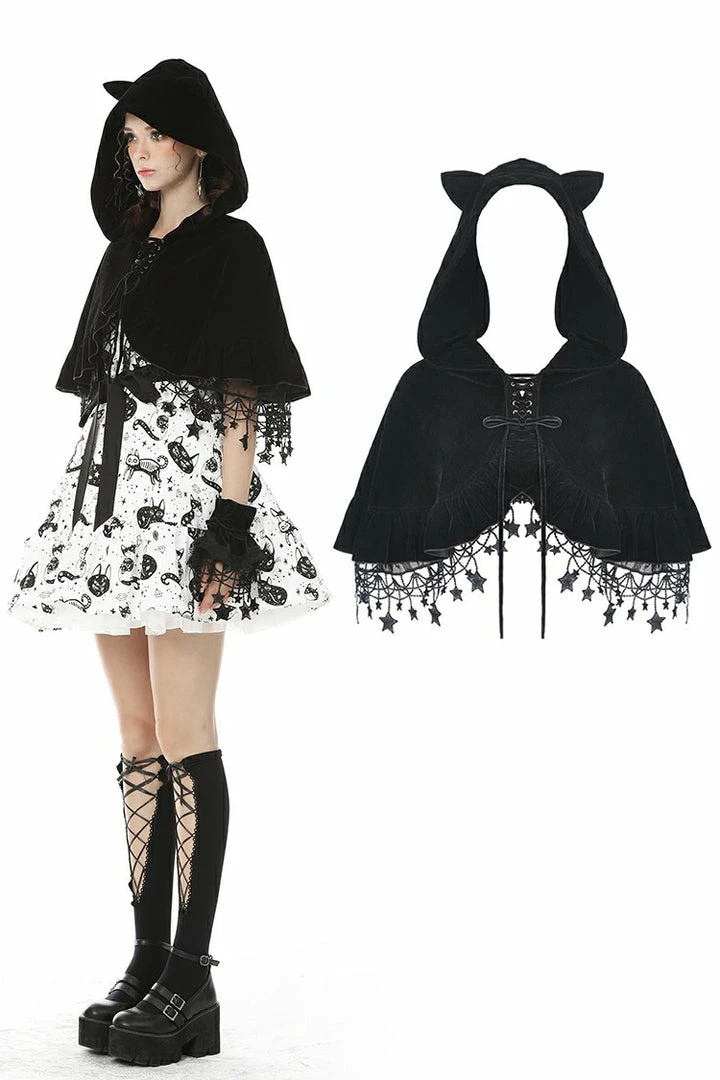 Add a touch of drama to your Gothic wardrobe with this stunning capelet from Dark In Love! Made from a sumptuous black velvet, this stunning capelet features embroidered lace star detailing along the hemline, as well as velvet ribbon lacing fastening the front. An oversize hood with cute cat ears gives this striking cape that finishing touch. For the perfect fit please see Dark in Loves size guide in the images.