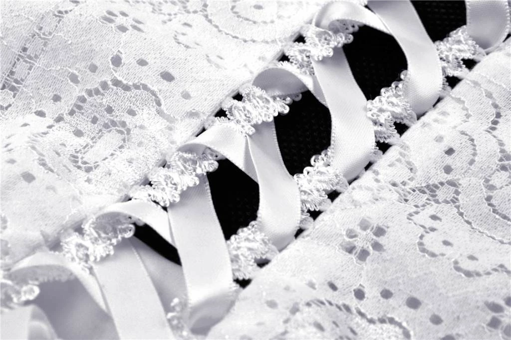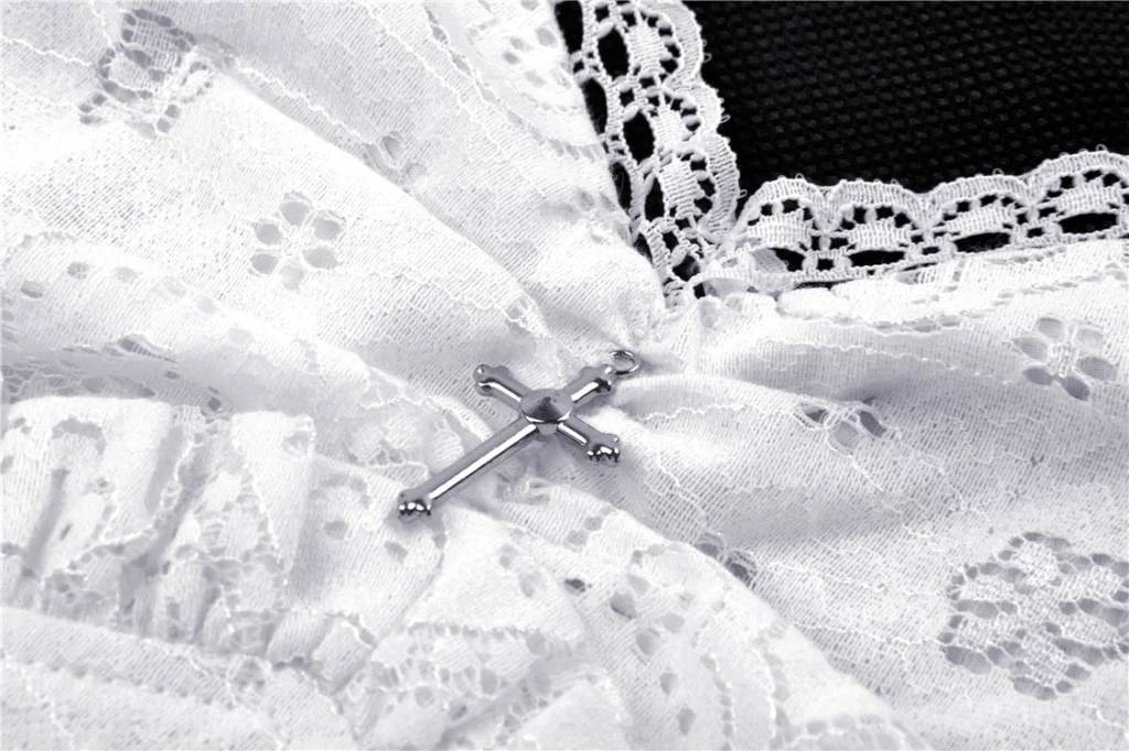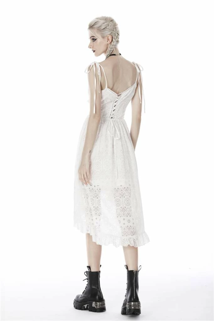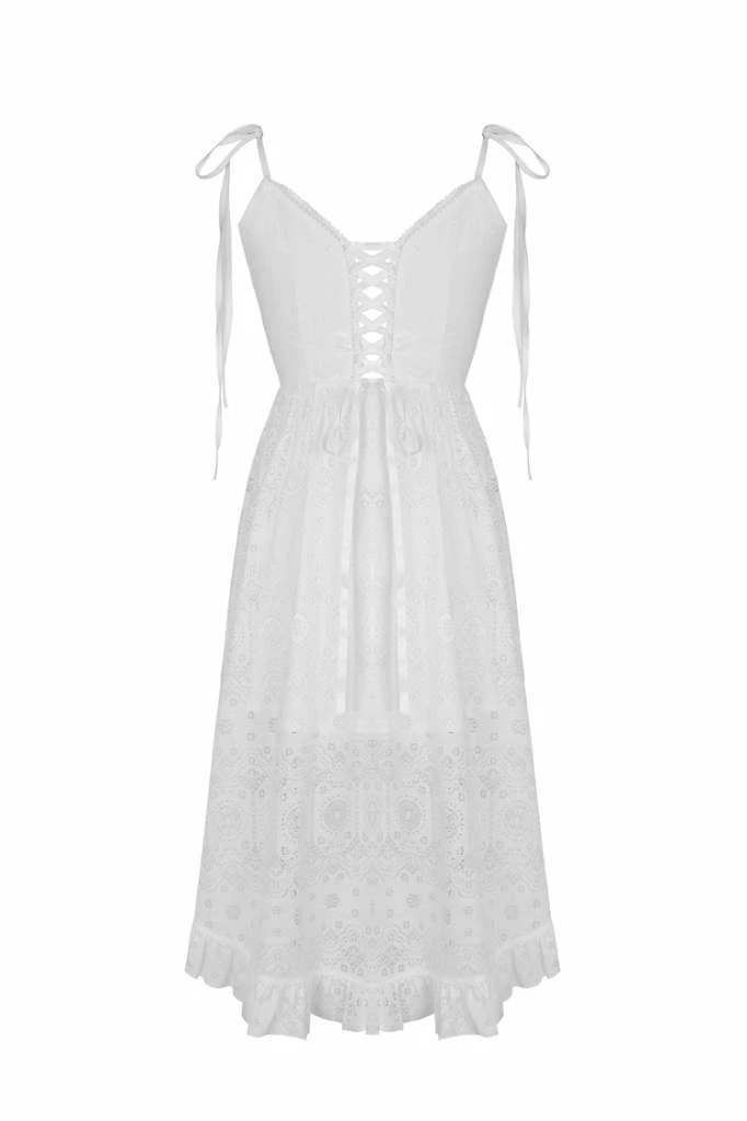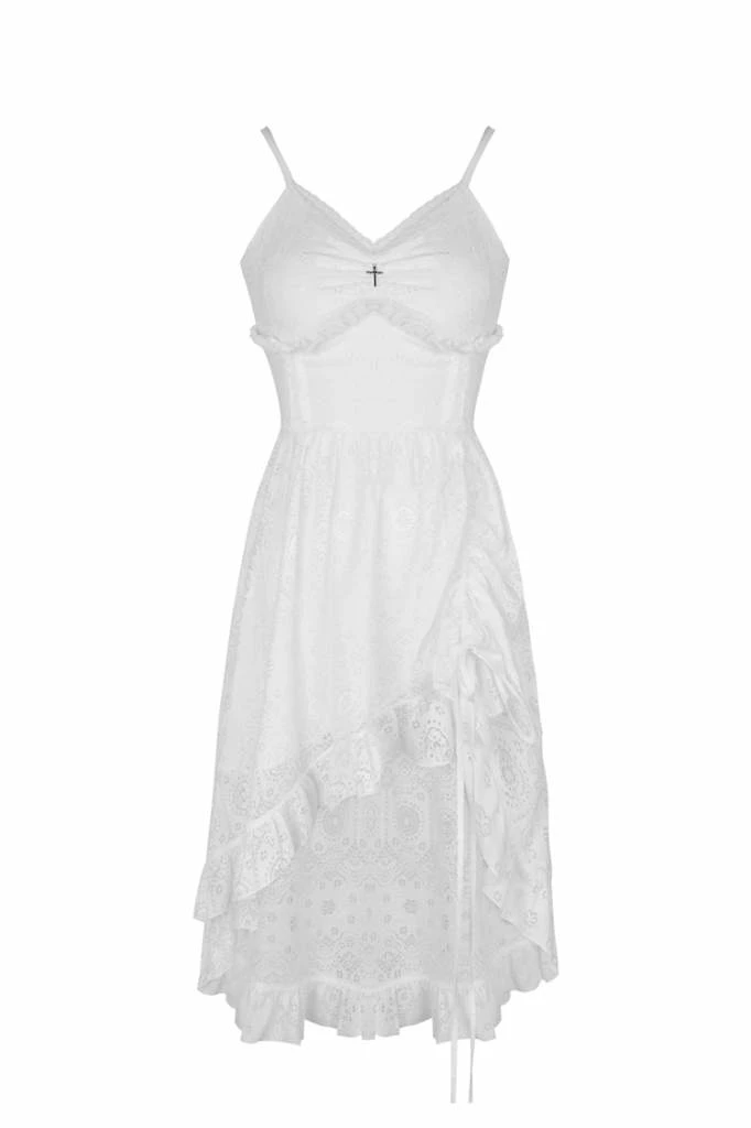 Beautifully detailed dress by Dark in Love in a stunning, fully lined, white lace with adjustable tied spaghetti straps, ruffled edge under bust seam and silver coloured cross adornment. Corset-inspired lacing to the back and a ruched effect to the high/low hemline complete this must-have dress.