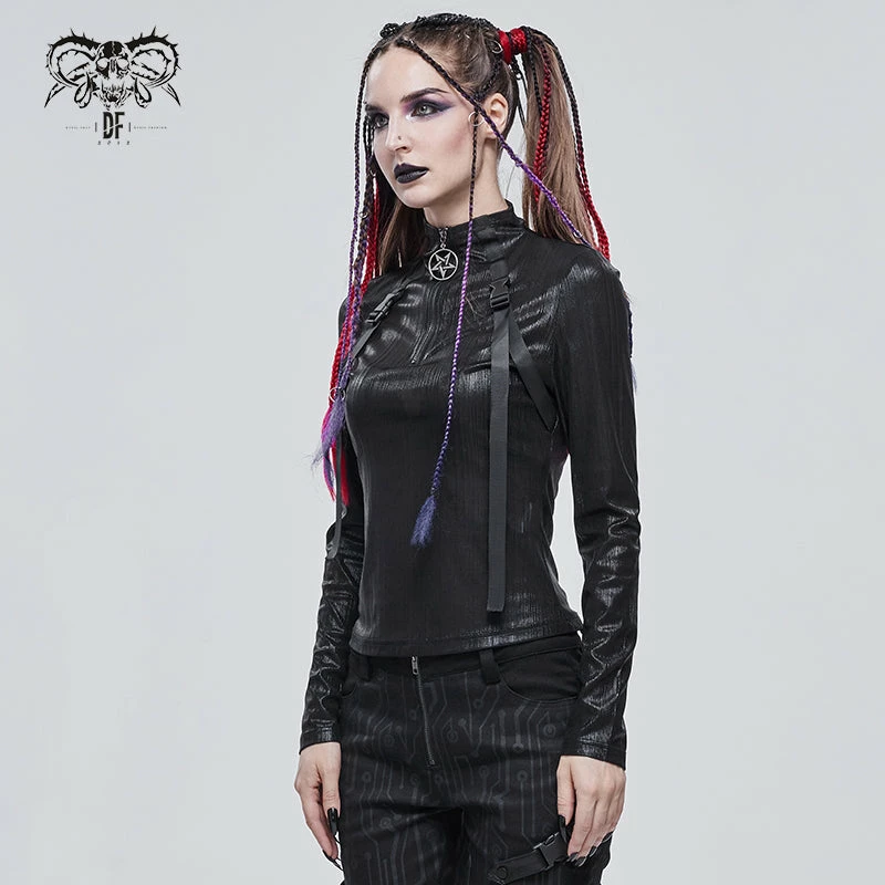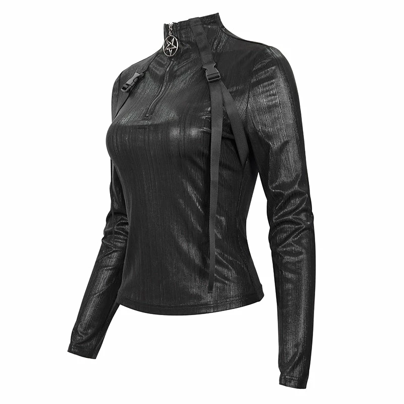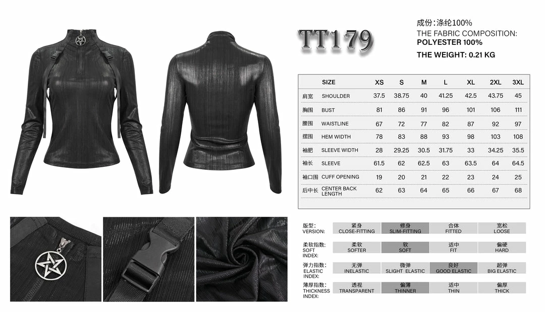Stunning black high neck long sleeved top from Devil Fashion. This must-have top is made from textured lightweight fabric that is fitted to show off your figure. This striking top features a zip up top with metal pentagram pull and hanging strap details for a stand out look that is both powerful and versatile!