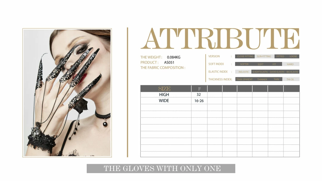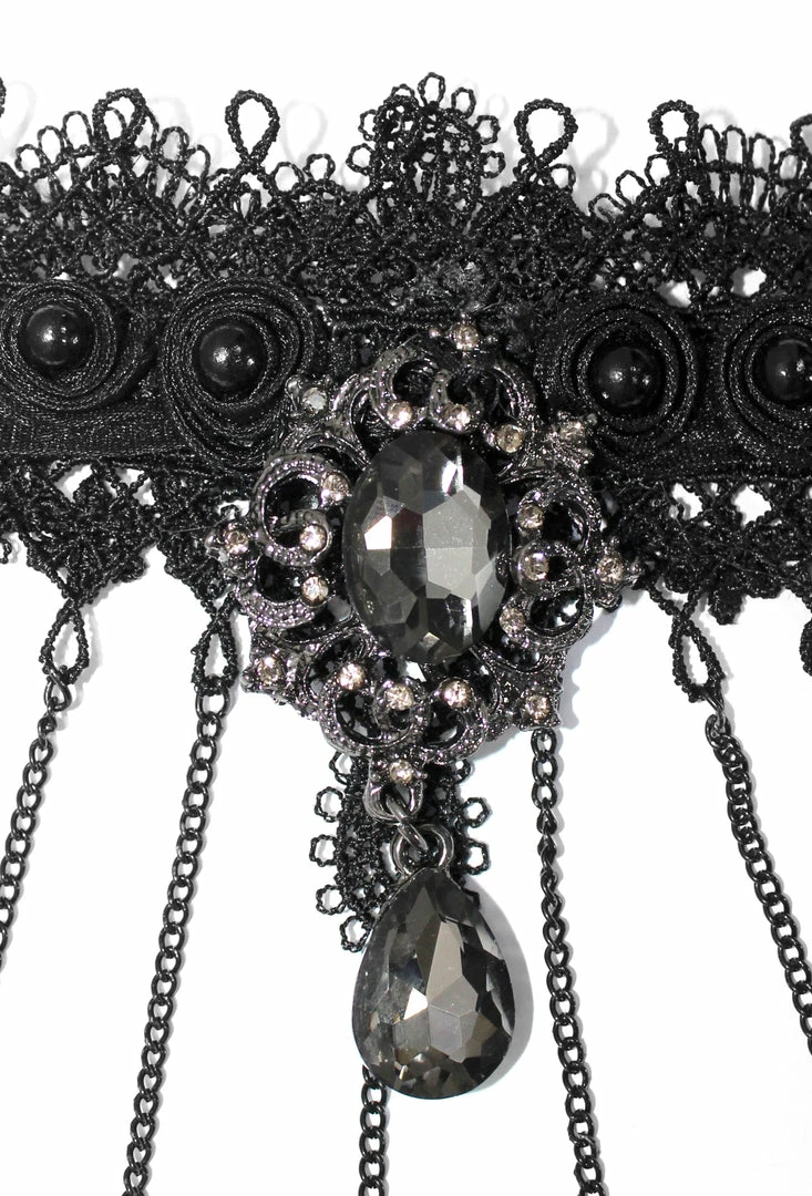 This stunning gothic accessory from Devil Fashion features a lace bracelet with an adjustable silver coloured chain and carabiner clasp fastening, black bead detailing and multi-faceted crystal adornments. Delicate black chains attach the bracelet to 5 beautiful filigree inspired black metal fingertips. Fingertips are open on the inside to carefully adjust for a comfortable fit and can be worn on either hand.