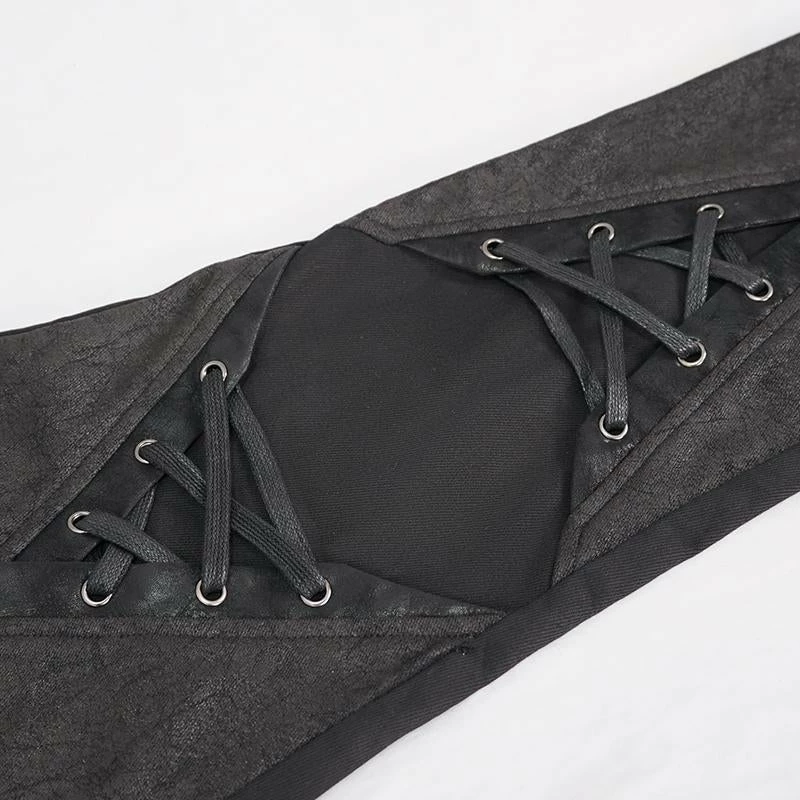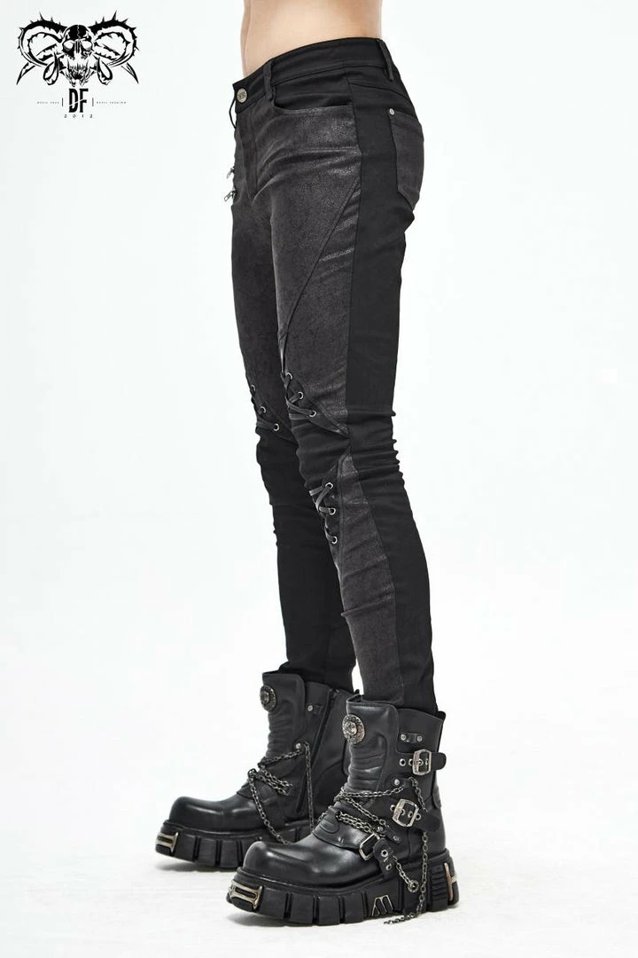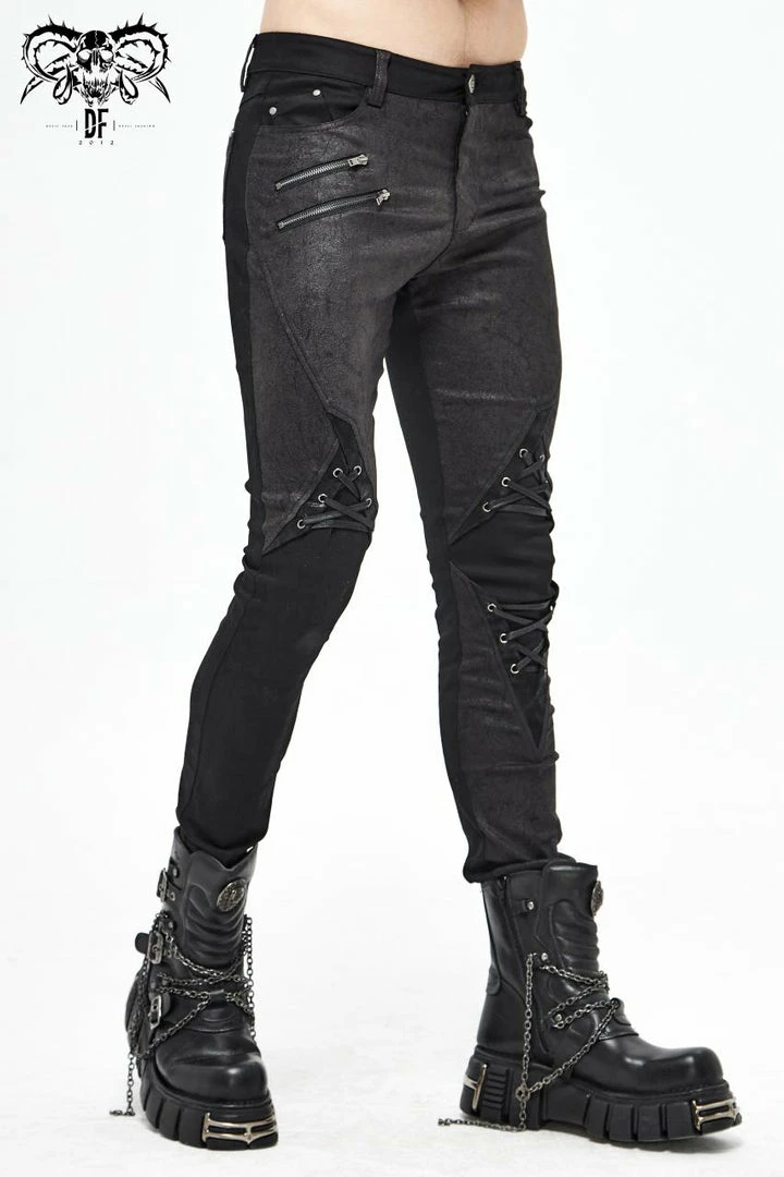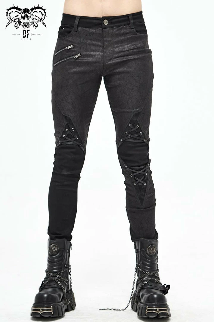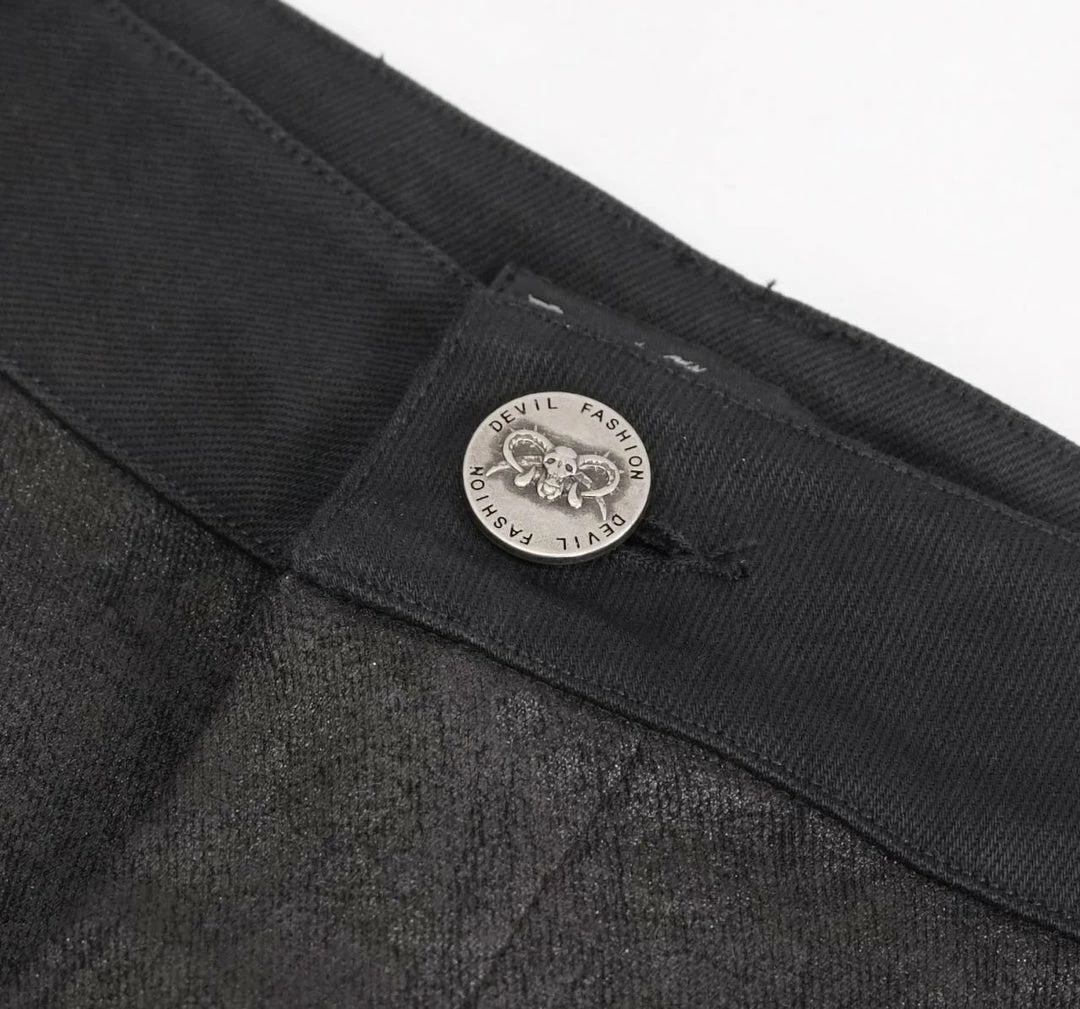 These fabulous jeans from Devil Fashion feature textured panels with faux leather trim, lace-up detailing and zip accents. With zip and button front fastening, belt loops and pockets to the front and back. For the perfect fit please see Devil Fashion’s size guide in the images.