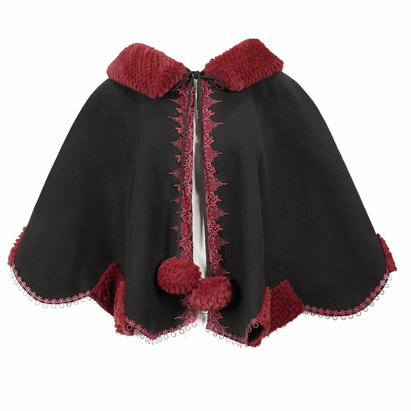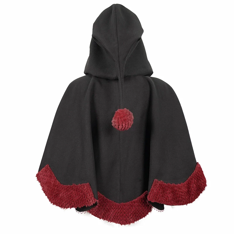 Luxurious black hooded cape with contrast red faux fur trims and embroidery. This visually stunning cape is made a loose fitting soft thick fabric that will keep you warm and look fabulous on!