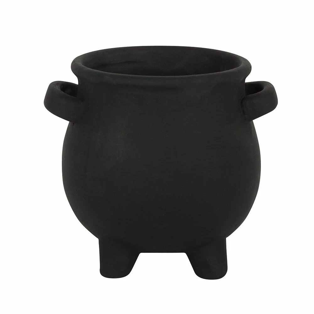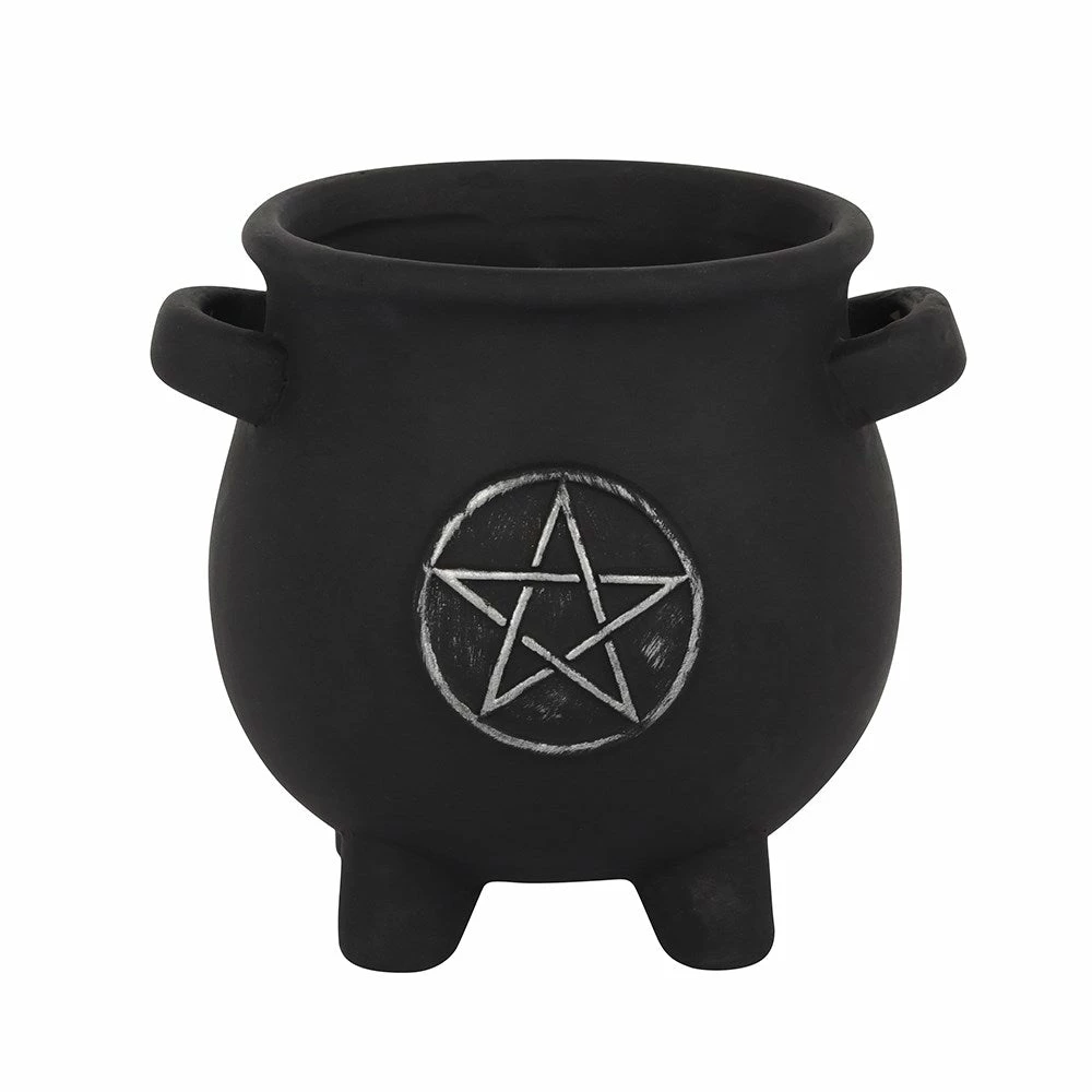 Cute little black terracotta plant pot in the shape of a witchy cauldron. With a glittery pentacle design this plant pot will look great on a sunny windowsill.