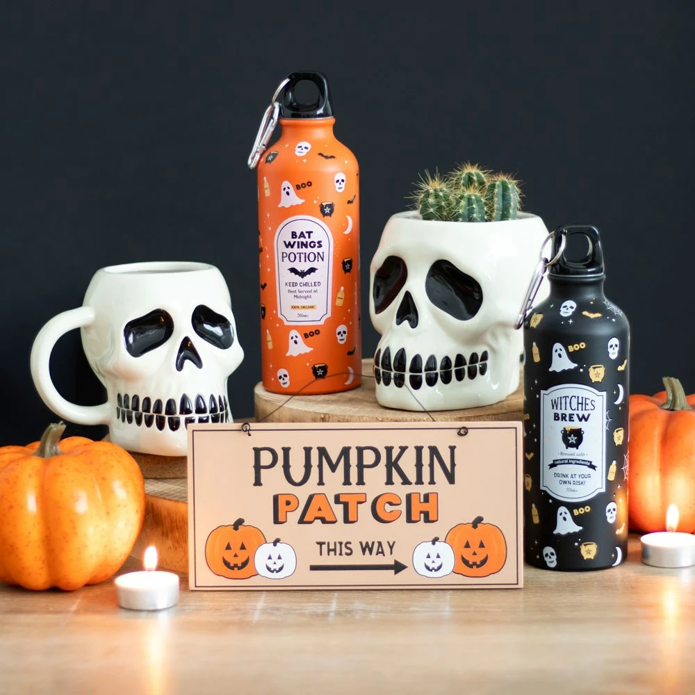 Spooky, witchy and practical, this re-usable water bottle is perfect for keeping us hydrated! This 500ml metal water bottle makes a great, eco-friendly replacement for plastic and features a screw-top lid and convenient clip for taking on the go. Designed with a fun Halloween print of cute little ghosts, skulls, bats and other Halloween designs and vintage-inspired ‘Witches Brew’ illustration that is truly bewitching.