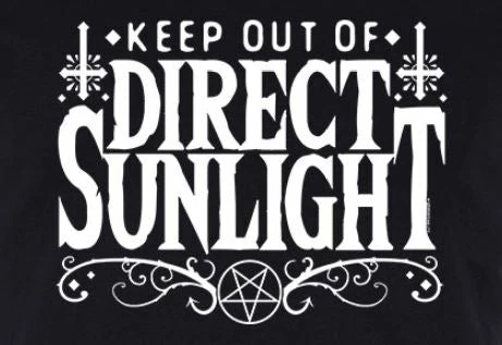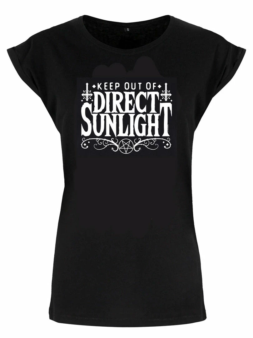 This gorgeous top features the text ‘Keep Out Of Direct Sunlight’ with inverted cross and pentagram details, a perfect top that looks amazing on.