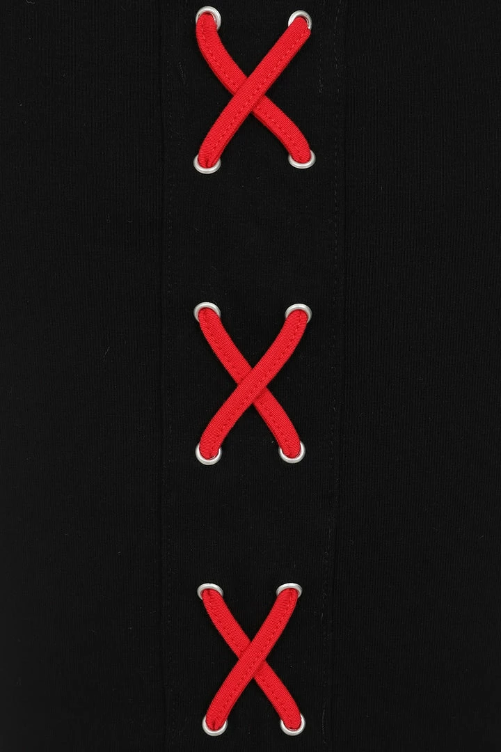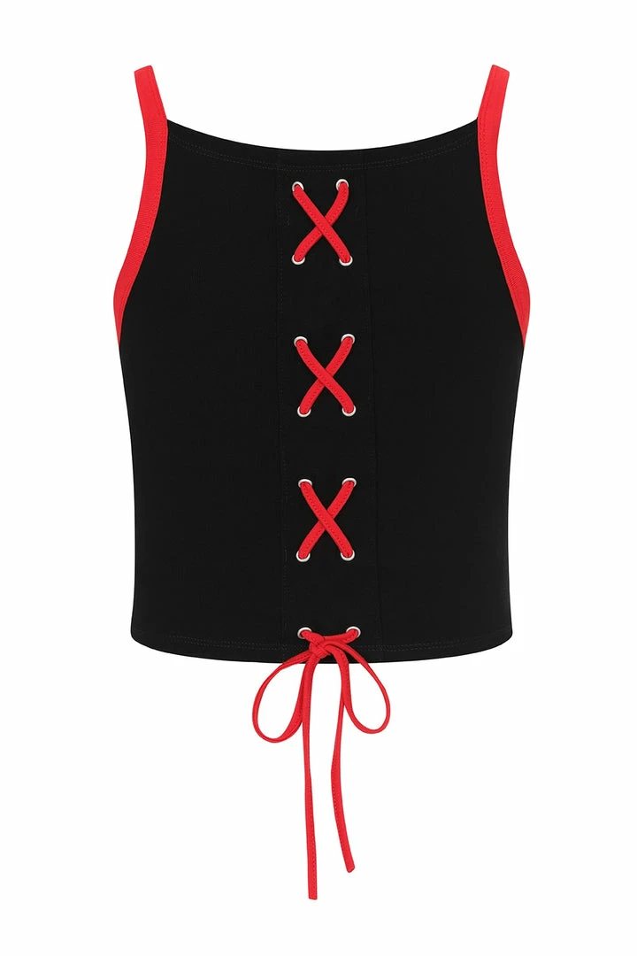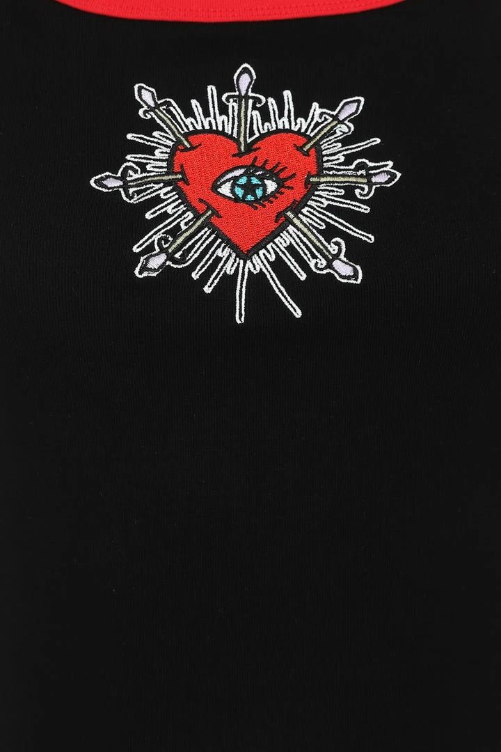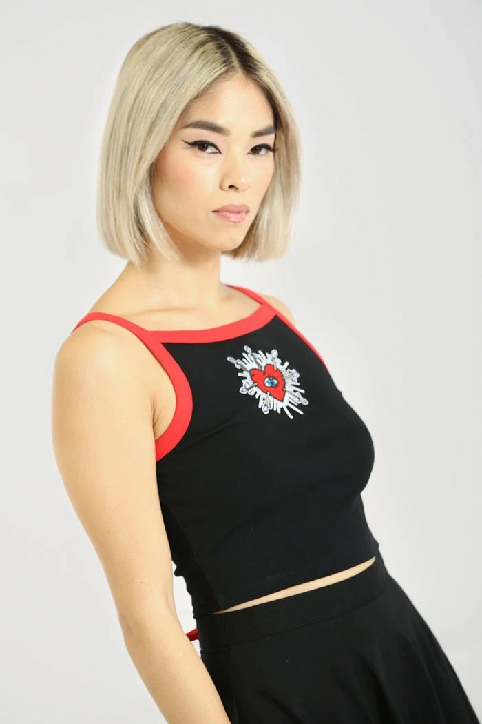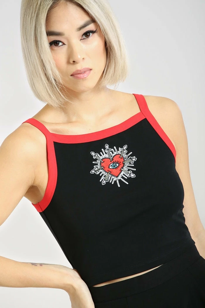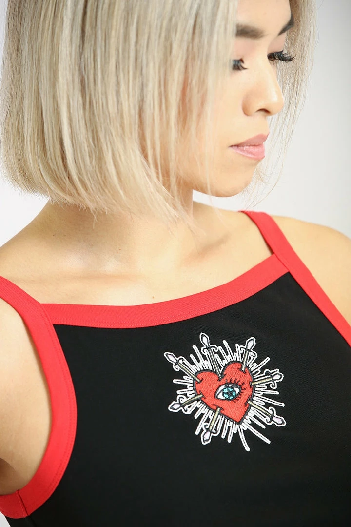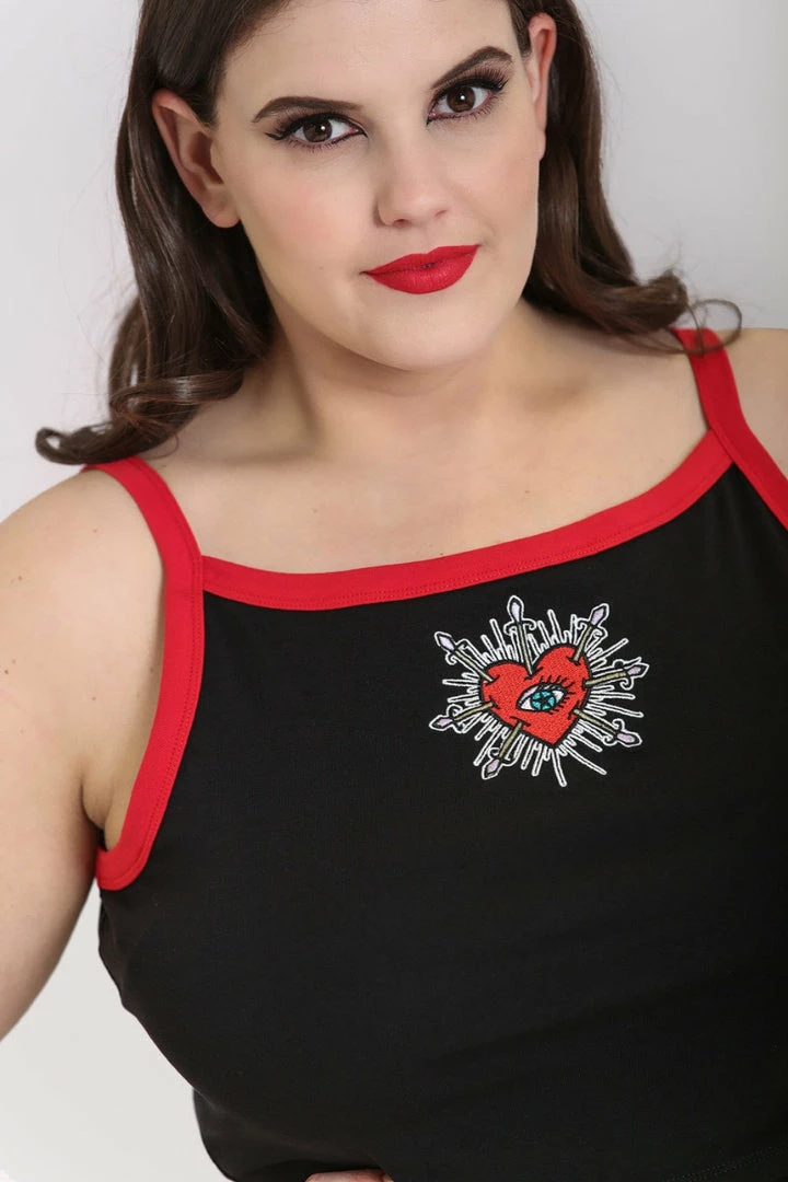 Lovely black slightly cropped vest top with contrast swords and heart embroidery on the front from Hell Bunny. This comfy and flirty sleeveless crop top is made from a soft cotton fabric that you’ll love to lounge in. It features contrast red trims and red lace up detailing on the back.
