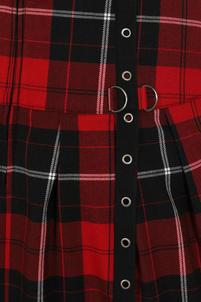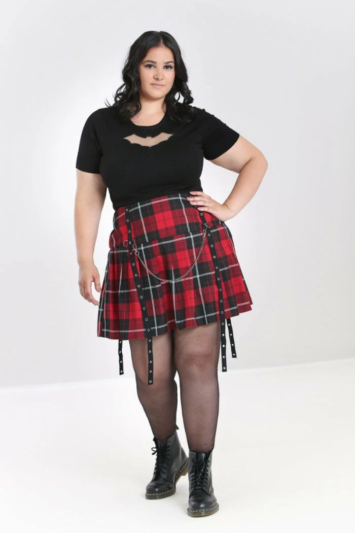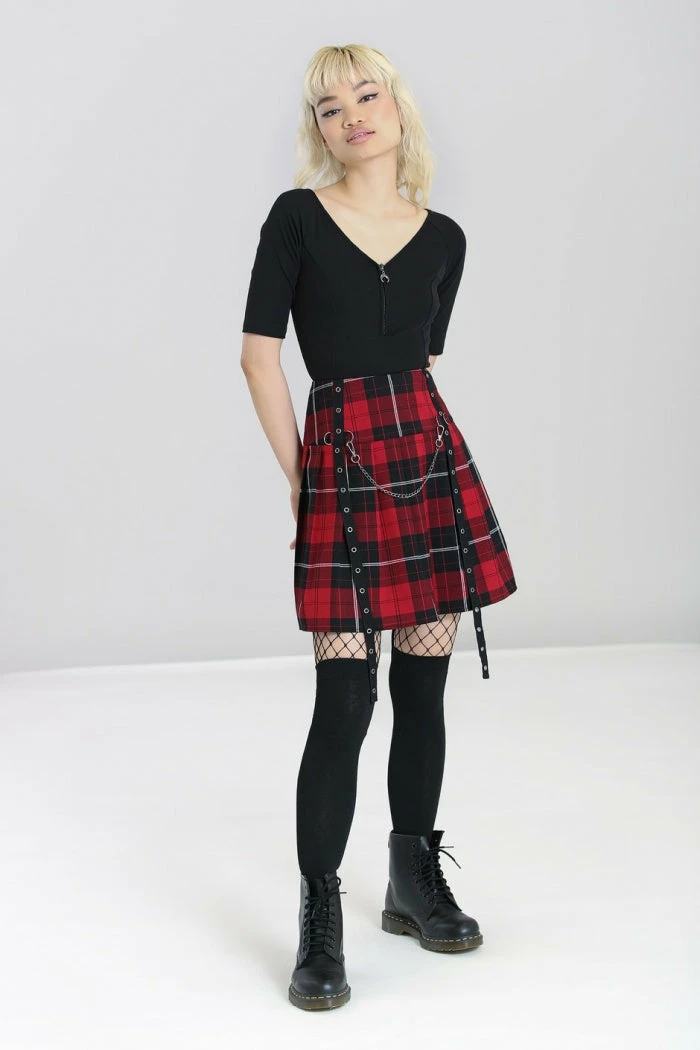 Lovely red tartan mini skirt from Hell Bunny with classic pleats. This versatile and stylish skirt has a wide fitted waistband and fastens with a zip and button at the back. It also features silver chains and black eyelet detailing for a stylish edge. Looks perfect and flatters your figure whether you dress it up or down!