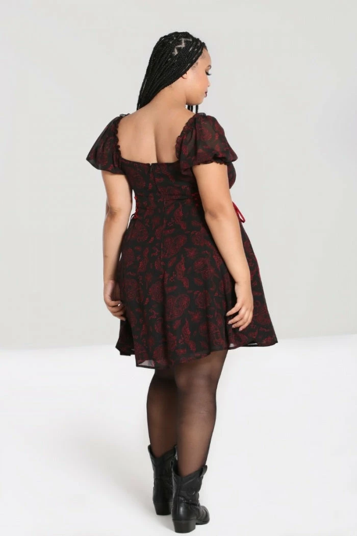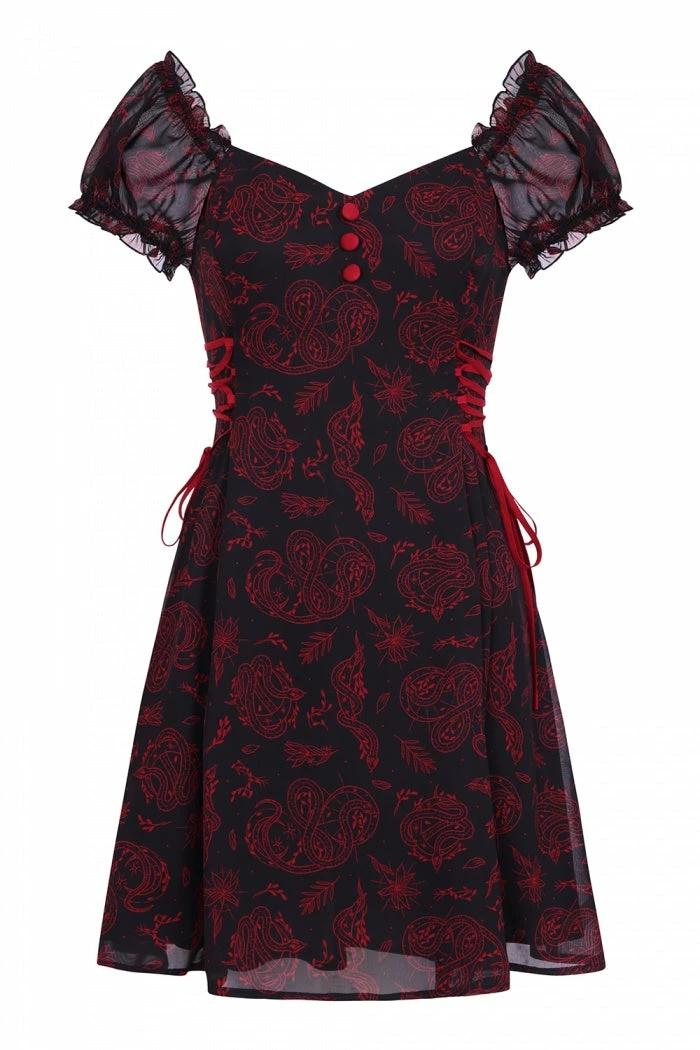 Gorgeous black chiffon maxi dress with red contrast snake and moon print from Hell Bunny. This awesome short sleeve dress features frills on the sleeves, ruffled V neckline with adjustable red lace up side detailing and centre buttons and fastens with a back zip. This lovely dress has an opaque black lining, is fitted at the waist and then flares out. It looks great dressed up or down!