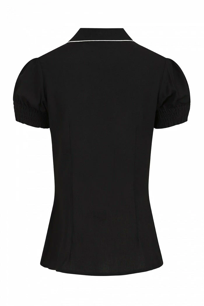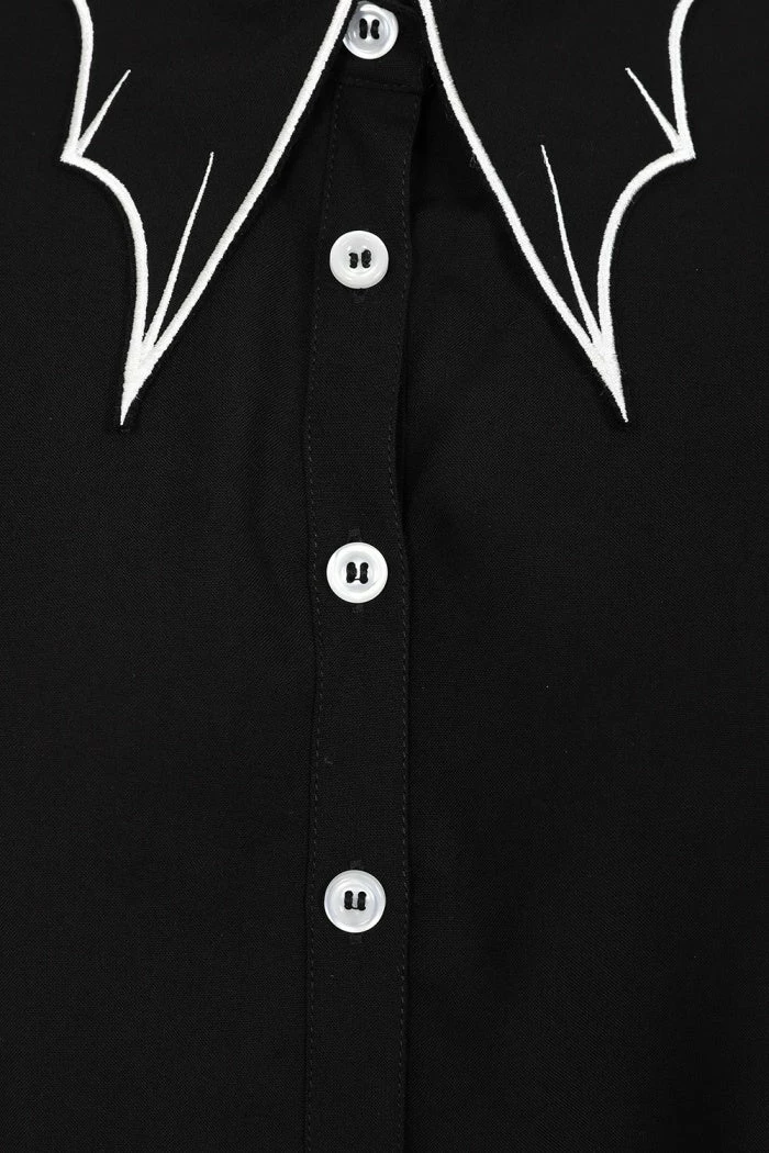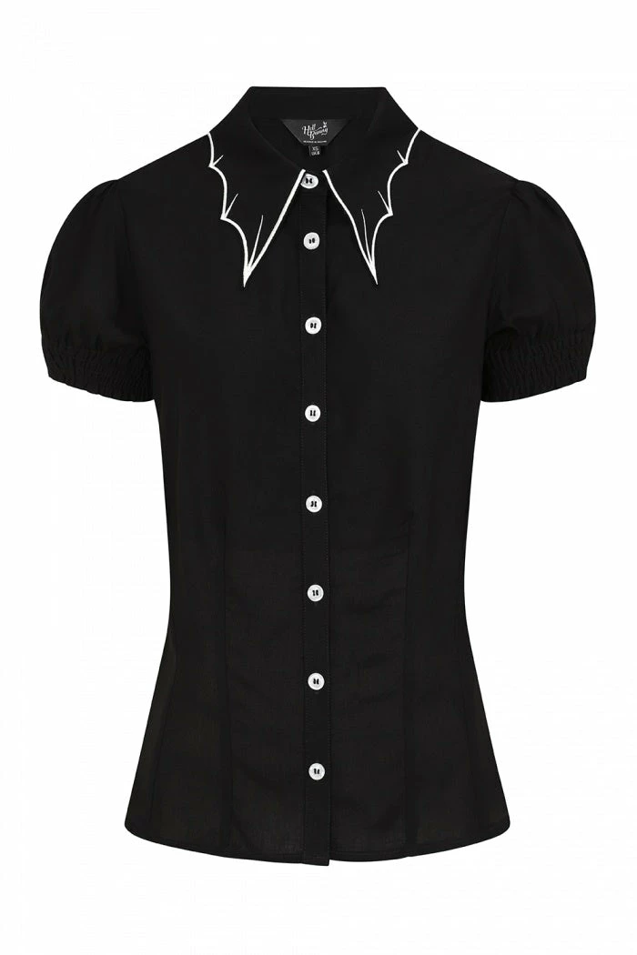 Stunning black blouse with bat wing collar from Hell Bunny in a glamorous semi fitted style. This gorgeous button up shirt features white contrast embroidery and short puff sleeves with elasticated edginn. The buttons are white contrast and the blouse looks awesome dressed up or down!