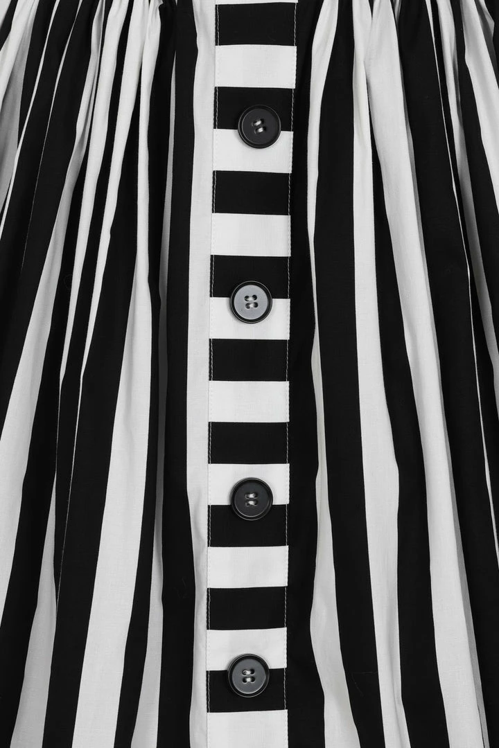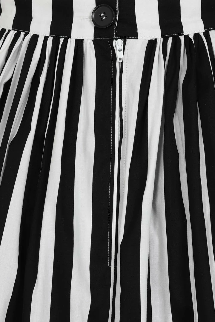 Update your spooky wardrobe with the Hell Bunny Beetlejuice-inspired monochrome stripe Juno 50’s Skirt. Black and white striped swing skirt with decorative glossy black buttons running down the front. The high waist is nipped in with a zip & button fastening at the back and gathering from the waistband to add volume. With pockets in the side seams… of course!