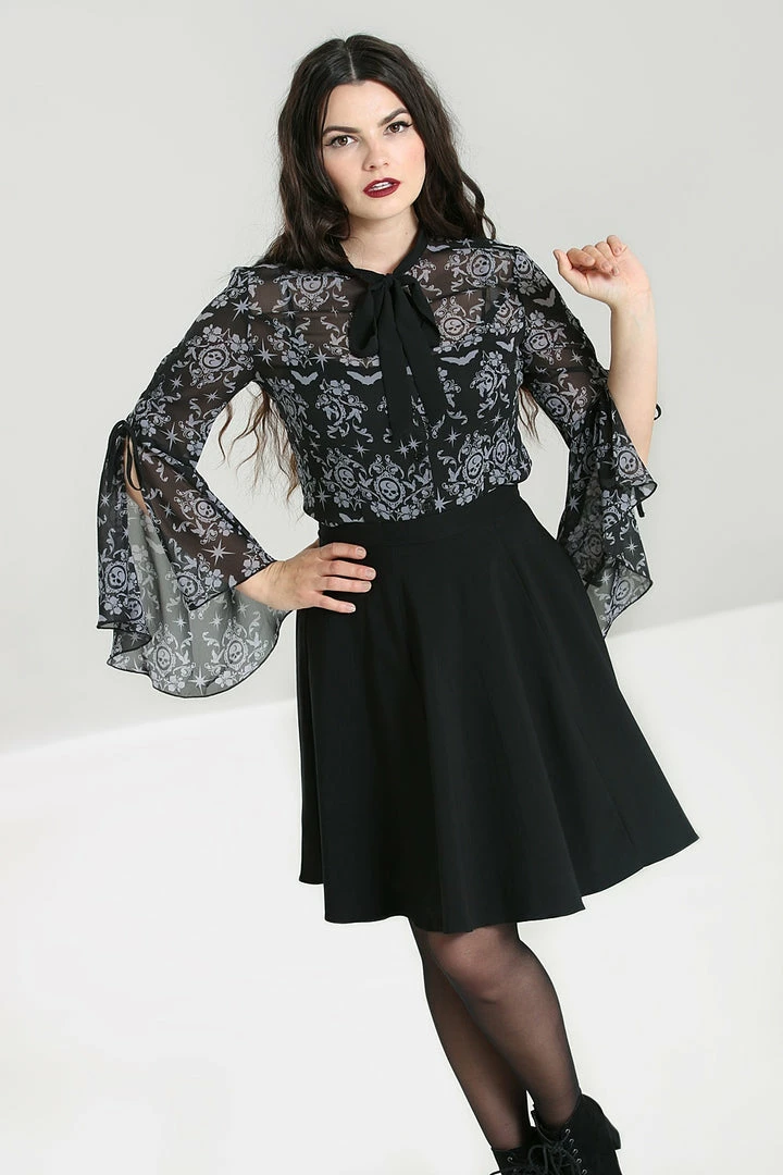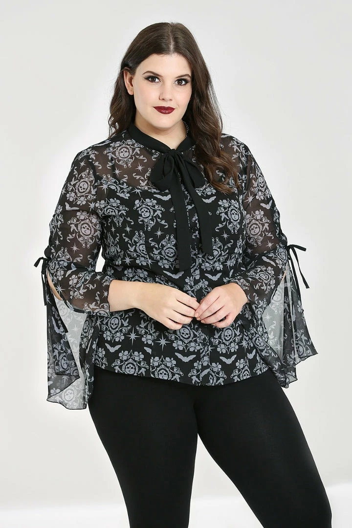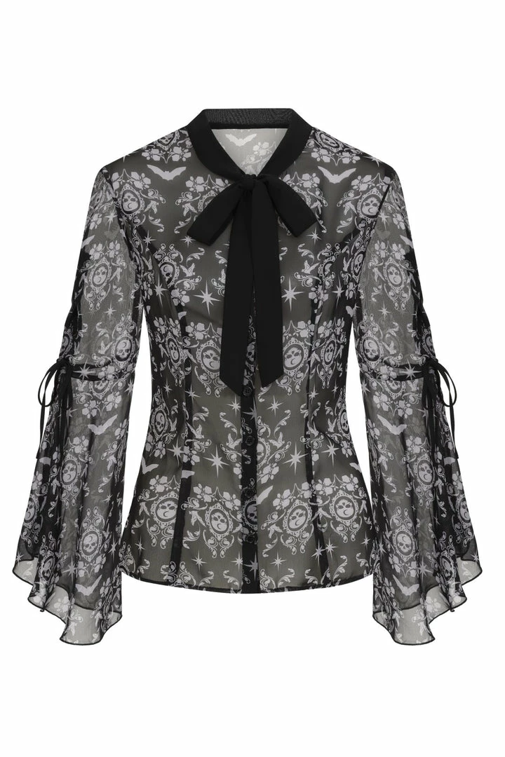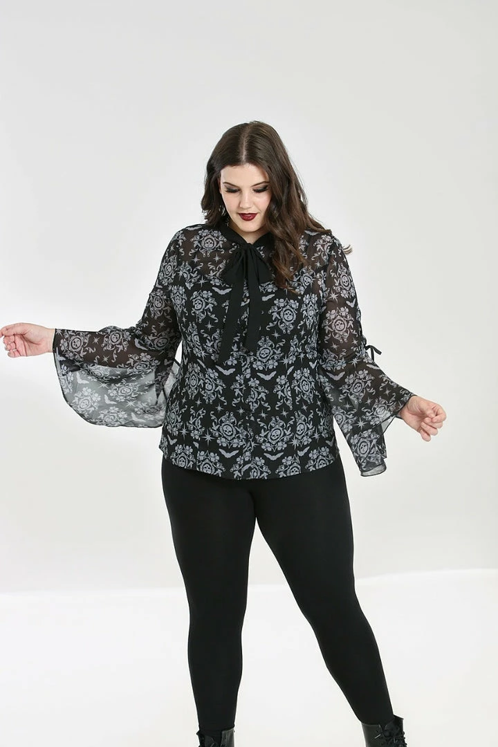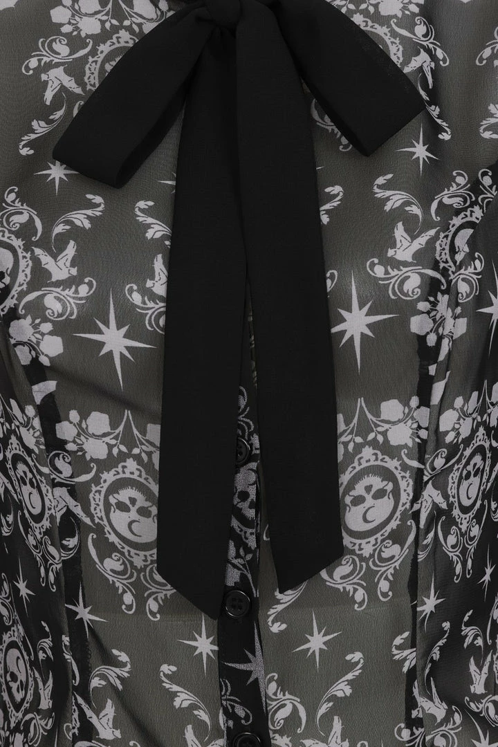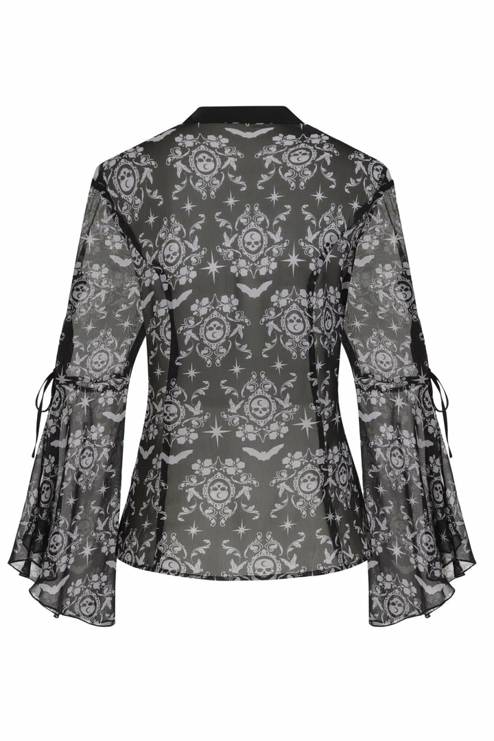 This beautiful printed chiffon blouse whispers as it moves! Black semi-fitted chiffon blouse with a timeless gothic ornate artwork in grey with black buttons to fasten. It features a black contrasting neck tie and dramatic flared sleeves with black lace up detailing which moves with the slightest of breeze. The length reaches the middle of the hips, so can be worn tucked in or out. Please note: this style is see-through so wear over a bralet or cami.