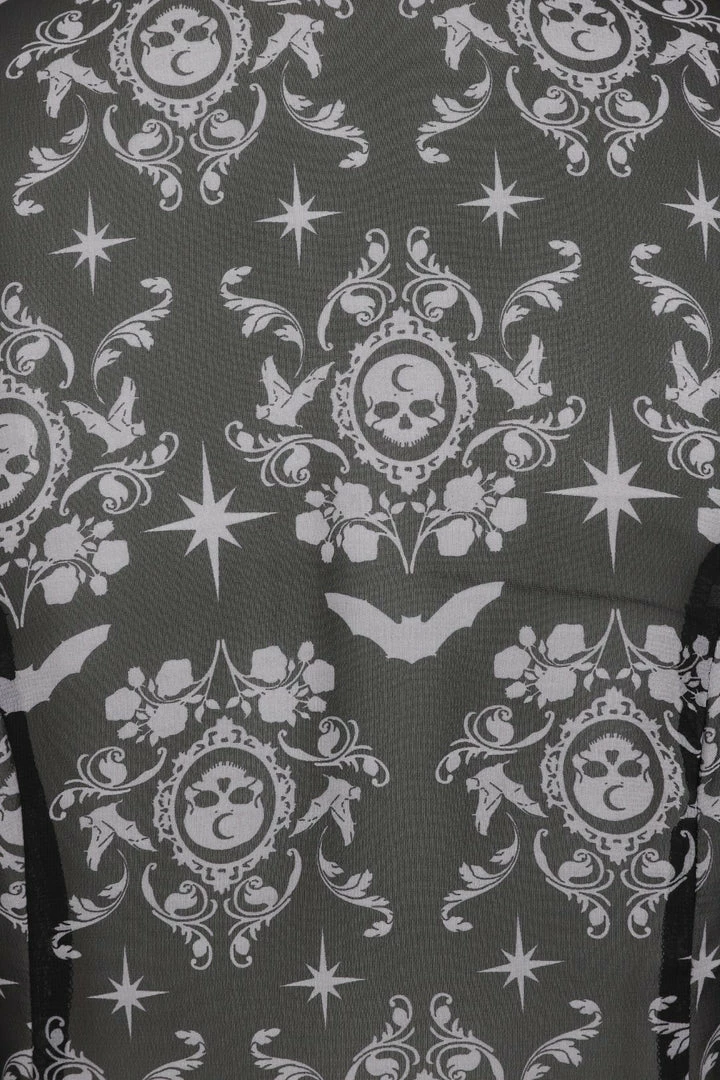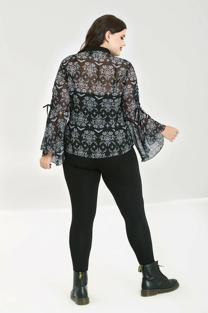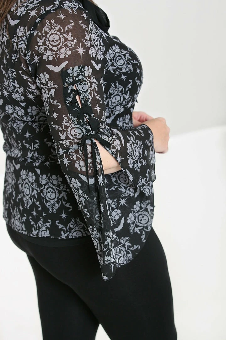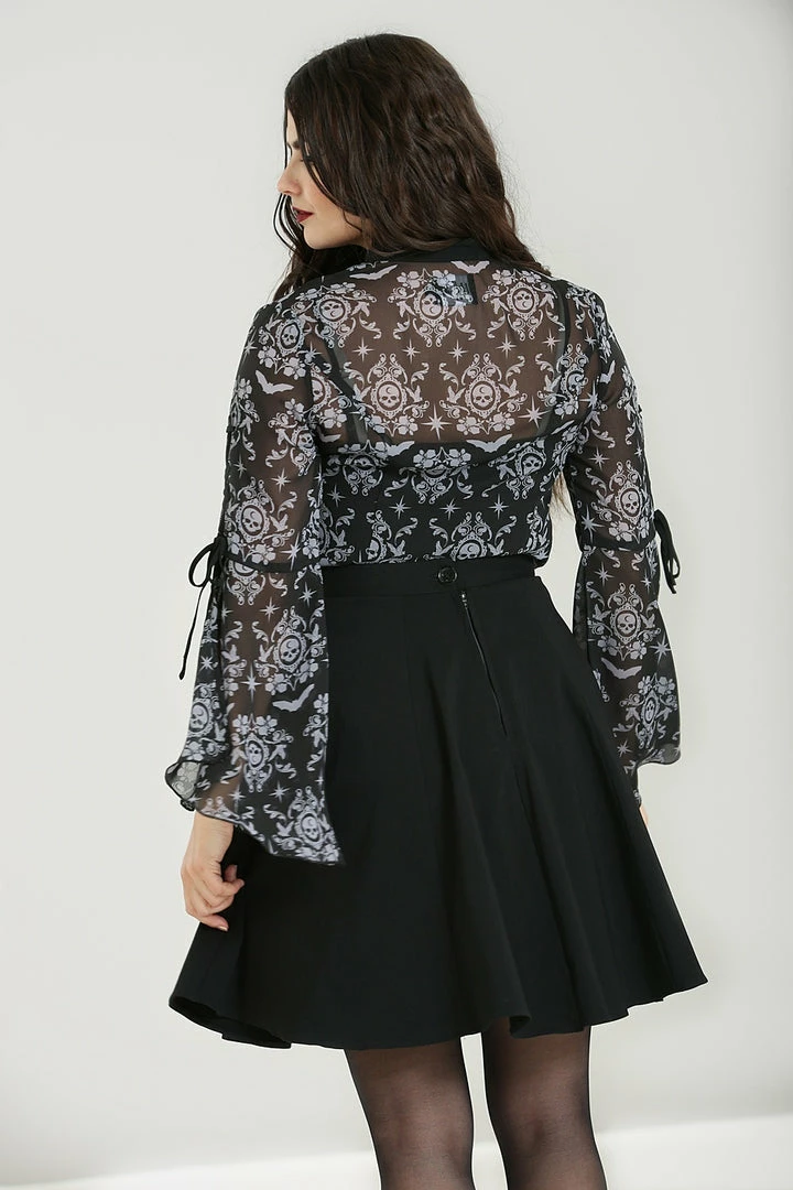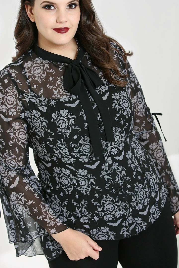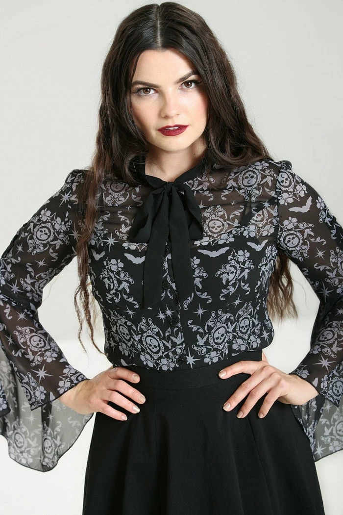 This beautiful printed chiffon blouse whispers as it moves! Black semi-fitted chiffon blouse with a timeless gothic ornate artwork in grey with black buttons to fasten. It features a black contrasting neck tie and dramatic flared sleeves with black lace up detailing which moves with the slightest of breeze. The length reaches the middle of the hips, so can be worn tucked in or out. Please note: this style is see-through so wear over a bralet or cami.