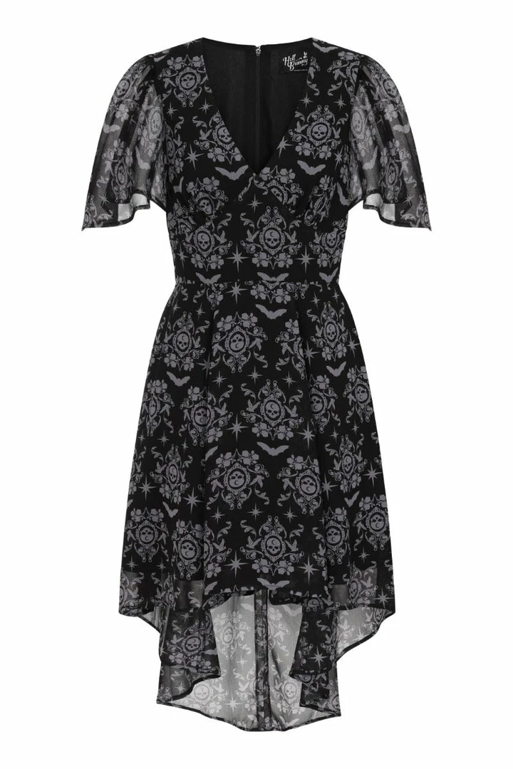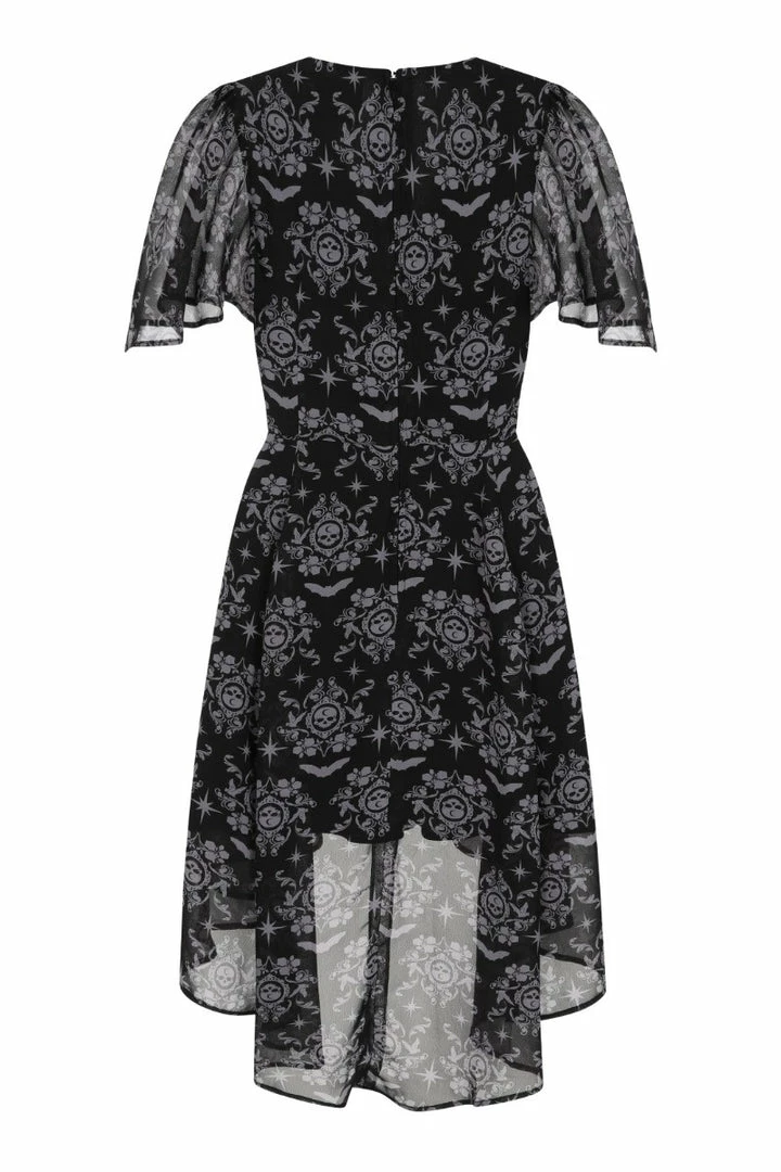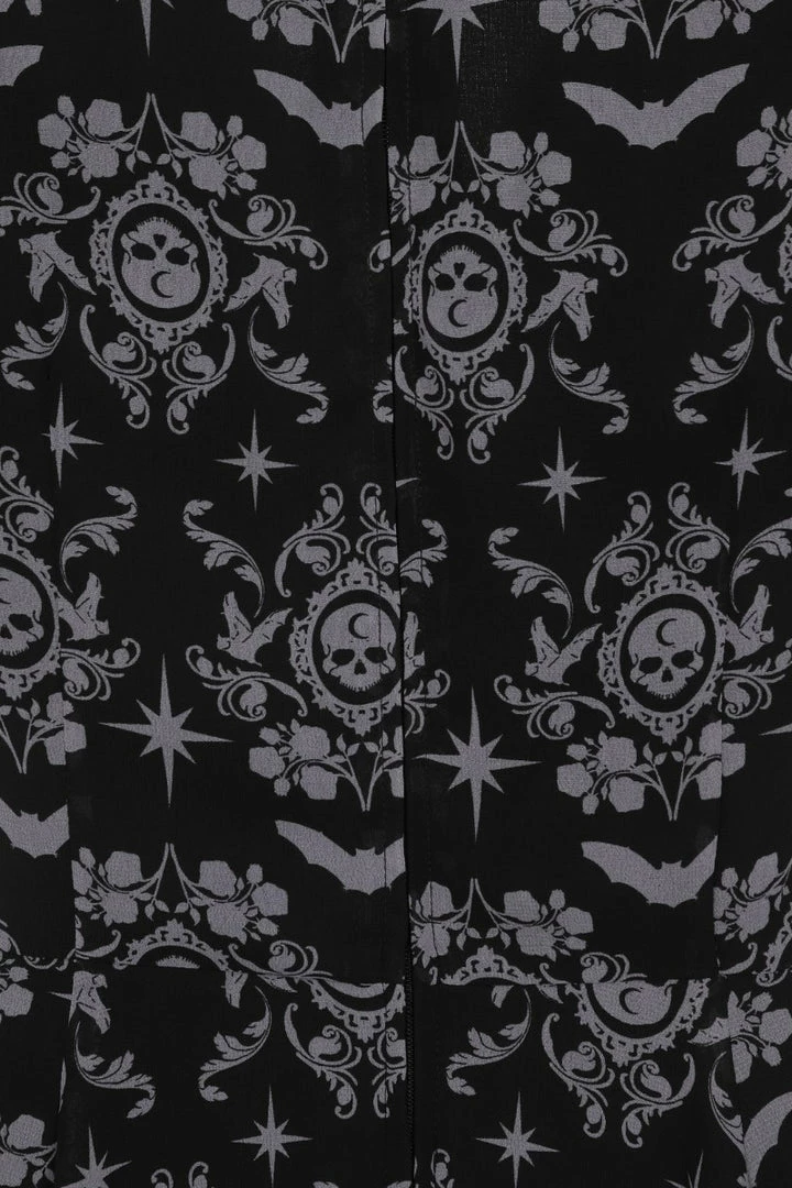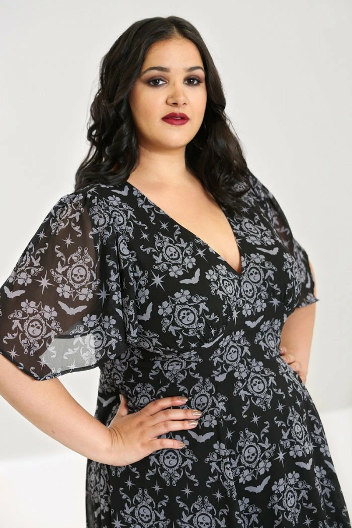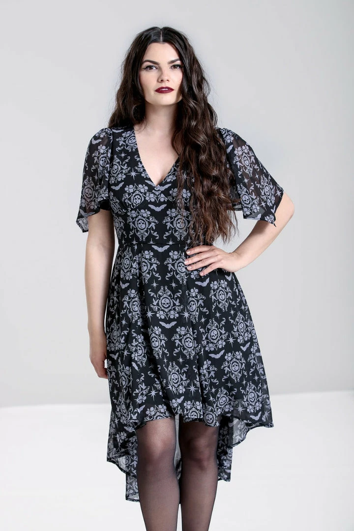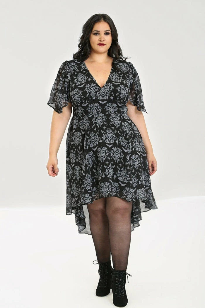 This beautiful printed chiffon dress whispers as it moves! With its asymmetrical hem, short at the front, longer at the back and draped sleeves to add a little more drama, it moves with the slightest of breeze. It features a timeless gothic ornate artwork in grey on a black background with flattering V neckline and zip in the centre back to fasten. The dress has a black jersey lining attached.