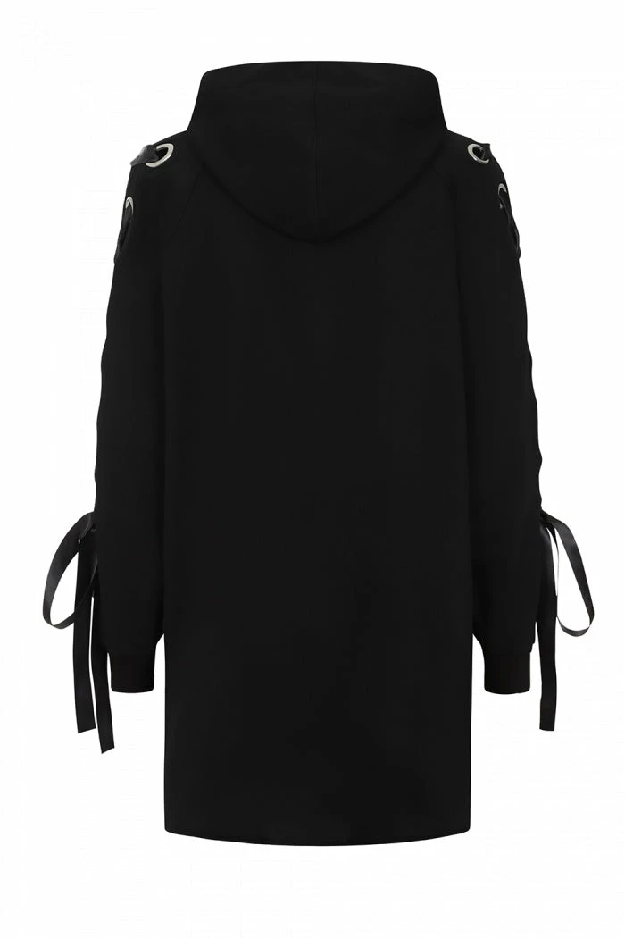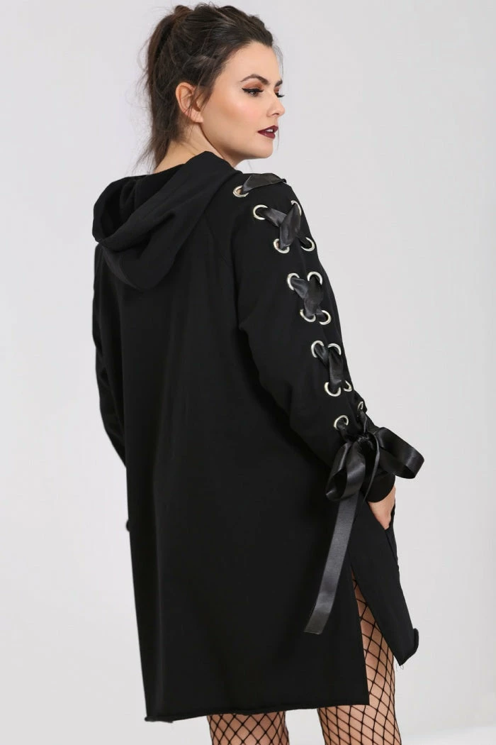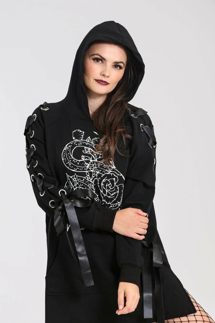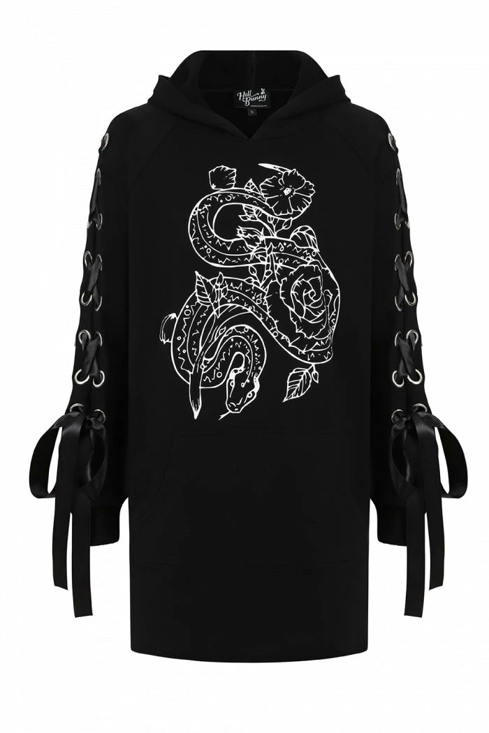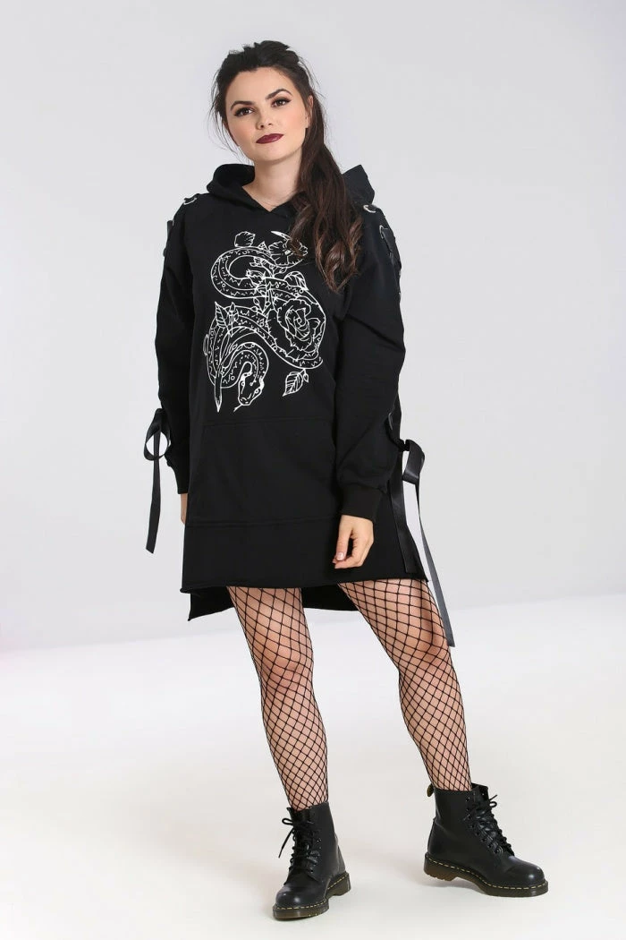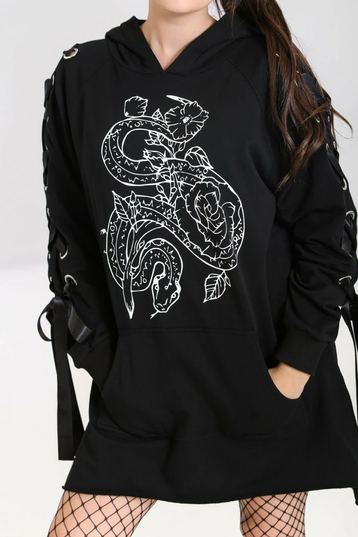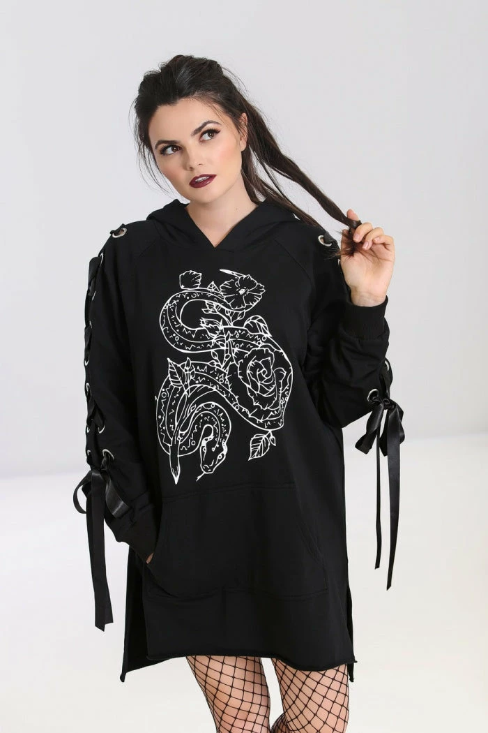 Amazing black loungewear dress from Hell Bunny. The Medusa dress features an oversized hood and large white contrast snake and flowers print, long sleeves with ribbed cuffs and a large front pocket! Perfect for lounging, this dress is made from a super soft and cosy thick cotton jersey with an extra snuggly brushed finish! It also features a raw cut hem, side splits and large silver eyelet and lace details on the arms for added visual impact!