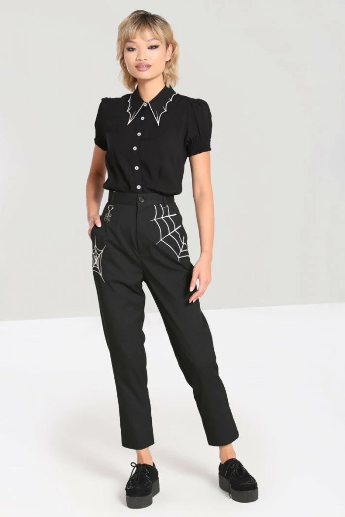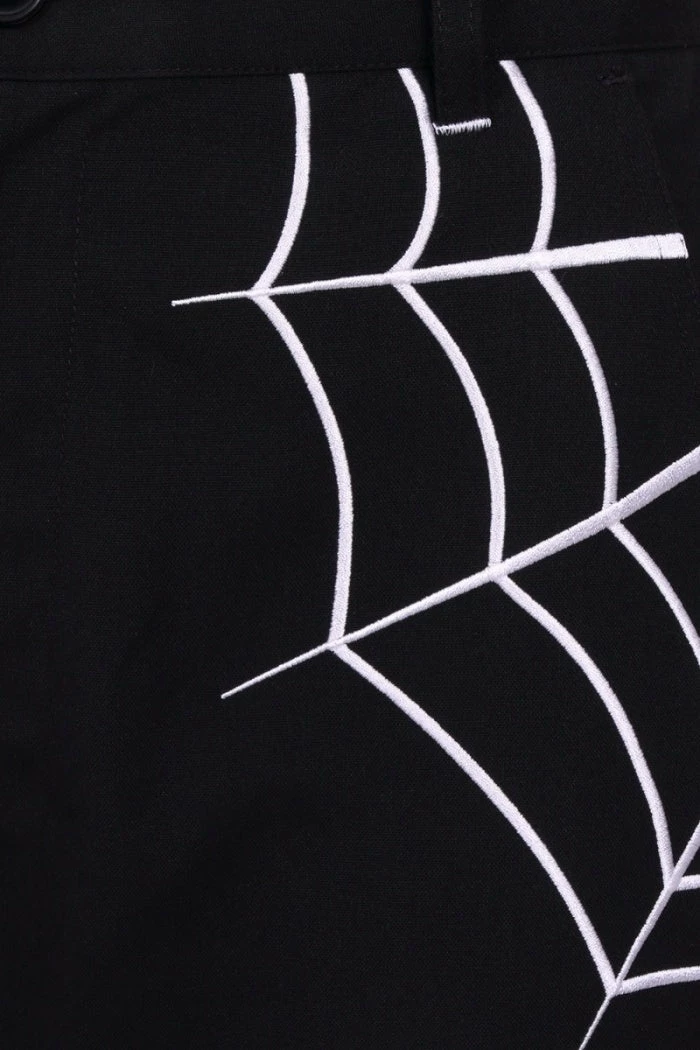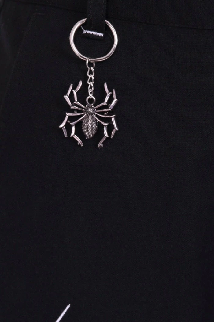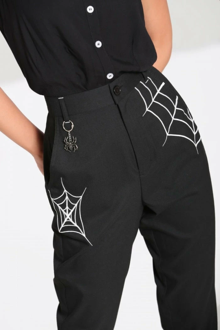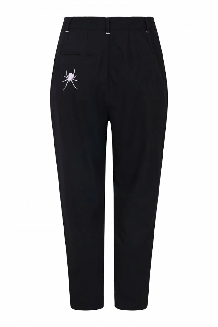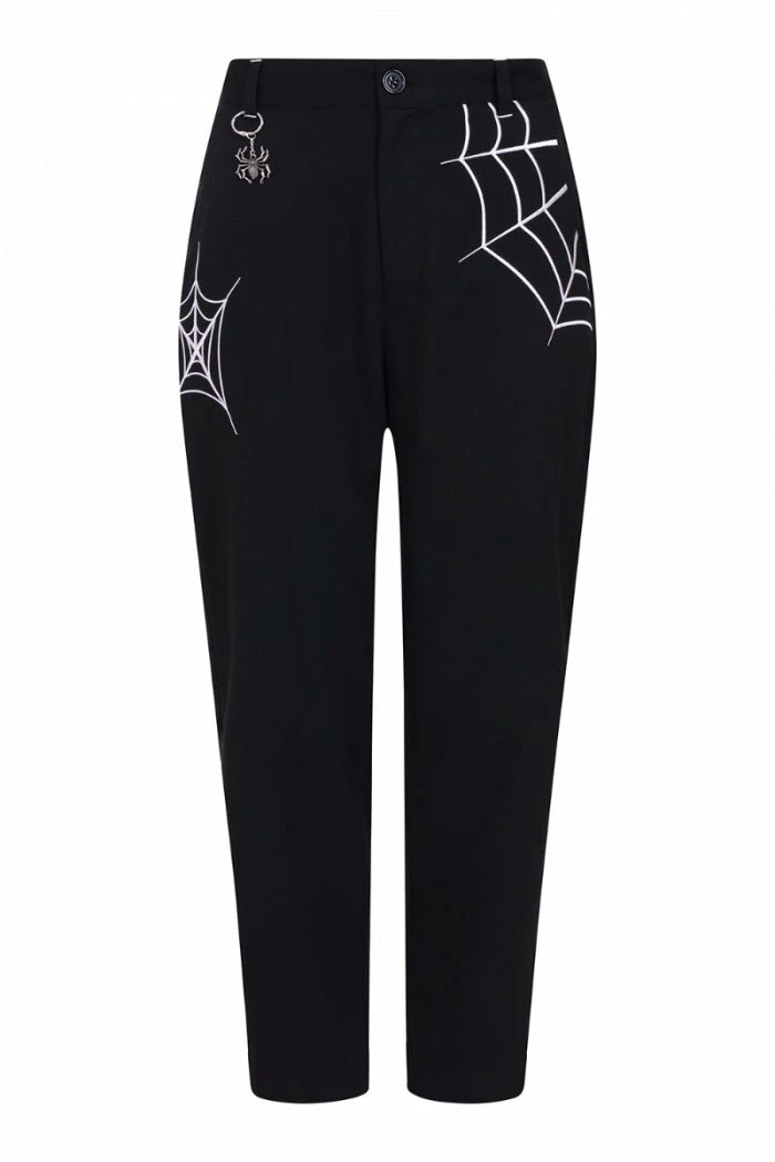Stylish and versatile black cropped trousers from Hell Bunny with white contrast spider and spiderweb embroidery detailing. These must-have cropped trousers feature belt loops, 2 front pockets and a back pocket and have a tapered leg shape. These awesome black trousers also feature a removable metal spider charm chain and are made from a slight stretch fabric with button and zip fastening .