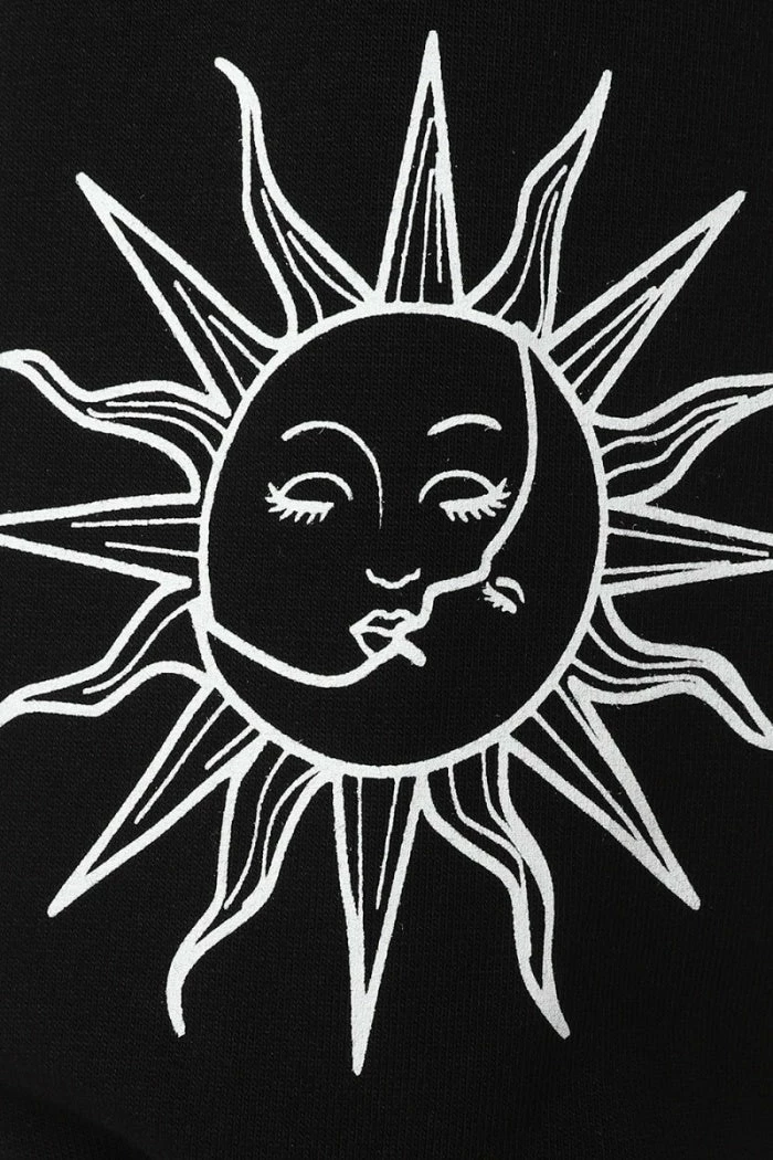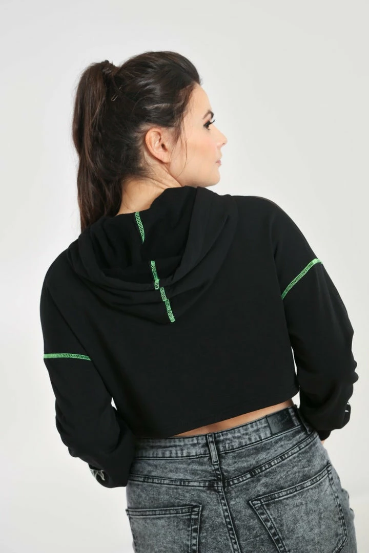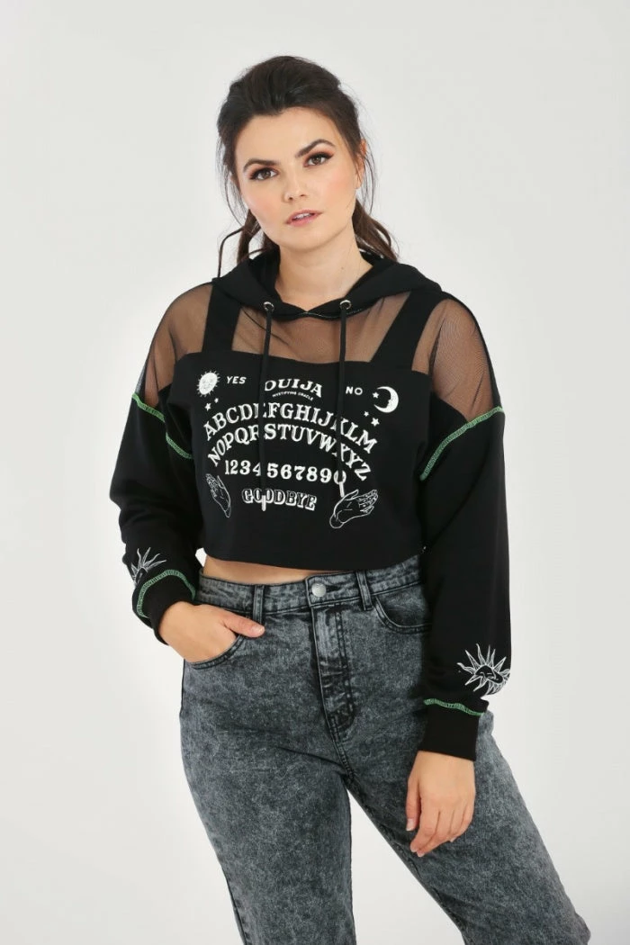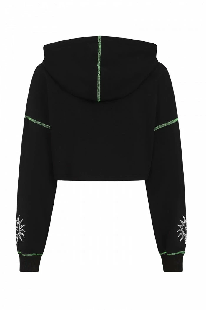 Awesome black loungewear cropped hoodie from Hell Bunny. The Ouija hoodie features white contrast ouija symbols and contrasting neon green stitching! Perfect for lounging, this hooded top is made from a super soft and cosy thick brushed cotton jersey and also features mesh detailing across the chest, and hood with drawstring and ribbed sleeve cuffs! Matches perfectly with the Ouija joggers!