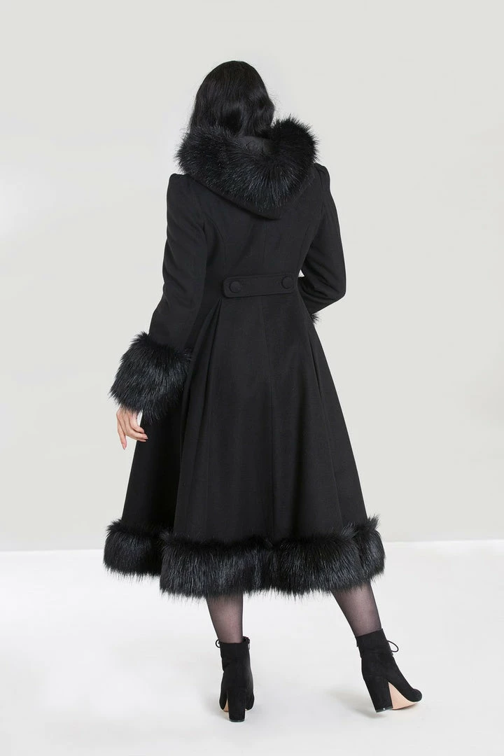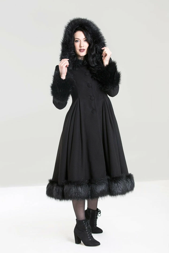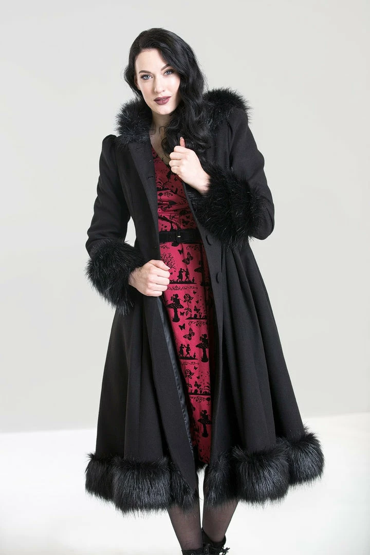 Stunning fit and flare coat from Hell Bunny featuring faux fur trim to the hood, cuffs and hemline. With slightly puffed sleeves, fabric covered buttons and side seam pockets, you’ll be warm and stylish in this fully lined coat. Full length in a 3XL is approximately 115cm.