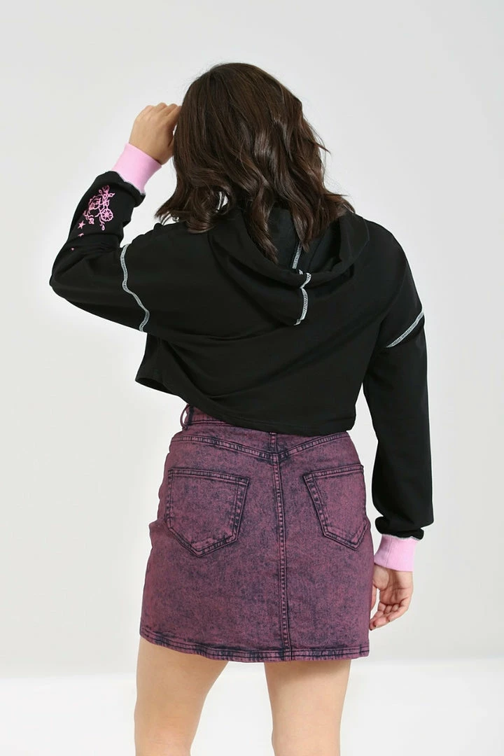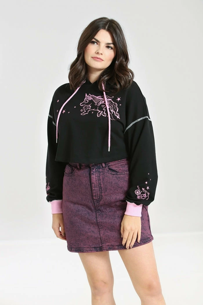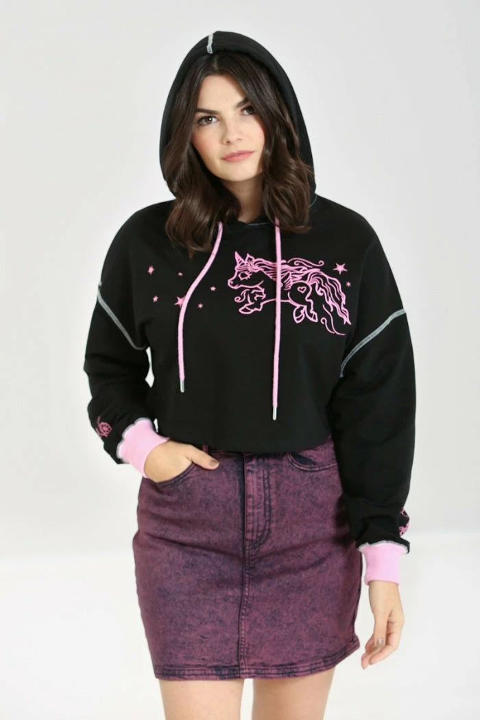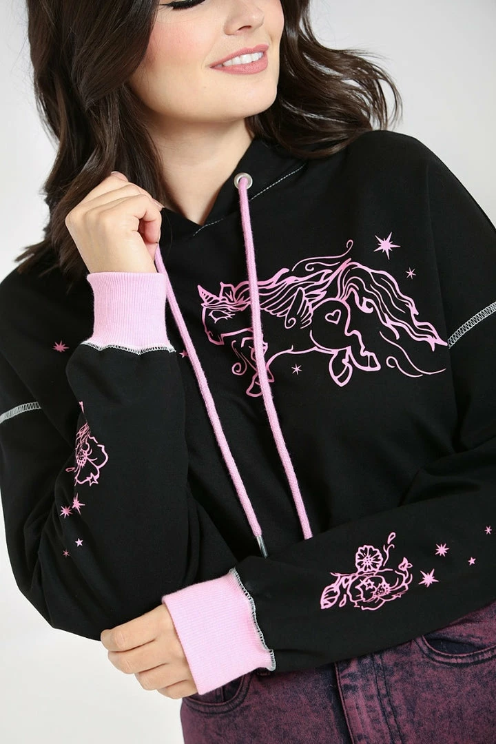 Cosy and stylish black cropped hoodie with contrast pink unicorn print from Hell Bunny. This comfy relaxed loose fit pullover is made from a soft cotton blend fabric that you’ll love to lounge in. It features a pink drawstring and pink ribbed cuffs as well as contrast white stitching on the sleeves.