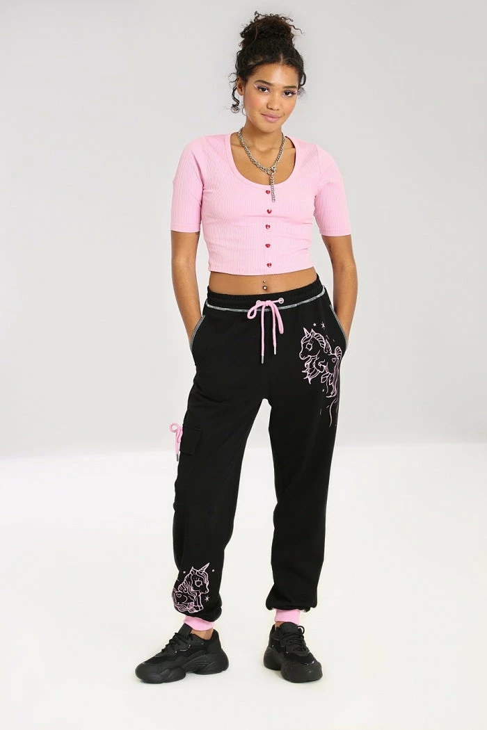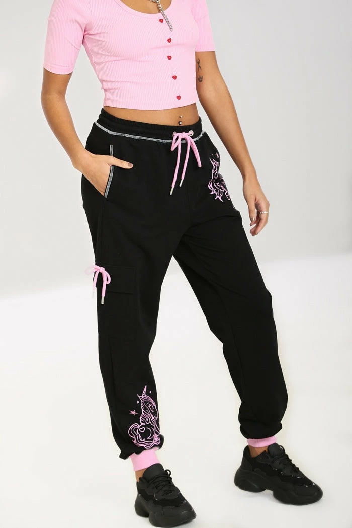 Versatile and stylish black jogging bottoms with contrast pink unicorn print on the front of one leg from Hell Bunny. These comfy tracksuit bottoms are made from a soft stretchy jersey fabric that you’ll love to lounge in. They feature ribbed leg cuffs, side pockets and an elasticated waistband with tie for the perfect fit.