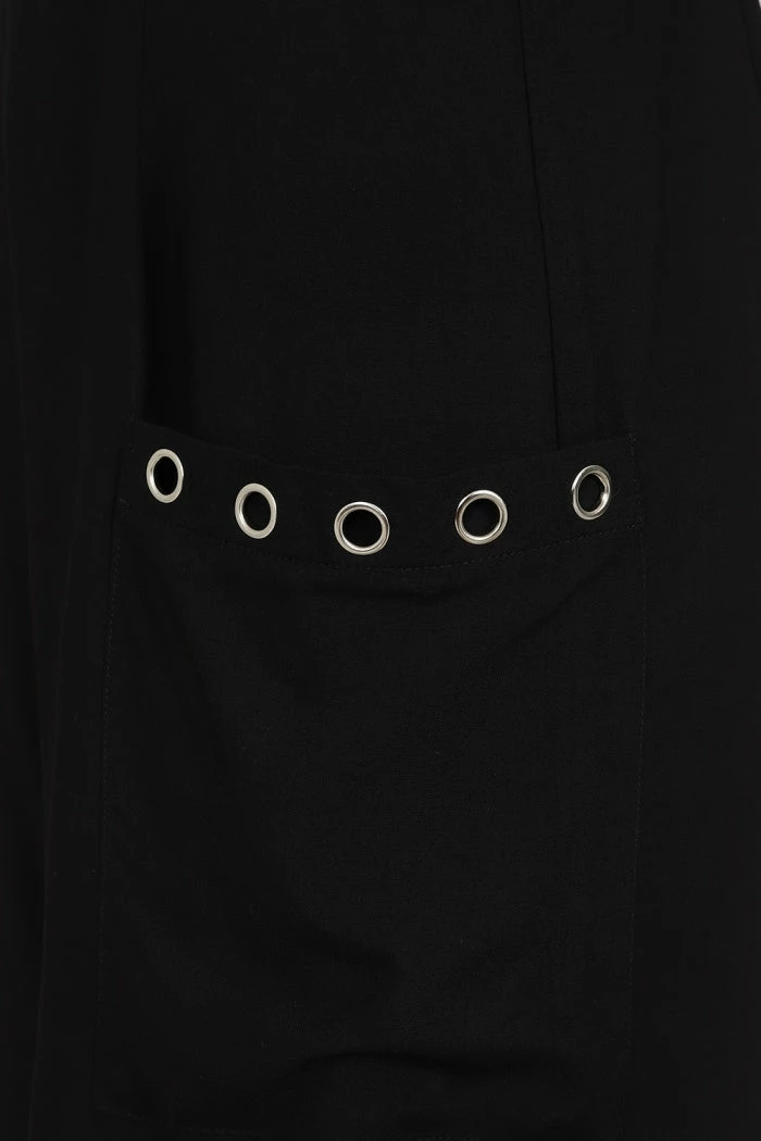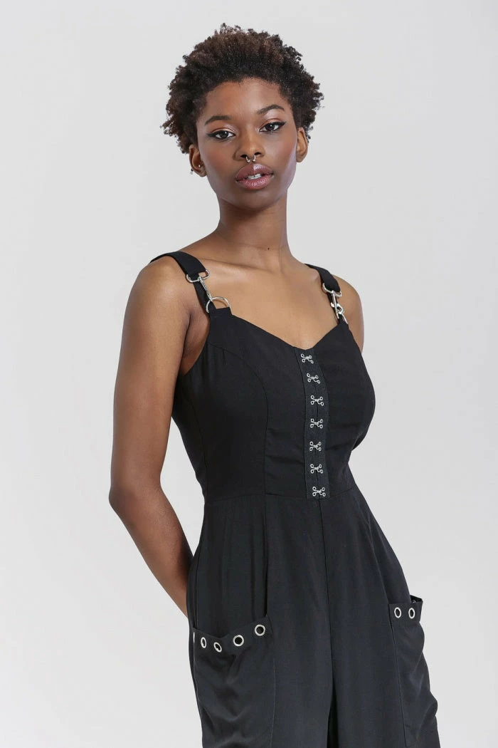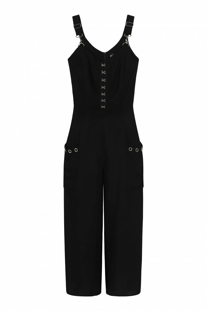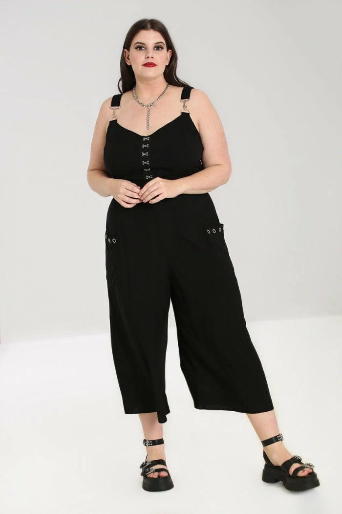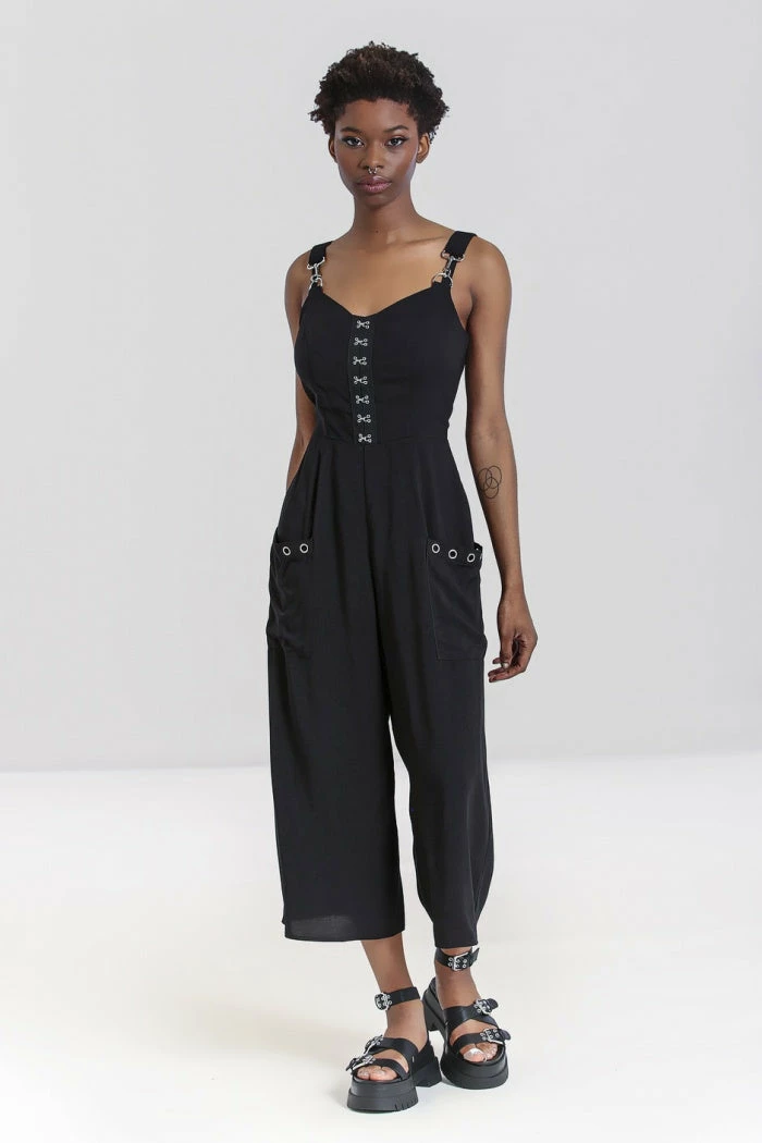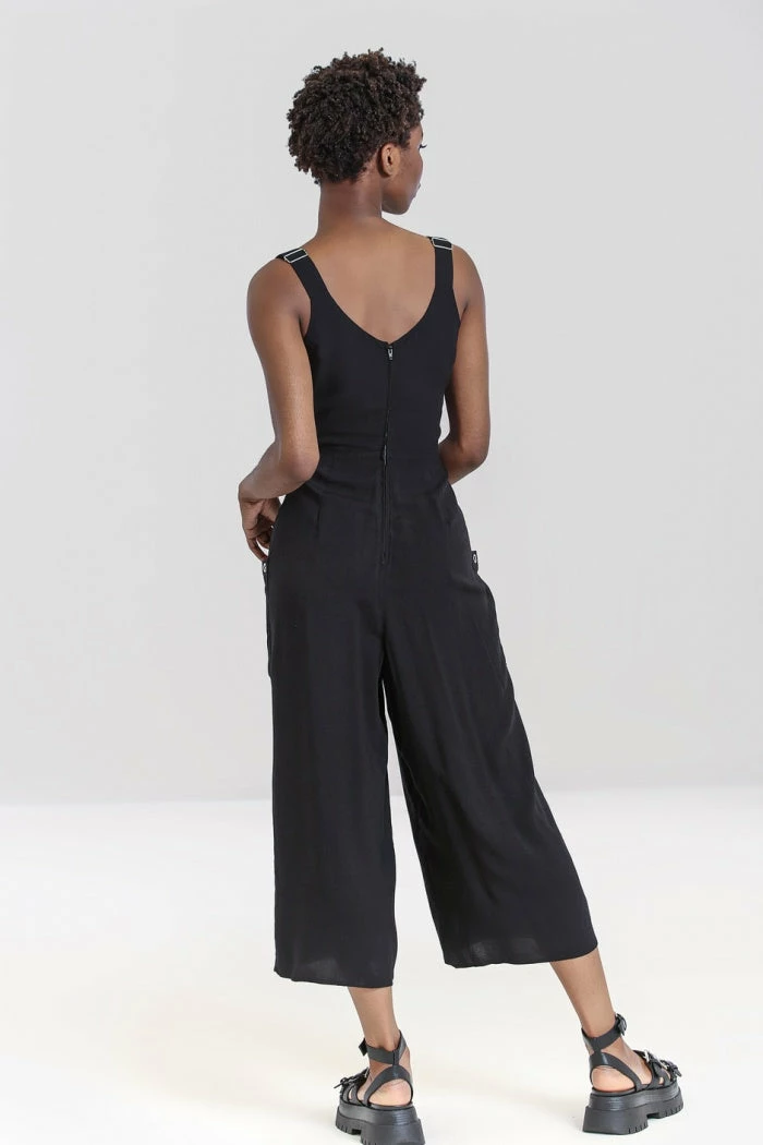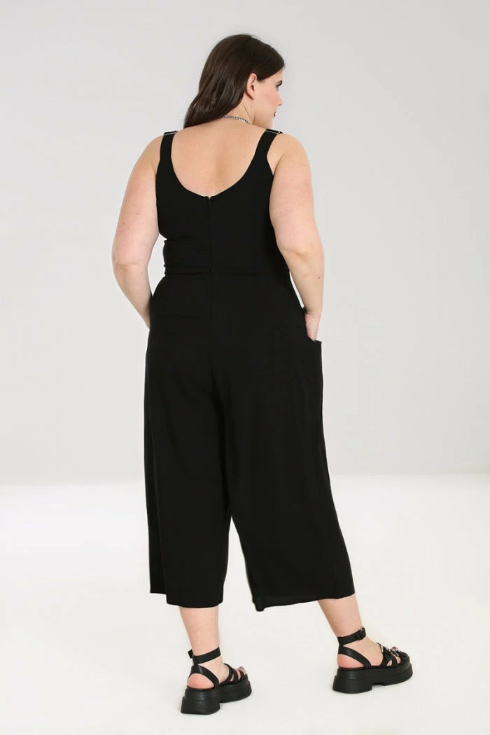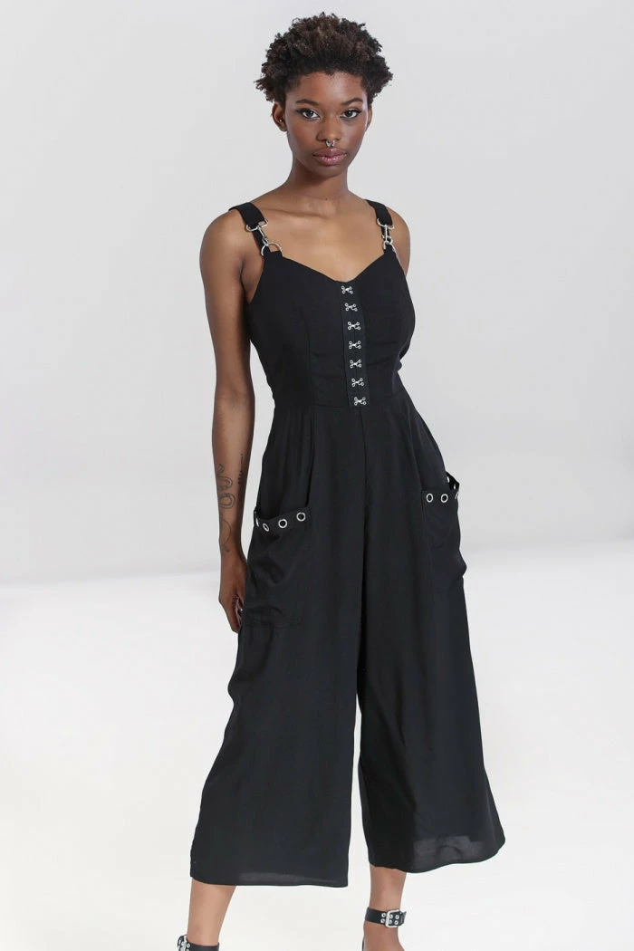 Stunning black sleeveless jumpsuit with silver hook and eye detailing from Hell Bunny. This awesome jumpsuit features 2 large front pockets, adjustable shoulder straps and a zip up back. This lovely jumpsuit is fitted at the waist and then flares out into mid calf length trouser legs. It looks great dressed up or down!