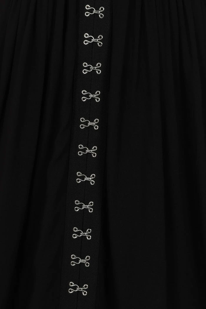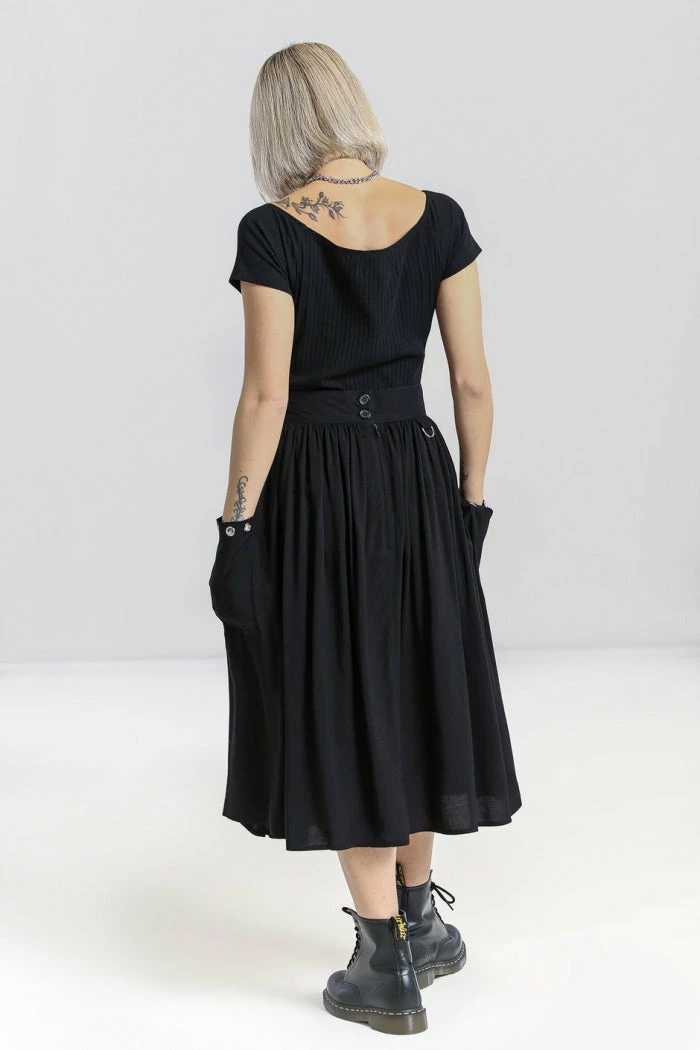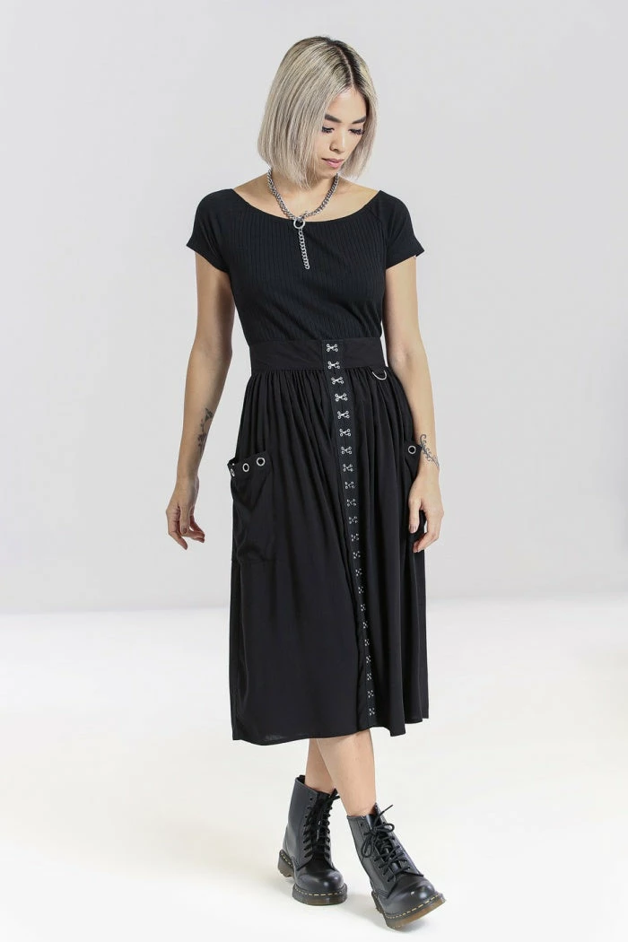 Lovely black midi skirt from Hell Bunny with stunning silver hook and eye detailing down centre of skirt. This versatile and stylish flared skirt has a wide waistband and fastens with a zip and button at the back. It also features a stunning silver D ring detail and 2 large front pockets with eyelet details. Looks perfect and flatters your figure whether you dress it up or down!