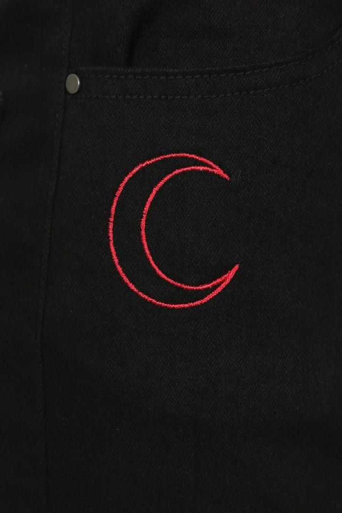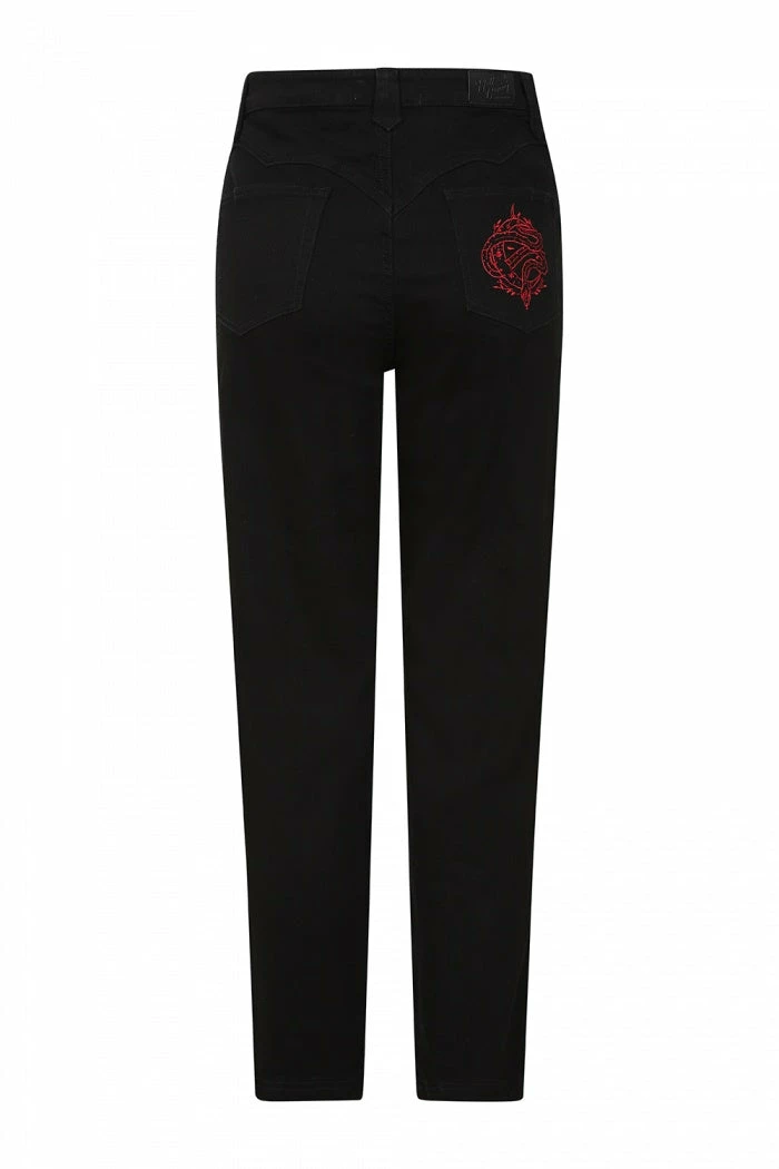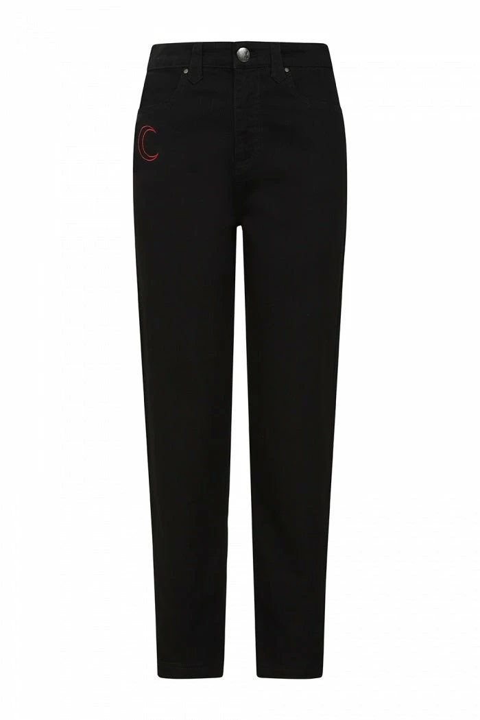 Stylish and versatile black jeans from Hell Bunny with red contrast moon and snake embroidery detailing. These must-have denim jeans feature belt loops, 2 front pockets and back pockets and have a tapered leg shape. These awesome black trousers are made from a slight stretch cotton fabric with metal button and zip fastening .